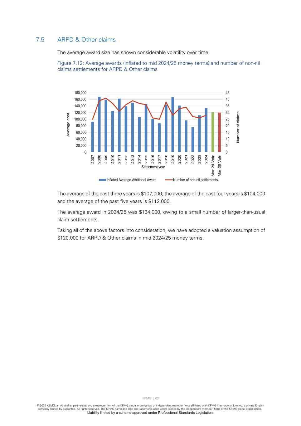 KPMG | 63 © 2025 KPMG, an Australian partnership and a member firm of the KPMG global organisation of independent member firms affiliated with KPMG International Limited, a private English company limited by guarantee. All rights reserved. The KPMG name and logo are trademarks used under license by the independent member firms of the KPMG global organisation. Liability limited by a scheme approved under Professional Standards Legislation. 7.5 ARPD & Other claims The average award size has shown considerable volatility over time. Figure 7.12: Average awards (inflated to mid 2024/25 money terms) and number of non-nil claims settlements for ARPD & Other claims The average of the past three years is $107,000; the average of the past four years is $104,000 and the average of the past five years is $112,000. The average award in 2024/25 was $134,000, owing to a small number of larger-than-usual claim settlements. Taking all of the above factors into consideration, we have adopted a valuation assumption of $120,000 for ARPD & Other claims in mid 2024/25 money terms. 0 5 10 15 20 25 30 35 40 45 0 20,000 40,000 60,000 80,000 100,000 120,000 140,000 160,000 180,000 20 07 20 08 20 09 20 10 20 11 20 12 20 13 20 14 20 15 20 16 20 17 20 18 20 19 20 20 20 21 20 22 20 23 20 24 M ar 2 4 V al n M ar 2 5 V al n N um be r of c la im s A ve ra ge c os t Settlement year Inflated Average Attritional Award Number of non-nil settlements