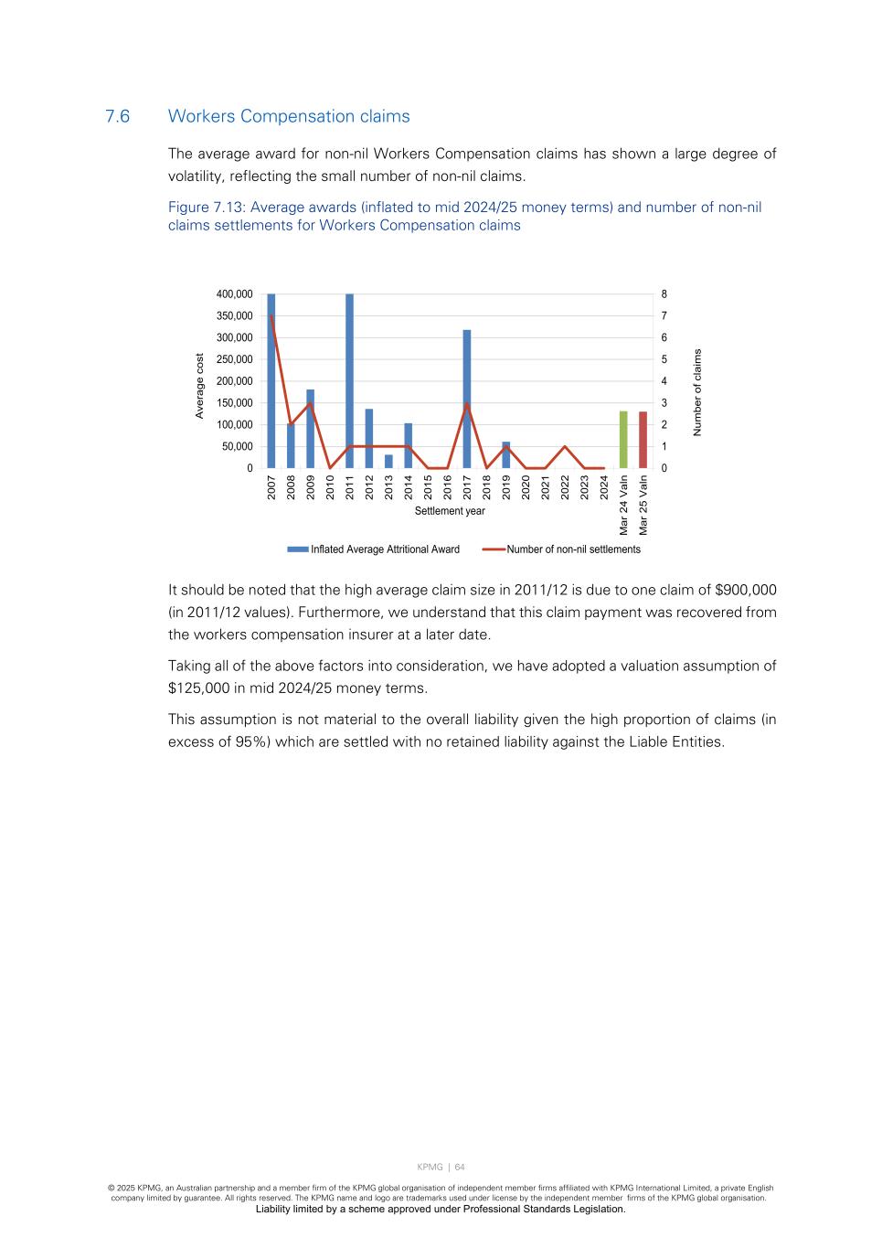 KPMG | 64 © 2025 KPMG, an Australian partnership and a member firm of the KPMG global organisation of independent member firms affiliated with KPMG International Limited, a private English company limited by guarantee. All rights reserved. The KPMG name and logo are trademarks used under license by the independent member firms of the KPMG global organisation. Liability limited by a scheme approved under Professional Standards Legislation. 7.6 Workers Compensation claims The average award for non-nil Workers Compensation claims has shown a large degree of volatility, reflecting the small number of non-nil claims. Figure 7.13: Average awards (inflated to mid 2024/25 money terms) and number of non-nil claims settlements for Workers Compensation claims It should be noted that the high average claim size in 2011/12 is due to one claim of $900,000 (in 2011/12 values). Furthermore, we understand that this claim payment was recovered from the workers compensation insurer at a later date. Taking all of the above factors into consideration, we have adopted a valuation assumption of $125,000 in mid 2024/25 money terms. This assumption is not material to the overall liability given the high proportion of claims (in excess of 95%) which are settled with no retained liability against the Liable Entities. 0 1 2 3 4 5 6 7 8 0 50,000 100,000 150,000 200,000 250,000 300,000 350,000 400,000 20 07 20 08 20 09 20 10 20 11 20 12 20 13 20 14 20 15 20 16 20 17 20 18 20 19 20 20 20 21 20 22 20 23 20 24 M ar 2 4 V al n M ar 2 5 V al n N um be r o f c la im s A ve ra ge c os t Settlement year Inflated Average Attritional Award Number of non-nil settlements