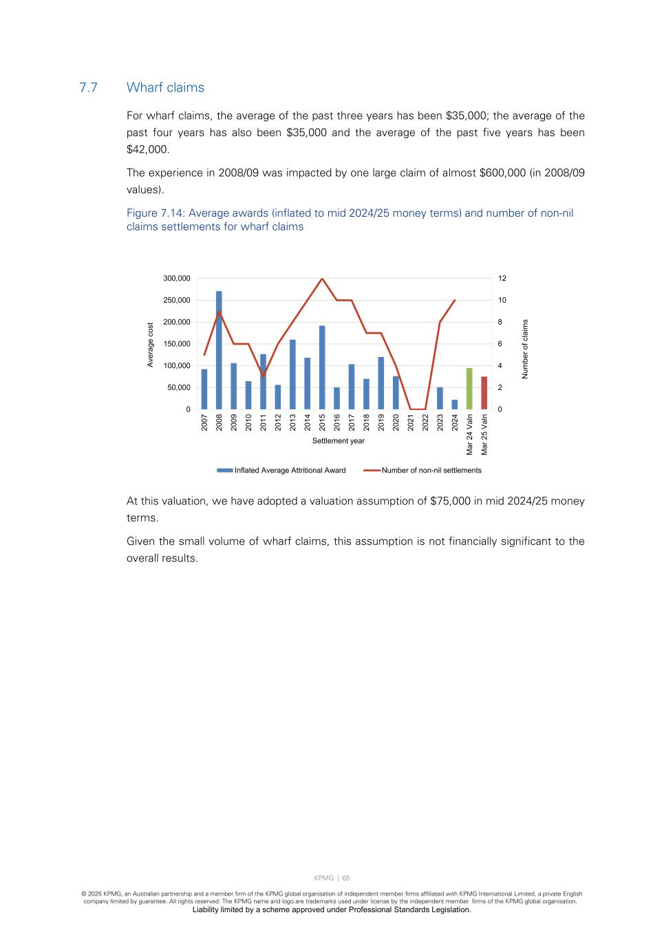 KPMG | 65 © 2025 KPMG, an Australian partnership and a member firm of the KPMG global organisation of independent member firms affiliated with KPMG International Limited, a private English company limited by guarantee. All rights reserved. The KPMG name and logo are trademarks used under license by the independent member firms of the KPMG global organisation. Liability limited by a scheme approved under Professional Standards Legislation. 7.7 Wharf claims For wharf claims, the average of the past three years has been $35,000; the average of the past four years has also been $35,000 and the average of the past five years has been $42,000. The experience in 2008/09 was impacted by one large claim of almost $600,000 (in 2008/09 values). Figure 7.14: Average awards (inflated to mid 2024/25 money terms) and number of non-nil claims settlements for wharf claims At this valuation, we have adopted a valuation assumption of $75,000 in mid 2024/25 money terms. Given the small volume of wharf claims, this assumption is not financially significant to the overall results. 0 2 4 6 8 10 12 0 50,000 100,000 150,000 200,000 250,000 300,000 20 07 20 08 20 09 20 10 20 11 20 12 20 13 20 14 20 15 20 16 20 17 20 18 20 19 20 20 20 21 20 22 20 23 20 24 M ar 2 4 Va ln M ar 2 5 Va ln N um be r o f c la im s Av er ag e co st Settlement year Inflated Average Attritional Award Number of non-nil settlements