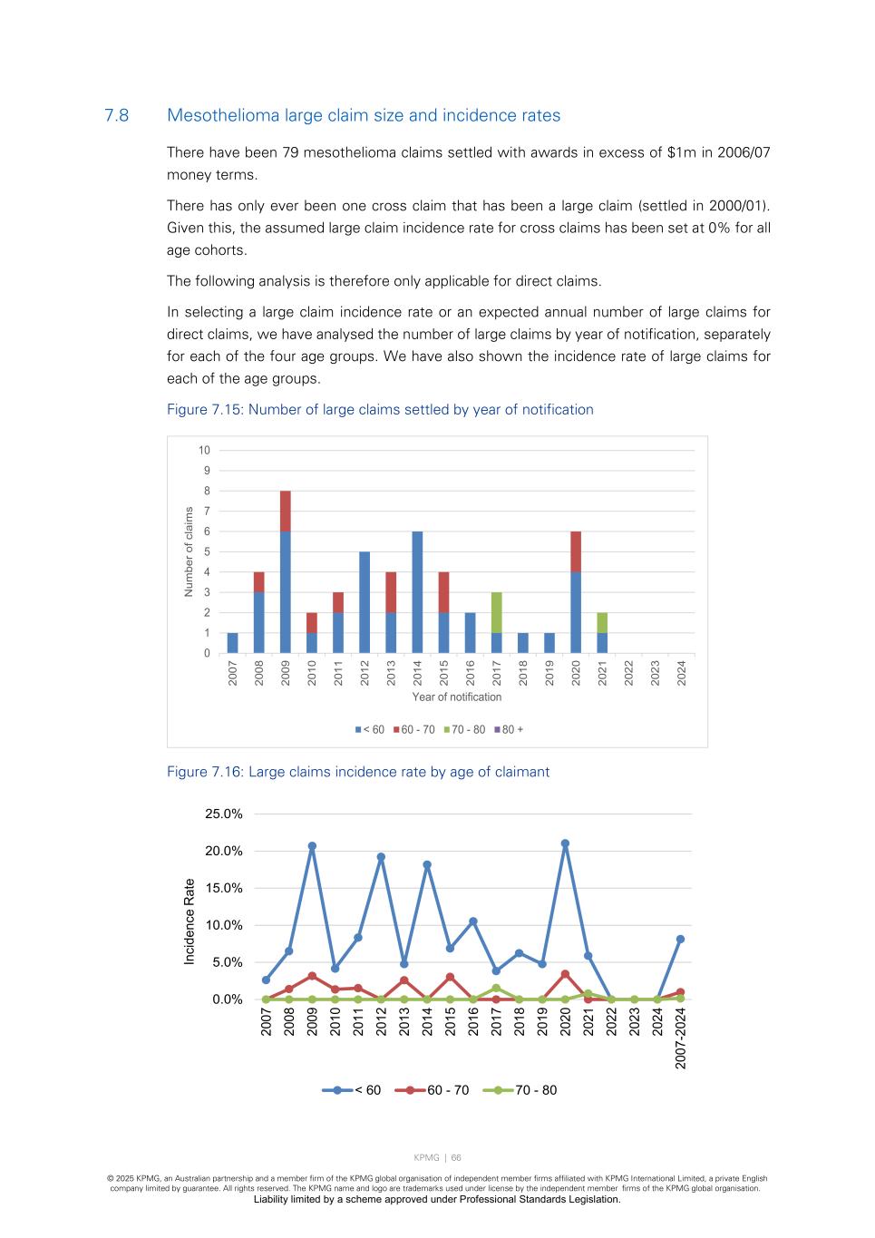 KPMG | 66 © 2025 KPMG, an Australian partnership and a member firm of the KPMG global organisation of independent member firms affiliated with KPMG International Limited, a private English company limited by guarantee. All rights reserved. The KPMG name and logo are trademarks used under license by the independent member firms of the KPMG global organisation. Liability limited by a scheme approved under Professional Standards Legislation. 7.8 Mesothelioma large claim size and incidence rates There have been 79 mesothelioma claims settled with awards in excess of $1m in 2006/07 money terms. There has only ever been one cross claim that has been a large claim (settled in 2000/01). Given this, the assumed large claim incidence rate for cross claims has been set at 0% for all age cohorts. The following analysis is therefore only applicable for direct claims. In selecting a large claim incidence rate or an expected annual number of large claims for direct claims, we have analysed the number of large claims by year of notification, separately for each of the four age groups. We have also shown the incidence rate of large claims for each of the age groups. Figure 7.15: Number of large claims settled by year of notification Figure 7.16: Large claims incidence rate by age of claimant 0 1 2 3 4 5 6 7 8 9 10 20 07 20 08 20 09 20 10 20 11 20 12 20 13 20 14 20 15 20 16 20 17 20 18 20 19 20 20 20 21 20 22 20 23 20 24 N um be r o f c la im s Year of notification < 60 60 - 70 70 - 80 80 + 0.0% 5.0% 10.0% 15.0% 20.0% 25.0% 20 07 20 08 20 09 20 10 20 11 20 12 20 13 20 14 20 15 20 16 20 17 20 18 20 19 20 20 20 21 20 22 20 23 20 24 20 07 -2 02 4 In ci de nc e R at e < 60 60 - 70 70 - 80