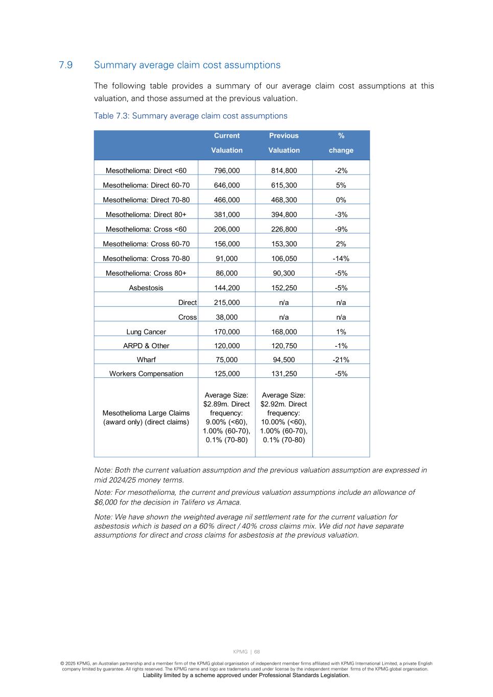 KPMG | 68 © 2025 KPMG, an Australian partnership and a member firm of the KPMG global organisation of independent member firms affiliated with KPMG International Limited, a private English company limited by guarantee. All rights reserved. The KPMG name and logo are trademarks used under license by the independent member firms of the KPMG global organisation. Liability limited by a scheme approved under Professional Standards Legislation. 7.9 Summary average claim cost assumptions The following table provides a summary of our average claim cost assumptions at this valuation, and those assumed at the previous valuation. Table 7.3: Summary average claim cost assumptions Note: Both the current valuation assumption and the previous valuation assumption are expressed in mid 2024/25 money terms. Note: For mesothelioma, the current and previous valuation assumptions include an allowance of $6,000 for the decision in Talifero vs Amaca. Note: We have shown the weighted average nil settlement rate for the current valuation for asbestosis which is based on a 60% direct / 40% cross claims mix. We did not have separate assumptions for direct and cross claims for asbestosis at the previous valuation. Current Previous % Valuation Valuation change Mesothelioma: Direct <60 796,000 814,800 -2% Mesothelioma: Direct 60-70 646,000 615,300 5% Mesothelioma: Direct 70-80 466,000 468,300 0% Mesothelioma: Direct 80+ 381,000 394,800 -3% Mesothelioma: Cross <60 206,000 226,800 -9% Mesothelioma: Cross 60-70 156,000 153,300 2% Mesothelioma: Cross 70-80 91,000 106,050 -14% Mesothelioma: Cross 80+ 86,000 90,300 -5% Asbestosis 144,200 152,250 -5% Direct 215,000 n/a n/a Cross 38,000 n/a n/a Lung Cancer 170,000 168,000 1% ARPD & Other 120,000 120,750 -1% Wharf 75,000 94,500 -21% Workers Compensation 125,000 131,250 -5% Mesothelioma Large Claims (award only) (direct claims) Average Size: $2.89m. Direct frequency: 9.00% (<60), 1.00% (60-70), 0.1% (70-80) Average Size: $2.92m. Direct frequency: 10.00% (<60), 1.00% (60-70), 0.1% (70-80)
