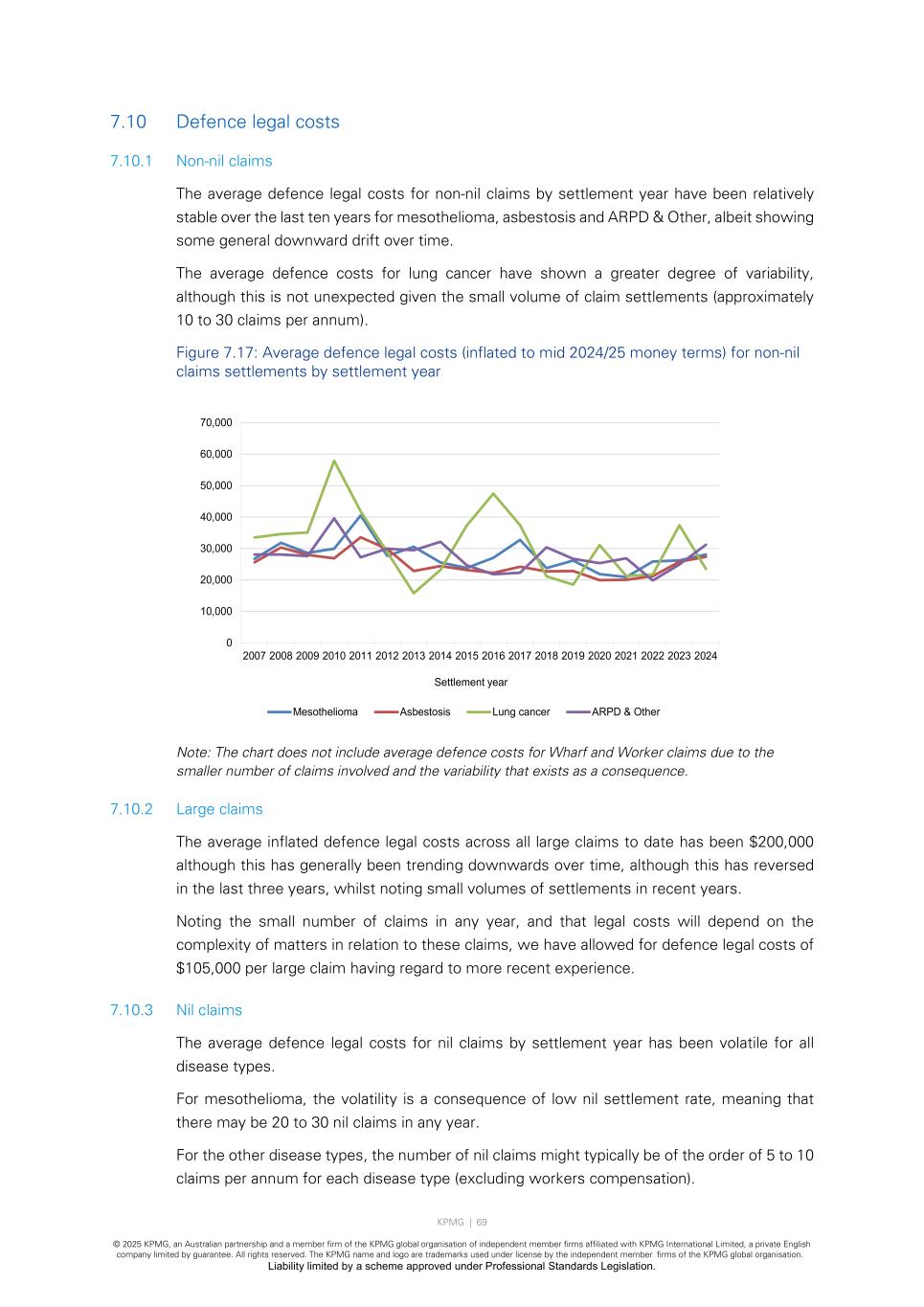 KPMG | 69 © 2025 KPMG, an Australian partnership and a member firm of the KPMG global organisation of independent member firms affiliated with KPMG International Limited, a private English company limited by guarantee. All rights reserved. The KPMG name and logo are trademarks used under license by the independent member firms of the KPMG global organisation. Liability limited by a scheme approved under Professional Standards Legislation. 7.10 Defence legal costs 7.10.1 Non-nil claims The average defence legal costs for non-nil claims by settlement year have been relatively stable over the last ten years for mesothelioma, asbestosis and ARPD & Other, albeit showing some general downward drift over time. The average defence costs for lung cancer have shown a greater degree of variability, although this is not unexpected given the small volume of claim settlements (approximately 10 to 30 claims per annum). Figure 7.17: Average defence legal costs (inflated to mid 2024/25 money terms) for non-nil claims settlements by settlement year Note: The chart does not include average defence costs for Wharf and Worker claims due to the smaller number of claims involved and the variability that exists as a consequence. 7.10.2 Large claims The average inflated defence legal costs across all large claims to date has been $200,000 although this has generally been trending downwards over time, although this has reversed in the last three years, whilst noting small volumes of settlements in recent years. Noting the small number of claims in any year, and that legal costs will depend on the complexity of matters in relation to these claims, we have allowed for defence legal costs of $105,000 per large claim having regard to more recent experience. 7.10.3 Nil claims The average defence legal costs for nil claims by settlement year has been volatile for all disease types. For mesothelioma, the volatility is a consequence of low nil settlement rate, meaning that there may be 20 to 30 nil claims in any year. For the other disease types, the number of nil claims might typically be of the order of 5 to 10 claims per annum for each disease type (excluding workers compensation). 0 10,000 20,000 30,000 40,000 50,000 60,000 70,000 2007 2008 2009 2010 2011 2012 2013 2014 2015 2016 2017 2018 2019 2020 2021 2022 2023 2024 Settlement year Mesothelioma Asbestosis Lung cancer ARPD & Other