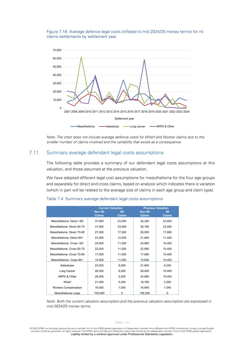 KPMG | 70 © 2025 KPMG, an Australian partnership and a member firm of the KPMG global organisation of independent member firms affiliated with KPMG International Limited, a private English company limited by guarantee. All rights reserved. The KPMG name and logo are trademarks used under license by the independent member firms of the KPMG global organisation. Liability limited by a scheme approved under Professional Standards Legislation. Figure 7.18: Average defence legal costs (inflated to mid 2024/25 money terms) for nil claims settlements by settlement year Note: The chart does not include average defence costs for Wharf and Worker claims due to the smaller number of claims involved and the variability that exists as a consequence. 7.11 Summary average defendant legal costs assumptions The following table provides a summary of our defendant legal costs assumptions at this valuation, and those assumed at the previous valuation. We have adopted different legal cost assumptions for mesothelioma for the four age groups and separately for direct and cross claims, based on analysis which indicates there is variation (which in part will be related to the average size of claims in each age group and claim type). Table 7.4: Summary average defendant legal costs assumptions Note: Both the current valuation assumption and the previous valuation assumption are expressed in mid 2024/25 money terms. 0 10,000 20,000 30,000 40,000 50,000 60,000 70,000 2007 2008 2009 2010 2011 2012 2013 2014 2015 2016 2017 2018 2019 2020 2021 2022 2023 2024 Settlement year Mesothelioma Asbestosis Lung cancer ARPD & Other Current Valuation Previous Valuation Non Nil Nil Non Nil Nil Claims Claims Claims Claims Mesothelioma: Direct <60 37,000 23,000 34,320 23,920 Mesothelioma: Direct 60-70 31,000 23,000 30,160 23,920 Mesothelioma: Direct 70-80 27,000 17,000 26,000 17,680 Mesothelioma: Direct 80+ 23,000 12,000 21,840 11,440 Mesothelioma: Cross <60 24,000 11,000 24,960 10,400 Mesothelioma: Cross 60-70 22,000 11,000 22,880 10,400 Mesothelioma: Cross 70-80 17,000 11,000 17,680 10,400 Mesothelioma: Cross 80+ 15,000 11,000 15,600 10,400 Asbestosis 23,000 6,000 21,840 6,240 Lung Cancer 26,000 6,000 26,000 10,400 ARPD & Other 26,000 5,000 24,960 10,400 Wharf 21,000 5,000 19,760 5,200 Workers Compensation 16,000 1,000 16,640 1,040 Mesothelioma Large 105,000 0 109,200 0