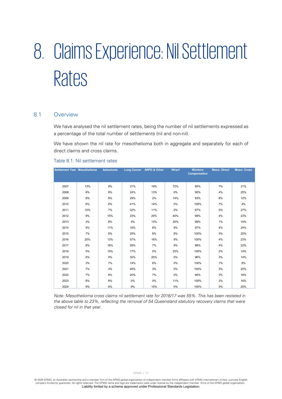 KPMG | 71 © 2025 KPMG, an Australian partnership and a member firm of the KPMG global organisation of independent member firms affiliated with KPMG International Limited, a private English company limited by guarantee. All rights reserved. The KPMG name and logo are trademarks used under license by the independent member firms of the KPMG global organisation. Liability limited by a scheme approved under Professional Standards Legislation. 8. Claims Experience: Nil Settlement Rates 8.1 Overview We have analysed the nil settlement rates, being the number of nil settlements expressed as a percentage of the total number of settlements (nil and non-nil). We have shown the nil rate for mesothelioma both in aggregate and separately for each of direct claims and cross claims. Table 8.1: Nil settlement rates Note: Mesothelioma cross claims nil settlement rate for 2016/17 was 55%. This has been restated in the above table to 23%, reflecting the removal of 54 Queensland statutory recovery claims that were closed for nil in that year. Settlement Year Mesothelioma Asbestosis Lung Cancer ARPD & Other Wharf Workers Compensation Meso: Direct Meso: Cross 2007 13% 9% 31% 19% 72% 85% 7% 31% 2008 8% 9% 24% 13% 0% 95% 4% 25% 2009 8% 8% 29% 2% 14% 83% 8% 12% 2010 6% 6% 41% 14% 0% 100% 7% 4% 2011 10% 7% 32% 11% 0% 67% 5% 27% 2012 9% 15% 23% 20% 40% 99% 4% 23% 2013 3% 8% 3% 13% 20% 99% 1% 10% 2014 9% 11% 16% 8% 9% 97% 4% 24% 2015 7% 6% 25% 8% 8% 100% 3% 20% 2016 20% 13% 57% 16% 9% 100% 4% 23% 2017 8% 16% 59% 7% 9% 88% 4% 22% 2018 5% 15% 17% 5% 22% 100% 2% 14% 2019 6% 9% 32% 20% 0% 96% 3% 14% 2020 3% 7% 14% 6% 0% 100% 1% 8% 2021 7% 3% 45% 3% 0% 100% 3% 20% 2022 7% 8% 20% 7% 0% 95% 3% 16% 2023 6% 8% 0% 0% 11% 100% 3% 16% 2024 9% 6% 9% 15% 0% 100% 5% 20%