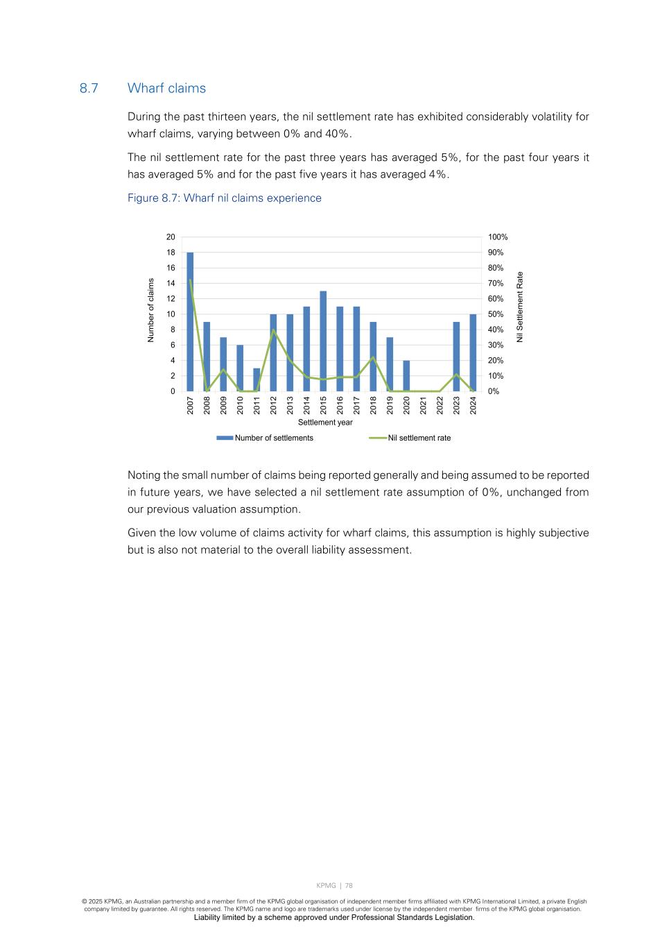 KPMG | 78 © 2025 KPMG, an Australian partnership and a member firm of the KPMG global organisation of independent member firms affiliated with KPMG International Limited, a private English company limited by guarantee. All rights reserved. The KPMG name and logo are trademarks used under license by the independent member firms of the KPMG global organisation. Liability limited by a scheme approved under Professional Standards Legislation. 8.7 Wharf claims During the past thirteen years, the nil settlement rate has exhibited considerably volatility for wharf claims, varying between 0% and 40%. The nil settlement rate for the past three years has averaged 5%, for the past four years it has averaged 5% and for the past five years it has averaged 4%. Figure 8.7: Wharf nil claims experience Noting the small number of claims being reported generally and being assumed to be reported in future years, we have selected a nil settlement rate assumption of 0%, unchanged from our previous valuation assumption. Given the low volume of claims activity for wharf claims, this assumption is highly subjective but is also not material to the overall liability assessment. 0% 10% 20% 30% 40% 50% 60% 70% 80% 90% 100% 0 2 4 6 8 10 12 14 16 18 20 20 07 20 08 20 09 20 10 20 11 20 12 20 13 20 14 20 15 20 16 20 17 20 18 20 19 20 20 20 21 20 22 20 23 20 24 N il S et tle m en t R at e N um be r o f c la im s Settlement year Number of settlements Nil settlement rate