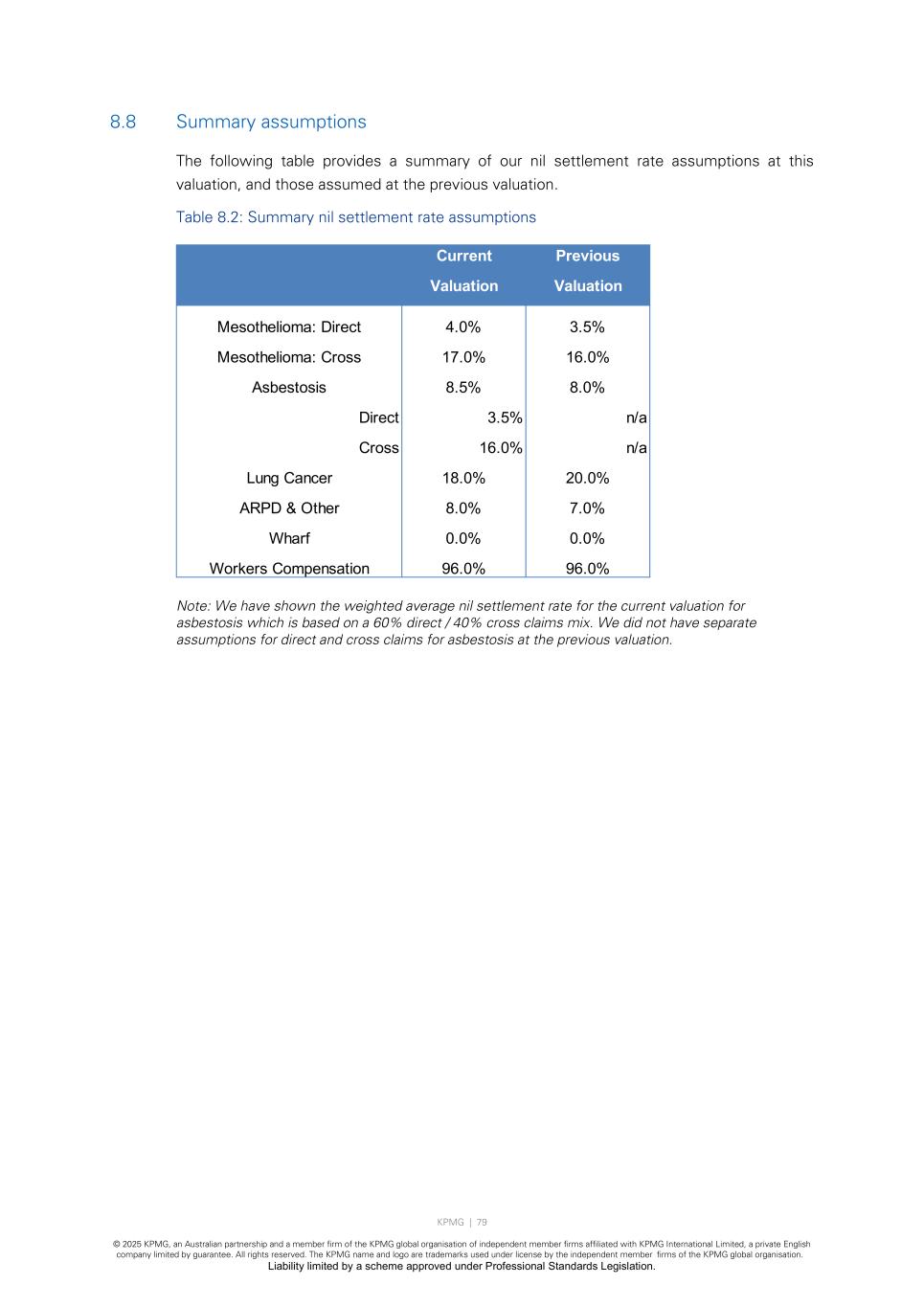 KPMG | 79 © 2025 KPMG, an Australian partnership and a member firm of the KPMG global organisation of independent member firms affiliated with KPMG International Limited, a private English company limited by guarantee. All rights reserved. The KPMG name and logo are trademarks used under license by the independent member firms of the KPMG global organisation. Liability limited by a scheme approved under Professional Standards Legislation. 8.8 Summary assumptions The following table provides a summary of our nil settlement rate assumptions at this valuation, and those assumed at the previous valuation. Table 8.2: Summary nil settlement rate assumptions Note: We have shown the weighted average nil settlement rate for the current valuation for asbestosis which is based on a 60% direct / 40% cross claims mix. We did not have separate assumptions for direct and cross claims for asbestosis at the previous valuation. Current Previous Valuation Valuation Mesothelioma: Direct 4.0% 3.5% Mesothelioma: Cross 17.0% 16.0% Asbestosis 8.5% 8.0% Direct 3.5% n/a Cross 16.0% n/a Lung Cancer 18.0% 20.0% ARPD & Other 8.0% 7.0% Wharf 0.0% 0.0% Workers Compensation 96.0% 96.0%