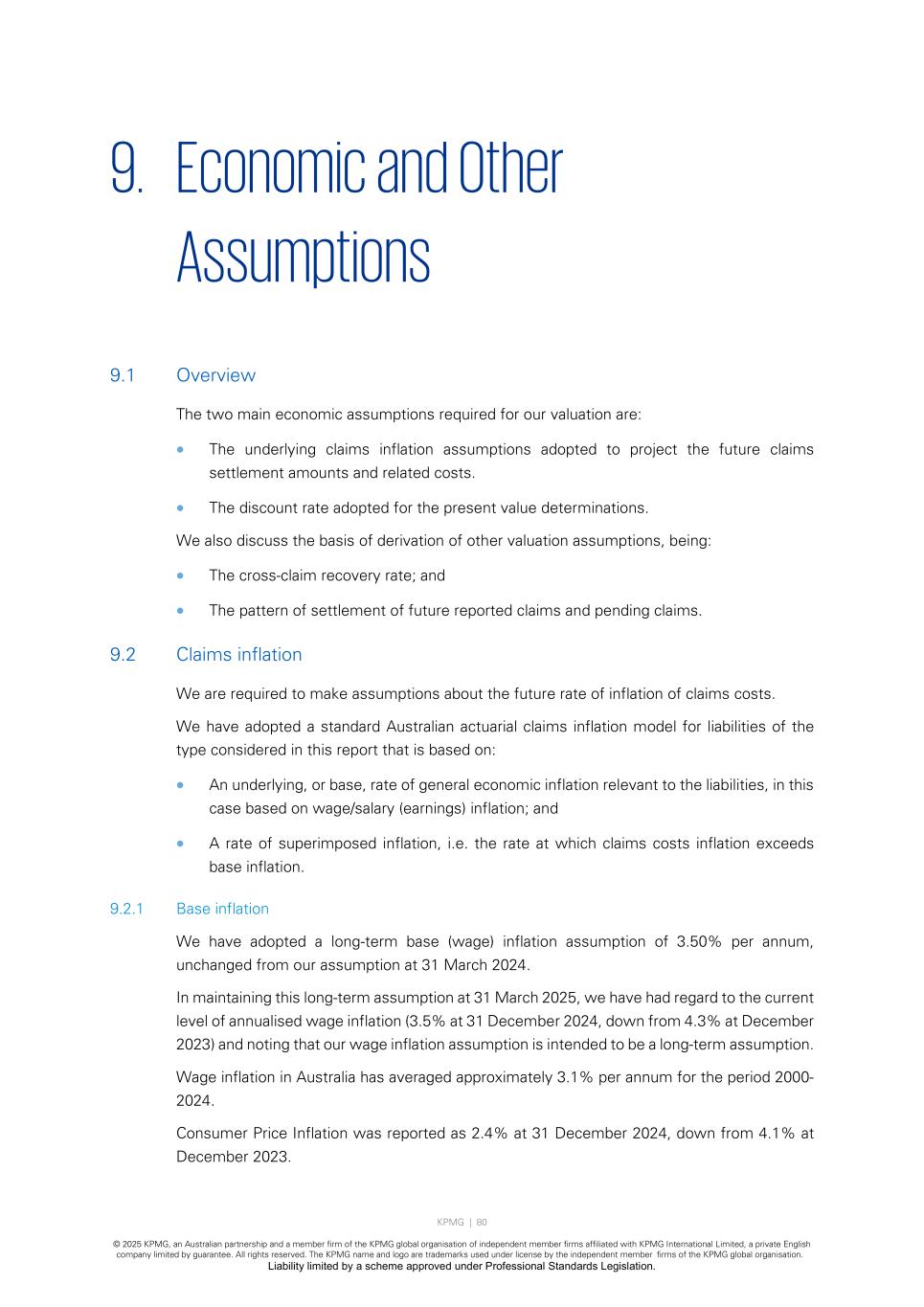 KPMG | 80 © 2025 KPMG, an Australian partnership and a member firm of the KPMG global organisation of independent member firms affiliated with KPMG International Limited, a private English company limited by guarantee. All rights reserved. The KPMG name and logo are trademarks used under license by the independent member firms of the KPMG global organisation. Liability limited by a scheme approved under Professional Standards Legislation. 9. Economic and Other Assumptions 9.1 Overview The two main economic assumptions required for our valuation are: • The underlying claims inflation assumptions adopted to project the future claims settlement amounts and related costs. • The discount rate adopted for the present value determinations. We also discuss the basis of derivation of other valuation assumptions, being: • The cross-claim recovery rate; and • The pattern of settlement of future reported claims and pending claims. 9.2 Claims inflation We are required to make assumptions about the future rate of inflation of claims costs. We have adopted a standard Australian actuarial claims inflation model for liabilities of the type considered in this report that is based on: • An underlying, or base, rate of general economic inflation relevant to the liabilities, in this case based on wage/salary (earnings) inflation; and • A rate of superimposed inflation, i.e. the rate at which claims costs inflation exceeds base inflation. 9.2.1 Base inflation We have adopted a long-term base (wage) inflation assumption of 3.50% per annum, unchanged from our assumption at 31 March 2024. In maintaining this long-term assumption at 31 March 2025, we have had regard to the current level of annualised wage inflation (3.5% at 31 December 2024, down from 4.3% at December 2023) and noting that our wage inflation assumption is intended to be a long-term assumption. Wage inflation in Australia has averaged approximately 3.1% per annum for the period 2000- 2024. Consumer Price Inflation was reported as 2.4% at 31 December 2024, down from 4.1% at December 2023.