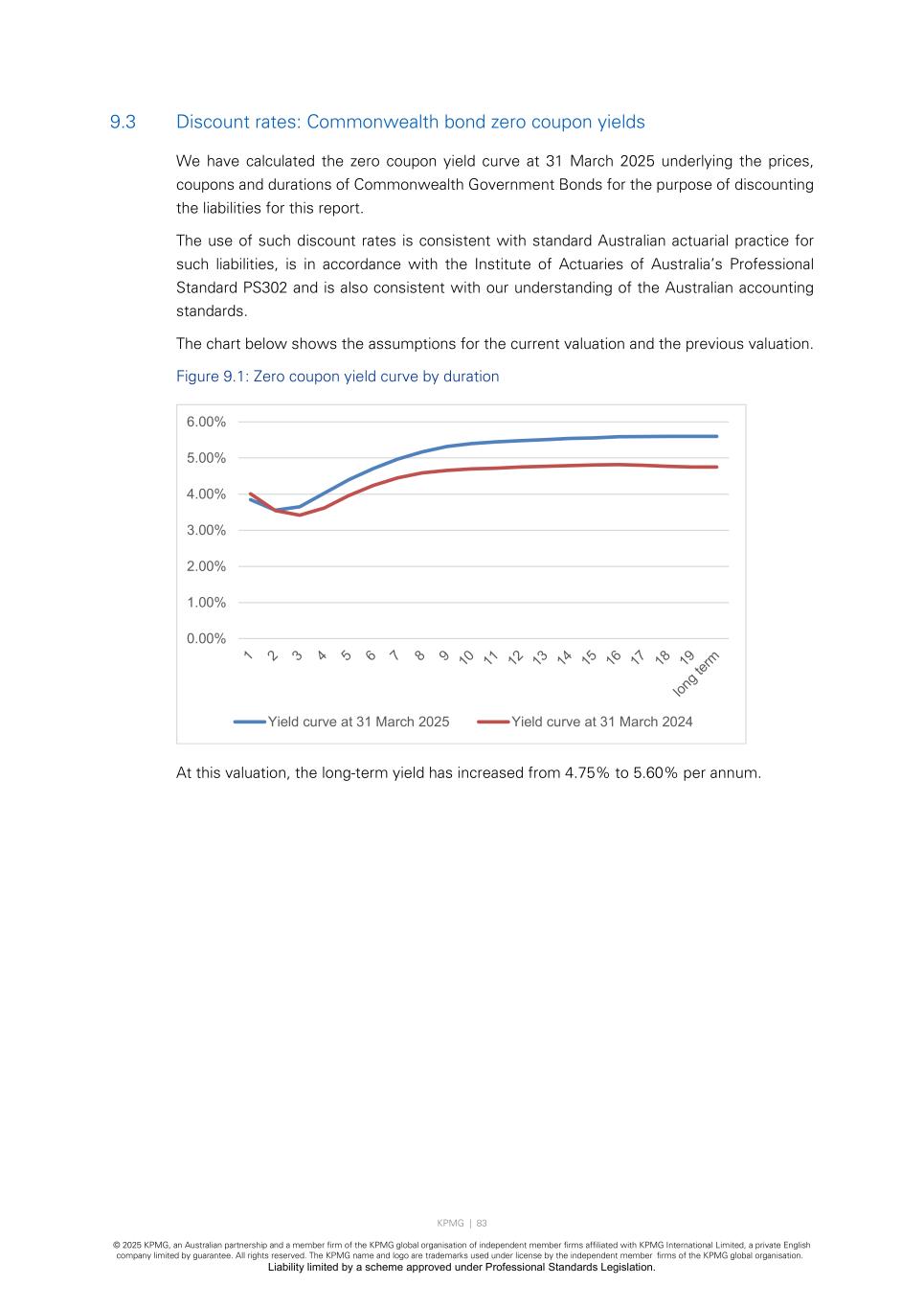 KPMG | 83 © 2025 KPMG, an Australian partnership and a member firm of the KPMG global organisation of independent member firms affiliated with KPMG International Limited, a private English company limited by guarantee. All rights reserved. The KPMG name and logo are trademarks used under license by the independent member firms of the KPMG global organisation. Liability limited by a scheme approved under Professional Standards Legislation. 9.3 Discount rates: Commonwealth bond zero coupon yields We have calculated the zero coupon yield curve at 31 March 2025 underlying the prices, coupons and durations of Commonwealth Government Bonds for the purpose of discounting the liabilities for this report. The use of such discount rates is consistent with standard Australian actuarial practice for such liabilities, is in accordance with the Institute of Actuaries of Australia’s Professional Standard PS302 and is also consistent with our understanding of the Australian accounting standards. The chart below shows the assumptions for the current valuation and the previous valuation. Figure 9.1: Zero coupon yield curve by duration At this valuation, the long-term yield has increased from 4.75% to 5.60% per annum. 0.00% 1.00% 2.00% 3.00% 4.00% 5.00% 6.00% Yield curve at 31 March 2025 Yield curve at 31 March 2024