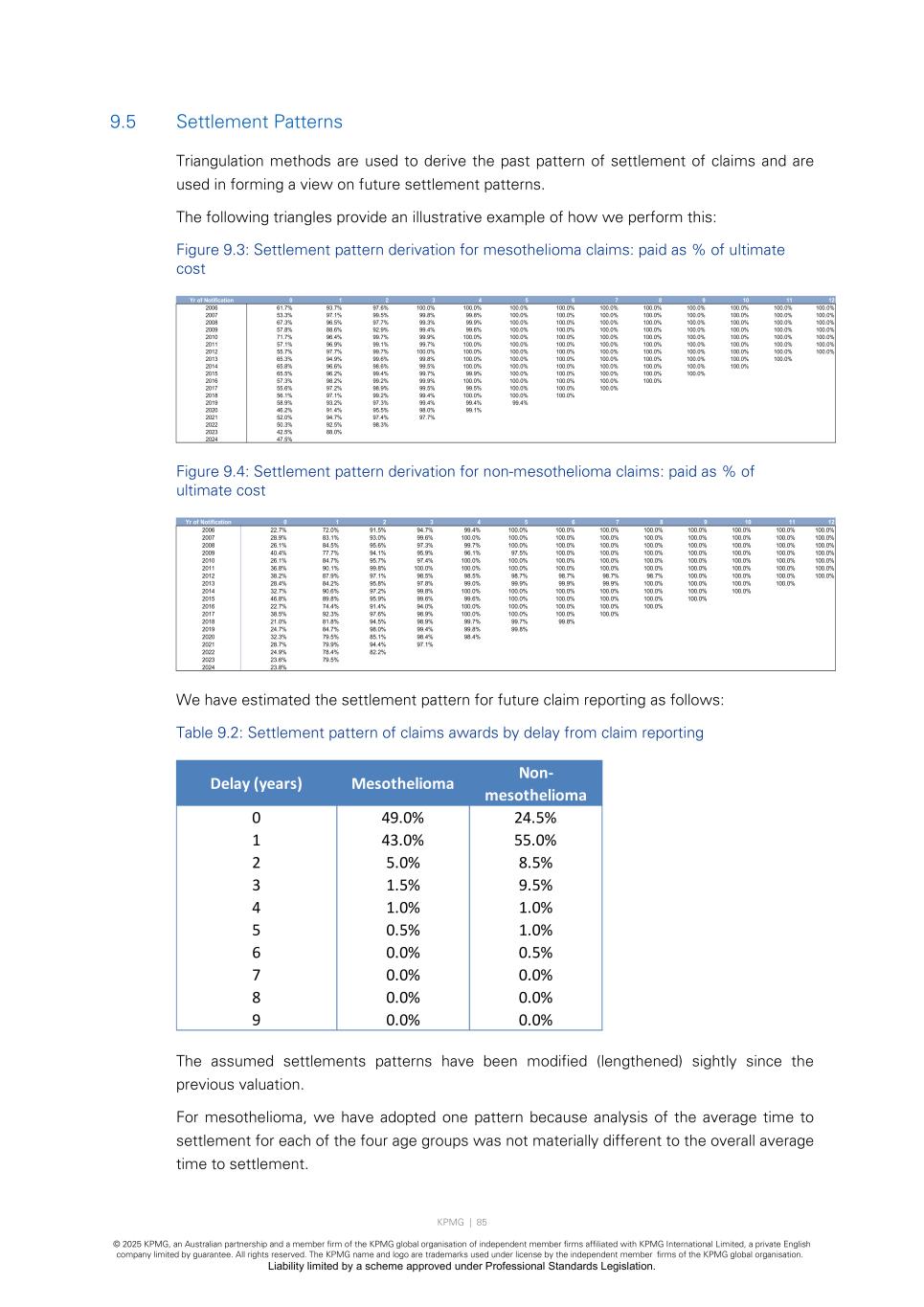 KPMG | 85 © 2025 KPMG, an Australian partnership and a member firm of the KPMG global organisation of independent member firms affiliated with KPMG International Limited, a private English company limited by guarantee. All rights reserved. The KPMG name and logo are trademarks used under license by the independent member firms of the KPMG global organisation. Liability limited by a scheme approved under Professional Standards Legislation. 9.5 Settlement Patterns Triangulation methods are used to derive the past pattern of settlement of claims and are used in forming a view on future settlement patterns. The following triangles provide an illustrative example of how we perform this: Figure 9.3: Settlement pattern derivation for mesothelioma claims: paid as % of ultimate cost Figure 9.4: Settlement pattern derivation for non-mesothelioma claims: paid as % of ultimate cost We have estimated the settlement pattern for future claim reporting as follows: Table 9.2: Settlement pattern of claims awards by delay from claim reporting The assumed settlements patterns have been modified (lengthened) sightly since the previous valuation. For mesothelioma, we have adopted one pattern because analysis of the average time to settlement for each of the four age groups was not materially different to the overall average time to settlement. Yr of Notification 0 1 2 3 4 5 6 7 8 9 10 11 12 2006 61.7% 93.7% 97.6% 100.0% 100.0% 100.0% 100.0% 100.0% 100.0% 100.0% 100.0% 100.0% 100.0% 2007 53.3% 97.1% 99.5% 99.8% 99.8% 100.0% 100.0% 100.0% 100.0% 100.0% 100.0% 100.0% 100.0% 2008 67.3% 96.5% 97.7% 99.3% 99.9% 100.0% 100.0% 100.0% 100.0% 100.0% 100.0% 100.0% 100.0% 2009 57.8% 88.6% 92.9% 99.4% 99.6% 100.0% 100.0% 100.0% 100.0% 100.0% 100.0% 100.0% 100.0% 2010 71.7% 96.4% 99.7% 99.9% 100.0% 100.0% 100.0% 100.0% 100.0% 100.0% 100.0% 100.0% 100.0% 2011 57.1% 96.9% 99.1% 99.7% 100.0% 100.0% 100.0% 100.0% 100.0% 100.0% 100.0% 100.0% 100.0% 2012 55.7% 97.7% 99.7% 100.0% 100.0% 100.0% 100.0% 100.0% 100.0% 100.0% 100.0% 100.0% 100.0% 2013 65.3% 94.9% 99.6% 99.8% 100.0% 100.0% 100.0% 100.0% 100.0% 100.0% 100.0% 100.0% 2014 65.8% 96.6% 98.6% 99.5% 100.0% 100.0% 100.0% 100.0% 100.0% 100.0% 100.0% 2015 65.5% 96.2% 99.4% 99.7% 99.9% 100.0% 100.0% 100.0% 100.0% 100.0% 2016 57.3% 98.2% 99.2% 99.9% 100.0% 100.0% 100.0% 100.0% 100.0% 2017 55.6% 97.2% 98.9% 99.5% 99.5% 100.0% 100.0% 100.0% 2018 56.1% 97.1% 99.2% 99.4% 100.0% 100.0% 100.0% 2019 58.9% 93.2% 97.3% 99.4% 99.4% 99.4% 2020 46.2% 91.4% 95.5% 98.0% 99.1% 2021 52.0% 94.7% 97.4% 97.7% 2022 50.3% 92.5% 98.3% 2023 42.5% 88.0% 2024 47.5% Yr of Notification 0 1 2 3 4 5 6 7 8 9 10 11 12 2006 22.7% 72.0% 91.5% 94.7% 99.4% 100.0% 100.0% 100.0% 100.0% 100.0% 100.0% 100.0% 100.0% 2007 28.9% 83.1% 93.0% 99.6% 100.0% 100.0% 100.0% 100.0% 100.0% 100.0% 100.0% 100.0% 100.0% 2008 26.1% 84.5% 95.6% 97.3% 99.7% 100.0% 100.0% 100.0% 100.0% 100.0% 100.0% 100.0% 100.0% 2009 40.4% 77.7% 94.1% 95.9% 96.1% 97.5% 100.0% 100.0% 100.0% 100.0% 100.0% 100.0% 100.0% 2010 26.1% 84.7% 95.7% 97.4% 100.0% 100.0% 100.0% 100.0% 100.0% 100.0% 100.0% 100.0% 100.0% 2011 36.8% 90.1% 99.8% 100.0% 100.0% 100.0% 100.0% 100.0% 100.0% 100.0% 100.0% 100.0% 100.0% 2012 38.2% 87.9% 97.1% 98.5% 98.5% 98.7% 98.7% 98.7% 98.7% 100.0% 100.0% 100.0% 100.0% 2013 28.4% 84.2% 95.8% 97.8% 99.0% 99.9% 99.9% 99.9% 100.0% 100.0% 100.0% 100.0% 2014 32.7% 90.6% 97.2% 99.8% 100.0% 100.0% 100.0% 100.0% 100.0% 100.0% 100.0% 2015 46.8% 89.8% 95.9% 99.6% 99.6% 100.0% 100.0% 100.0% 100.0% 100.0% 2016 22.7% 74.4% 91.4% 94.0% 100.0% 100.0% 100.0% 100.0% 100.0% 2017 38.5% 92.3% 97.6% 98.9% 100.0% 100.0% 100.0% 100.0% 2018 21.0% 81.8% 94.5% 98.9% 99.7% 99.7% 99.8% 2019 24.7% 84.7% 98.0% 99.4% 99.8% 99.8% 2020 32.3% 79.5% 85.1% 98.4% 98.4% 2021 28.7% 79.9% 94.4% 97.1% 2022 24.9% 78.4% 82.2% 2023 23.6% 79.5% 2024 23.8% Delay (years) Mesothelioma Non- mesothelioma 0 49.0% 24.5% 1 43.0% 55.0% 2 5.0% 8.5% 3 1.5% 9.5% 4 1.0% 1.0% 5 0.5% 1.0% 6 0.0% 0.5% 7 0.0% 0.0% 8 0.0% 0.0% 9 0.0% 0.0%