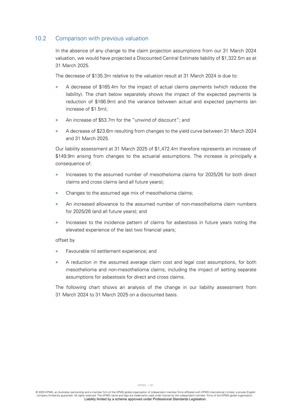 KPMG | 87 © 2025 KPMG, an Australian partnership and a member firm of the KPMG global organisation of independent member firms affiliated with KPMG International Limited, a private English company limited by guarantee. All rights reserved. The KPMG name and logo are trademarks used under license by the independent member firms of the KPMG global organisation. Liability limited by a scheme approved under Professional Standards Legislation. 10.2 Comparison with previous valuation In the absence of any change to the claim projection assumptions from our 31 March 2024 valuation, we would have projected a Discounted Central Estimate liability of $1,322.5m as at 31 March 2025. The decrease of $135.3m relative to the valuation result at 31 March 2024 is due to: • A decrease of $165.4m for the impact of actual claims payments (which reduces the liability). The chart below separately shows the impact of the expected payments (a reduction of $166.9m) and the variance between actual and expected payments (an increase of $1.5m); • An increase of $53.7m for the “unwind of discount”; and • A decrease of $23.6m resulting from changes to the yield curve between 31 March 2024 and 31 March 2025. Our liability assessment at 31 March 2025 of $1,472.4m therefore represents an increase of $149.9m arising from changes to the actuarial assumptions. The increase is principally a consequence of: • Increases to the assumed number of mesothelioma claims for 2025/26 for both direct claims and cross claims (and all future years); • Changes to the assumed age mix of mesothelioma claims; • An increased allowance to the assumed number of non-mesothelioma claim numbers for 2025/26 (and all future years); and • Increases to the incidence pattern of claims for asbestosis in future years noting the elevated experience of the last two financial years; offset by • Favourable nil settlement experience; and • A reduction in the assumed average claim cost and legal cost assumptions, for both mesothelioma and non-mesothelioma claims, including the impact of setting separate assumptions for asbestosis for direct and cross claims. The following chart shows an analysis of the change in our liability assessment from 31 March 2024 to 31 March 2025 on a discounted basis.