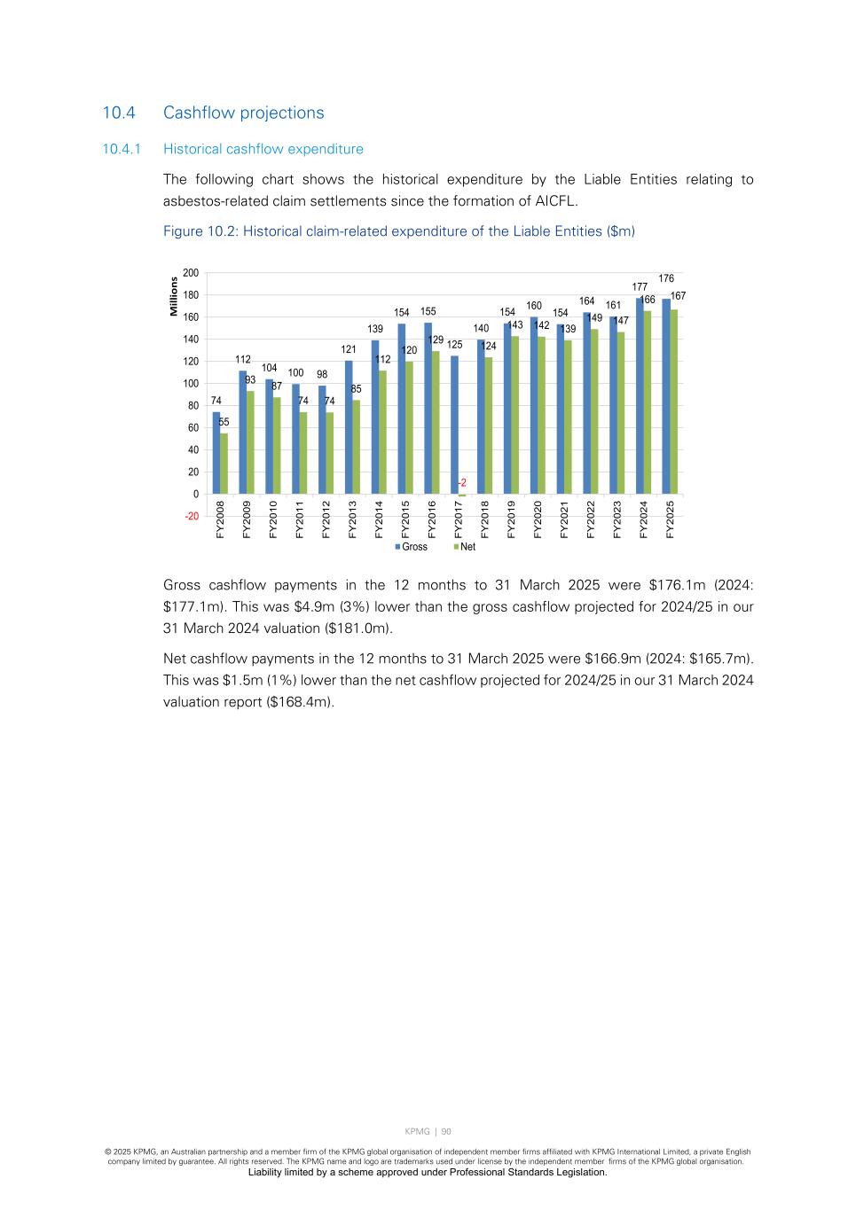 KPMG | 90 © 2025 KPMG, an Australian partnership and a member firm of the KPMG global organisation of independent member firms affiliated with KPMG International Limited, a private English company limited by guarantee. All rights reserved. The KPMG name and logo are trademarks used under license by the independent member firms of the KPMG global organisation. Liability limited by a scheme approved under Professional Standards Legislation. 10.4 Cashflow projections 10.4.1 Historical cashflow expenditure The following chart shows the historical expenditure by the Liable Entities relating to asbestos-related claim settlements since the formation of AICFL. Figure 10.2: Historical claim-related expenditure of the Liable Entities ($m) Gross cashflow payments in the 12 months to 31 March 2025 were $176.1m (2024: $177.1m). This was $4.9m (3%) lower than the gross cashflow projected for 2024/25 in our 31 March 2024 valuation ($181.0m). Net cashflow payments in the 12 months to 31 March 2025 were $166.9m (2024: $165.7m). This was $1.5m (1%) lower than the net cashflow projected for 2024/25 in our 31 March 2024 valuation report ($168.4m). 74 112 104 100 98 121 139 154 155 125 140 154 160 154 164 161 177 176 55 93 87 74 74 85 112 120 129 -2 124 143 142 139 149 147 166 167 -20 0 20 40 60 80 100 120 140 160 180 200 F Y 20 08 F Y 20 09 F Y 20 10 F Y 20 11 F Y 20 12 F Y 20 13 F Y 20 14 F Y 20 15 F Y 20 16 F Y 20 17 F Y 20 18 F Y 20 19 F Y 20 20 F Y 20 21 F Y 20 22 F Y 20 23 F Y 20 24 F Y 20 25 M ill io ns Gross Net