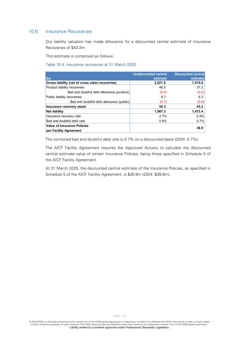 KPMG | 93 © 2025 KPMG, an Australian partnership and a member firm of the KPMG global organisation of independent member firms affiliated with KPMG International Limited, a private English company limited by guarantee. All rights reserved. The KPMG name and logo are trademarks used under license by the independent member firms of the KPMG global organisation. Liability limited by a scheme approved under Professional Standards Legislation. 10.6 Insurance Recoveries Our liability valuation has made allowance for a discounted central estimate of Insurance Recoveries of $43.2m. This estimate is comprised as follows: Table 10.4: Insurance recoveries at 31 March 2025 The combined bad and doubtful debt rate is 0.7% on a discounted basis (2024: 0.7%). The AICF Facility Agreement requires the Approved Actuary to calculate the discounted central estimate value of certain Insurance Policies, being those specified in Schedule 5 of the AICF Facility Agreement. At 31 March 2025, the discounted central estimate of the Insurance Policies, as specified in Schedule 5 of the AICF Facility Agreement, is $36.9m (2024: $39.8m). $m Undiscounted central estimate Discounted central estimate Gross liability (net of cross claim recoveries) 2,021.6 1,515.6 Product liability recoveries 46.0 37.2 Bad and doubtful debt allowance (product) (0.4) (0.2) Public liability recoveries 8.7 6.3 Bad and doubtful debt allowance (public) (0.1) (0.0) Insurance recovery asset 54.3 43.2 Net liability 1,967.3 1,472.4 Insurance recovery rate 2.7% 2.9% Bad and doubtful debt rate 0.8% 0.7% Value of Insurance Policies per Facility Agreement 36.9