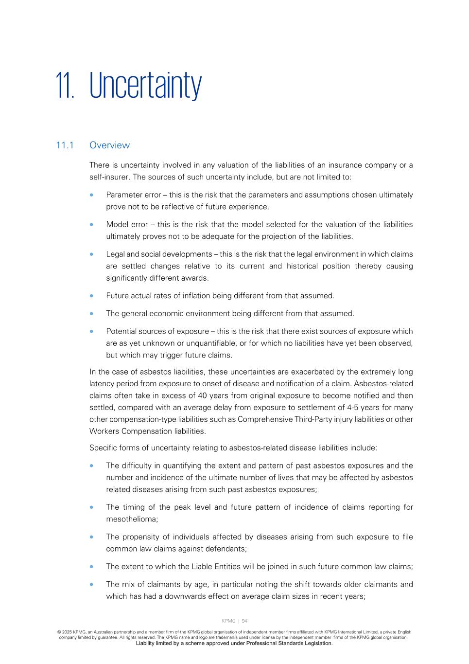KPMG | 94 © 2025 KPMG, an Australian partnership and a member firm of the KPMG global organisation of independent member firms affiliated with KPMG International Limited, a private English company limited by guarantee. All rights reserved. The KPMG name and logo are trademarks used under license by the independent member firms of the KPMG global organisation. Liability limited by a scheme approved under Professional Standards Legislation. 11. Uncertainty 11.1 Overview There is uncertainty involved in any valuation of the liabilities of an insurance company or a self-insurer. The sources of such uncertainty include, but are not limited to: • Parameter error – this is the risk that the parameters and assumptions chosen ultimately prove not to be reflective of future experience. • Model error – this is the risk that the model selected for the valuation of the liabilities ultimately proves not to be adequate for the projection of the liabilities. • Legal and social developments – this is the risk that the legal environment in which claims are settled changes relative to its current and historical position thereby causing significantly different awards. • Future actual rates of inflation being different from that assumed. • The general economic environment being different from that assumed. • Potential sources of exposure – this is the risk that there exist sources of exposure which are as yet unknown or unquantifiable, or for which no liabilities have yet been observed, but which may trigger future claims. In the case of asbestos liabilities, these uncertainties are exacerbated by the extremely long latency period from exposure to onset of disease and notification of a claim. Asbestos-related claims often take in excess of 40 years from original exposure to become notified and then settled, compared with an average delay from exposure to settlement of 4-5 years for many other compensation-type liabilities such as Comprehensive Third-Party injury liabilities or other Workers Compensation liabilities. Specific forms of uncertainty relating to asbestos-related disease liabilities include: • The difficulty in quantifying the extent and pattern of past asbestos exposures and the number and incidence of the ultimate number of lives that may be affected by asbestos related diseases arising from such past asbestos exposures; • The timing of the peak level and future pattern of incidence of claims reporting for mesothelioma; • The propensity of individuals affected by diseases arising from such exposure to file common law claims against defendants; • The extent to which the Liable Entities will be joined in such future common law claims; • The mix of claimants by age, in particular noting the shift towards older claimants and which has had a downwards effect on average claim sizes in recent years;