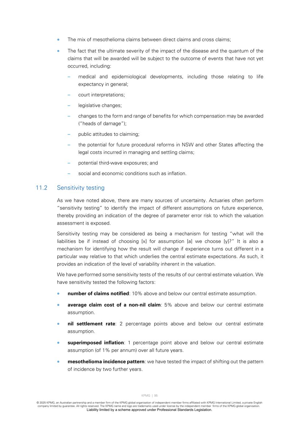 KPMG | 95 © 2025 KPMG, an Australian partnership and a member firm of the KPMG global organisation of independent member firms affiliated with KPMG International Limited, a private English company limited by guarantee. All rights reserved. The KPMG name and logo are trademarks used under license by the independent member firms of the KPMG global organisation. Liability limited by a scheme approved under Professional Standards Legislation. • The mix of mesothelioma claims between direct claims and cross claims; • The fact that the ultimate severity of the impact of the disease and the quantum of the claims that will be awarded will be subject to the outcome of events that have not yet occurred, including: – medical and epidemiological developments, including those relating to life expectancy in general; – court interpretations; – legislative changes; – changes to the form and range of benefits for which compensation may be awarded (“heads of damage”); – public attitudes to claiming; – the potential for future procedural reforms in NSW and other States affecting the legal costs incurred in managing and settling claims; – potential third-wave exposures; and – social and economic conditions such as inflation. 11.2 Sensitivity testing As we have noted above, there are many sources of uncertainty. Actuaries often perform “sensitivity testing” to identify the impact of different assumptions on future experience, thereby providing an indication of the degree of parameter error risk to which the valuation assessment is exposed. Sensitivity testing may be considered as being a mechanism for testing “what will the liabilities be if instead of choosing [x] for assumption [a] we choose [y]?” It is also a mechanism for identifying how the result will change if experience turns out different in a particular way relative to that which underlies the central estimate expectations. As such, it provides an indication of the level of variability inherent in the valuation. We have performed some sensitivity tests of the results of our central estimate valuation. We have sensitivity tested the following factors: • number of claims notified: 10% above and below our central estimate assumption. • average claim cost of a non-nil claim: 5% above and below our central estimate assumption. • nil settlement rate: 2 percentage points above and below our central estimate assumption. • superimposed inflation: 1 percentage point above and below our central estimate assumption (of 1% per annum) over all future years. • mesothelioma incidence pattern: we have tested the impact of shifting out the pattern of incidence by two further years.