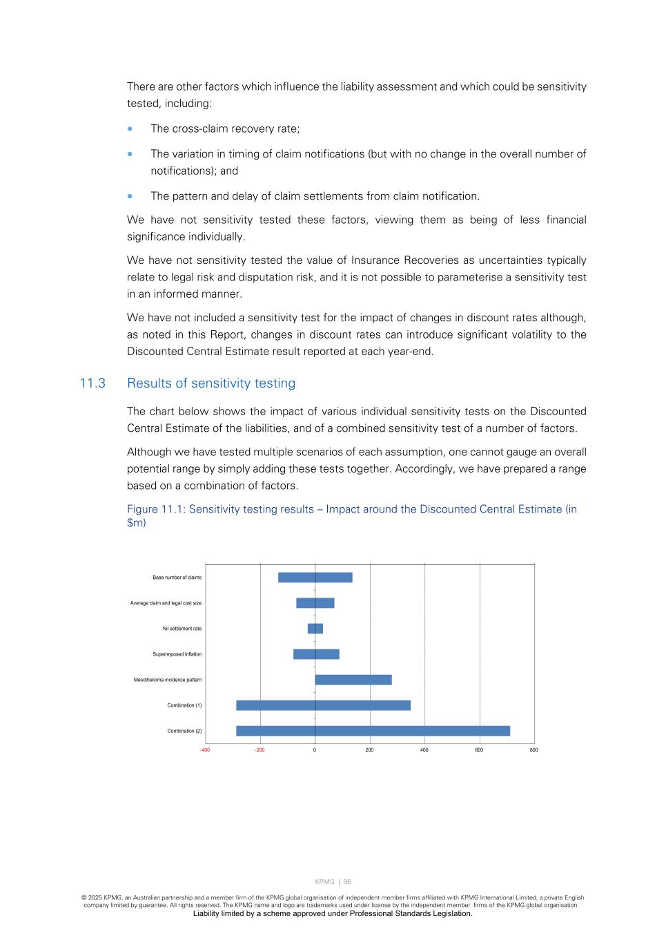 KPMG | 96 © 2025 KPMG, an Australian partnership and a member firm of the KPMG global organisation of independent member firms affiliated with KPMG International Limited, a private English company limited by guarantee. All rights reserved. The KPMG name and logo are trademarks used under license by the independent member firms of the KPMG global organisation. Liability limited by a scheme approved under Professional Standards Legislation. There are other factors which influence the liability assessment and which could be sensitivity tested, including: • The cross-claim recovery rate; • The variation in timing of claim notifications (but with no change in the overall number of notifications); and • The pattern and delay of claim settlements from claim notification. We have not sensitivity tested these factors, viewing them as being of less financial significance individually. We have not sensitivity tested the value of Insurance Recoveries as uncertainties typically relate to legal risk and disputation risk, and it is not possible to parameterise a sensitivity test in an informed manner. We have not included a sensitivity test for the impact of changes in discount rates although, as noted in this Report, changes in discount rates can introduce significant volatility to the Discounted Central Estimate result reported at each year-end. 11.3 Results of sensitivity testing The chart below shows the impact of various individual sensitivity tests on the Discounted Central Estimate of the liabilities, and of a combined sensitivity test of a number of factors. Although we have tested multiple scenarios of each assumption, one cannot gauge an overall potential range by simply adding these tests together. Accordingly, we have prepared a range based on a combination of factors. Figure 11.1: Sensitivity testing results – Impact around the Discounted Central Estimate (in $m) -400 -200 0 200 400 600 800 Base number of claims Average claim and legal cost size Nil settlement rate Superimposed inflation Mesothelioma incidence pattern Combination (1) Combination (2)