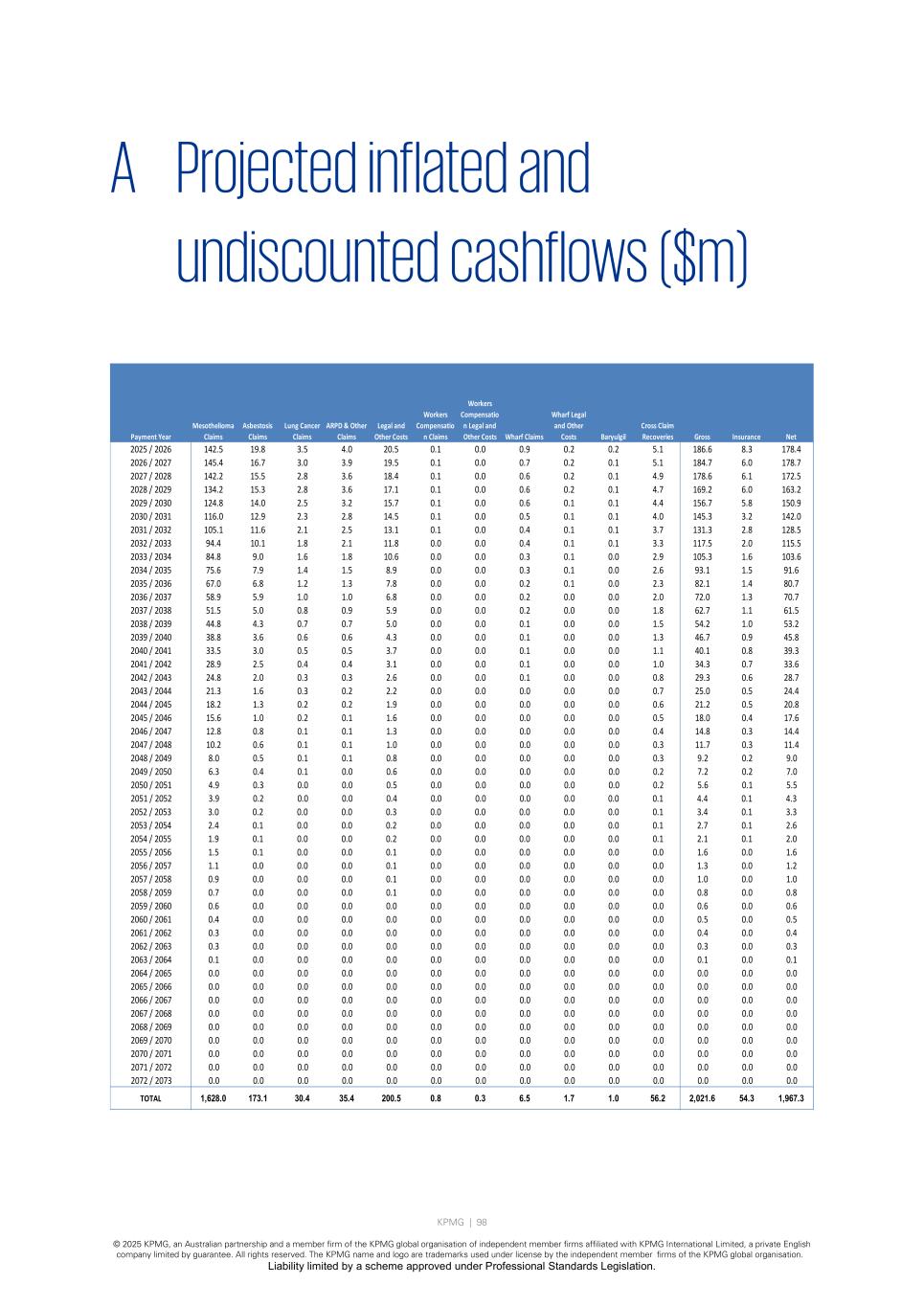 KPMG | 98 © 2025 KPMG, an Australian partnership and a member firm of the KPMG global organisation of independent member firms affiliated with KPMG International Limited, a private English company limited by guarantee. All rights reserved. The KPMG name and logo are trademarks used under license by the independent member firms of the KPMG global organisation. Liability limited by a scheme approved under Professional Standards Legislation. A Projected inflated and undiscounted cashflows ($m) Payment Year Mesothelioma Claims Asbestosis Claims Lung Cancer Claims ARPD & Other Claims Legal and Other Costs Workers Compensatio n Claims Workers Compensatio n Legal and Other Costs Wharf Claims Wharf Legal and Other Costs Baryulgil Cross Claim Recoveries Gross Insurance Net 2025 / 2026 142.5 19.8 3.5 4.0 20.5 0.1 0.0 0.9 0.2 0.2 5.1 186.6 8.3 178.4 2026 / 2027 145.4 16.7 3.0 3.9 19.5 0.1 0.0 0.7 0.2 0.1 5.1 184.7 6.0 178.7 2027 / 2028 142.2 15.5 2.8 3.6 18.4 0.1 0.0 0.6 0.2 0.1 4.9 178.6 6.1 172.5 2028 / 2029 134.2 15.3 2.8 3.6 17.1 0.1 0.0 0.6 0.2 0.1 4.7 169.2 6.0 163.2 2029 / 2030 124.8 14.0 2.5 3.2 15.7 0.1 0.0 0.6 0.1 0.1 4.4 156.7 5.8 150.9 2030 / 2031 116.0 12.9 2.3 2.8 14.5 0.1 0.0 0.5 0.1 0.1 4.0 145.3 3.2 142.0 2031 / 2032 105.1 11.6 2.1 2.5 13.1 0.1 0.0 0.4 0.1 0.1 3.7 131.3 2.8 128.5 2032 / 2033 94.4 10.1 1.8 2.1 11.8 0.0 0.0 0.4 0.1 0.1 3.3 117.5 2.0 115.5 2033 / 2034 84.8 9.0 1.6 1.8 10.6 0.0 0.0 0.3 0.1 0.0 2.9 105.3 1.6 103.6 2034 / 2035 75.6 7.9 1.4 1.5 8.9 0.0 0.0 0.3 0.1 0.0 2.6 93.1 1.5 91.6 2035 / 2036 67.0 6.8 1.2 1.3 7.8 0.0 0.0 0.2 0.1 0.0 2.3 82.1 1.4 80.7 2036 / 2037 58.9 5.9 1.0 1.0 6.8 0.0 0.0 0.2 0.0 0.0 2.0 72.0 1.3 70.7 2037 / 2038 51.5 5.0 0.8 0.9 5.9 0.0 0.0 0.2 0.0 0.0 1.8 62.7 1.1 61.5 2038 / 2039 44.8 4.3 0.7 0.7 5.0 0.0 0.0 0.1 0.0 0.0 1.5 54.2 1.0 53.2 2039 / 2040 38.8 3.6 0.6 0.6 4.3 0.0 0.0 0.1 0.0 0.0 1.3 46.7 0.9 45.8 2040 / 2041 33.5 3.0 0.5 0.5 3.7 0.0 0.0 0.1 0.0 0.0 1.1 40.1 0.8 39.3 2041 / 2042 28.9 2.5 0.4 0.4 3.1 0.0 0.0 0.1 0.0 0.0 1.0 34.3 0.7 33.6 2042 / 2043 24.8 2.0 0.3 0.3 2.6 0.0 0.0 0.1 0.0 0.0 0.8 29.3 0.6 28.7 2043 / 2044 21.3 1.6 0.3 0.2 2.2 0.0 0.0 0.0 0.0 0.0 0.7 25.0 0.5 24.4 2044 / 2045 18.2 1.3 0.2 0.2 1.9 0.0 0.0 0.0 0.0 0.0 0.6 21.2 0.5 20.8 2045 / 2046 15.6 1.0 0.2 0.1 1.6 0.0 0.0 0.0 0.0 0.0 0.5 18.0 0.4 17.6 2046 / 2047 12.8 0.8 0.1 0.1 1.3 0.0 0.0 0.0 0.0 0.0 0.4 14.8 0.3 14.4 2047 / 2048 10.2 0.6 0.1 0.1 1.0 0.0 0.0 0.0 0.0 0.0 0.3 11.7 0.3 11.4 2048 / 2049 8.0 0.5 0.1 0.1 0.8 0.0 0.0 0.0 0.0 0.0 0.3 9.2 0.2 9.0 2049 / 2050 6.3 0.4 0.1 0.0 0.6 0.0 0.0 0.0 0.0 0.0 0.2 7.2 0.2 7.0 2050 / 2051 4.9 0.3 0.0 0.0 0.5 0.0 0.0 0.0 0.0 0.0 0.2 5.6 0.1 5.5 2051 / 2052 3.9 0.2 0.0 0.0 0.4 0.0 0.0 0.0 0.0 0.0 0.1 4.4 0.1 4.3 2052 / 2053 3.0 0.2 0.0 0.0 0.3 0.0 0.0 0.0 0.0 0.0 0.1 3.4 0.1 3.3 2053 / 2054 2.4 0.1 0.0 0.0 0.2 0.0 0.0 0.0 0.0 0.0 0.1 2.7 0.1 2.6 2054 / 2055 1.9 0.1 0.0 0.0 0.2 0.0 0.0 0.0 0.0 0.0 0.1 2.1 0.1 2.0 2055 / 2056 1.5 0.1 0.0 0.0 0.1 0.0 0.0 0.0 0.0 0.0 0.0 1.6 0.0 1.6 2056 / 2057 1.1 0.0 0.0 0.0 0.1 0.0 0.0 0.0 0.0 0.0 0.0 1.3 0.0 1.2 2057 / 2058 0.9 0.0 0.0 0.0 0.1 0.0 0.0 0.0 0.0 0.0 0.0 1.0 0.0 1.0 2058 / 2059 0.7 0.0 0.0 0.0 0.1 0.0 0.0 0.0 0.0 0.0 0.0 0.8 0.0 0.8 2059 / 2060 0.6 0.0 0.0 0.0 0.0 0.0 0.0 0.0 0.0 0.0 0.0 0.6 0.0 0.6 2060 / 2061 0.4 0.0 0.0 0.0 0.0 0.0 0.0 0.0 0.0 0.0 0.0 0.5 0.0 0.5 2061 / 2062 0.3 0.0 0.0 0.0 0.0 0.0 0.0 0.0 0.0 0.0 0.0 0.4 0.0 0.4 2062 / 2063 0.3 0.0 0.0 0.0 0.0 0.0 0.0 0.0 0.0 0.0 0.0 0.3 0.0 0.3 2063 / 2064 0.1 0.0 0.0 0.0 0.0 0.0 0.0 0.0 0.0 0.0 0.0 0.1 0.0 0.1 2064 / 2065 0.0 0.0 0.0 0.0 0.0 0.0 0.0 0.0 0.0 0.0 0.0 0.0 0.0 0.0 2065 / 2066 0.0 0.0 0.0 0.0 0.0 0.0 0.0 0.0 0.0 0.0 0.0 0.0 0.0 0.0 2066 / 2067 0.0 0.0 0.0 0.0 0.0 0.0 0.0 0.0 0.0 0.0 0.0 0.0 0.0 0.0 2067 / 2068 0.0 0.0 0.0 0.0 0.0 0.0 0.0 0.0 0.0 0.0 0.0 0.0 0.0 0.0 2068 / 2069 0.0 0.0 0.0 0.0 0.0 0.0 0.0 0.0 0.0 0.0 0.0 0.0 0.0 0.0 2069 / 2070 0.0 0.0 0.0 0.0 0.0 0.0 0.0 0.0 0.0 0.0 0.0 0.0 0.0 0.0 2070 / 2071 0.0 0.0 0.0 0.0 0.0 0.0 0.0 0.0 0.0 0.0 0.0 0.0 0.0 0.0 2071 / 2072 0.0 0.0 0.0 0.0 0.0 0.0 0.0 0.0 0.0 0.0 0.0 0.0 0.0 0.0 2072 / 2073 0.0 0.0 0.0 0.0 0.0 0.0 0.0 0.0 0.0 0.0 0.0 0.0 0.0 0.0 TOTAL 1,628.0 173.1 30.4 35.4 200.5 0.8 0.3 6.5 1.7 1.0 56.2 2,021.6 54.3 1,967.3