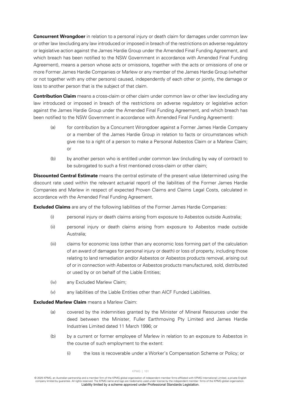 KPMG | 101 © 2025 KPMG, an Australian partnership and a member firm of the KPMG global organisation of independent member firms affiliated with KPMG International Limited, a private English company limited by guarantee. All rights reserved. The KPMG name and logo are trademarks used under license by the independent member firms of the KPMG global organisation. Liability limited by a scheme approved under Professional Standards Legislation. Concurrent Wrongdoer in relation to a personal injury or death claim for damages under common law or other law (excluding any law introduced or imposed in breach of the restrictions on adverse regulatory or legislative action against the James Hardie Group under the Amended Final Funding Agreement, and which breach has been notified to the NSW Government in accordance with Amended Final Funding Agreement), means a person whose acts or omissions, together with the acts or omissions of one or more Former James Hardie Companies or Marlew or any member of the James Hardie Group (whether or not together with any other persons) caused, independently of each other or jointly, the damage or loss to another person that is the subject of that claim. Contribution Claim means a cross-claim or other claim under common law or other law (excluding any law introduced or imposed in breach of the restrictions on adverse regulatory or legislative action against the James Hardie Group under the Amended Final Funding Agreement, and which breach has been notified to the NSW Government in accordance with Amended Final Funding Agreement): (a) for contribution by a Concurrent Wrongdoer against a Former James Hardie Company or a member of the James Hardie Group in relation to facts or circumstances which give rise to a right of a person to make a Personal Asbestos Claim or a Marlew Claim; or (b) by another person who is entitled under common law (including by way of contract) to be subrogated to such a first mentioned cross-claim or other claim; Discounted Central Estimate means the central estimate of the present value (determined using the discount rate used within the relevant actuarial report) of the liabilities of the Former James Hardie Companies and Marlew in respect of expected Proven Claims and Claims Legal Costs, calculated in accordance with the Amended Final Funding Agreement. Excluded Claims are any of the following liabilities of the Former James Hardie Companies: (i) personal injury or death claims arising from exposure to Asbestos outside Australia; (ii) personal injury or death claims arising from exposure to Asbestos made outside Australia; (iii) claims for economic loss (other than any economic loss forming part of the calculation of an award of damages for personal injury or death) or loss of property, including those relating to land remediation and/or Asbestos or Asbestos products removal, arising out of or in connection with Asbestos or Asbestos products manufactured, sold, distributed or used by or on behalf of the Liable Entities; (iv) any Excluded Marlew Claim; (v) any liabilities of the Liable Entities other than AICF Funded Liabilities. Excluded Marlew Claim means a Marlew Claim: (a) covered by the indemnities granted by the Minister of Mineral Resources under the deed between the Minister, Fuller Earthmoving Pty Limited and James Hardie Industries Limited dated 11 March 1996; or (b) by a current or former employee of Marlew in relation to an exposure to Asbestos in the course of such employment to the extent: (i) the loss is recoverable under a Worker’s Compensation Scheme or Policy; or