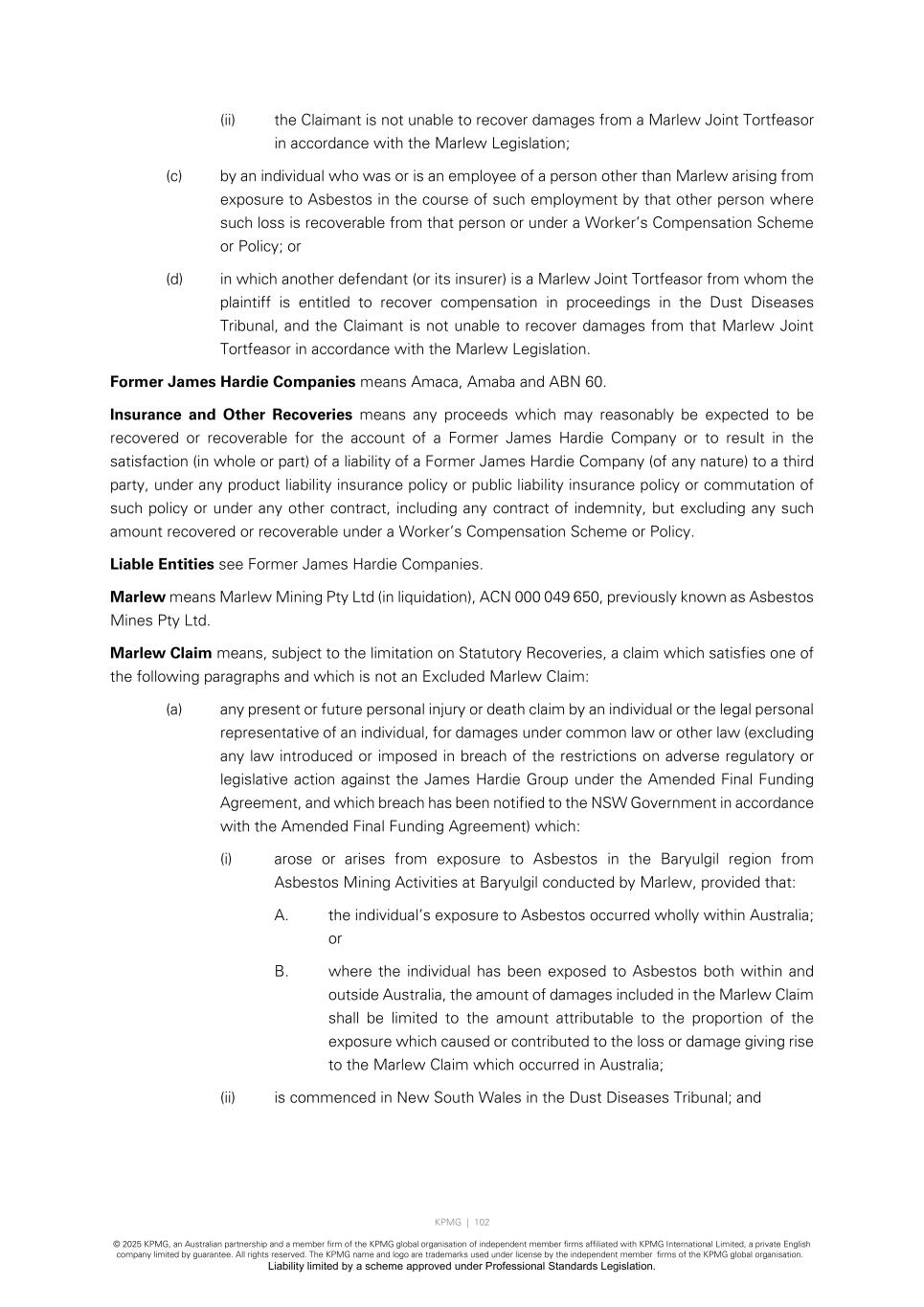 KPMG | 102 © 2025 KPMG, an Australian partnership and a member firm of the KPMG global organisation of independent member firms affiliated with KPMG International Limited, a private English company limited by guarantee. All rights reserved. The KPMG name and logo are trademarks used under license by the independent member firms of the KPMG global organisation. Liability limited by a scheme approved under Professional Standards Legislation. (ii) the Claimant is not unable to recover damages from a Marlew Joint Tortfeasor in accordance with the Marlew Legislation; (c) by an individual who was or is an employee of a person other than Marlew arising from exposure to Asbestos in the course of such employment by that other person where such loss is recoverable from that person or under a Worker’s Compensation Scheme or Policy; or (d) in which another defendant (or its insurer) is a Marlew Joint Tortfeasor from whom the plaintiff is entitled to recover compensation in proceedings in the Dust Diseases Tribunal, and the Claimant is not unable to recover damages from that Marlew Joint Tortfeasor in accordance with the Marlew Legislation. Former James Hardie Companies means Amaca, Amaba and ABN 60. Insurance and Other Recoveries means any proceeds which may reasonably be expected to be recovered or recoverable for the account of a Former James Hardie Company or to result in the satisfaction (in whole or part) of a liability of a Former James Hardie Company (of any nature) to a third party, under any product liability insurance policy or public liability insurance policy or commutation of such policy or under any other contract, including any contract of indemnity, but excluding any such amount recovered or recoverable under a Worker’s Compensation Scheme or Policy. Liable Entities see Former James Hardie Companies. Marlew means Marlew Mining Pty Ltd (in liquidation), ACN 000 049 650, previously known as Asbestos Mines Pty Ltd. Marlew Claim means, subject to the limitation on Statutory Recoveries, a claim which satisfies one of the following paragraphs and which is not an Excluded Marlew Claim: (a) any present or future personal injury or death claim by an individual or the legal personal representative of an individual, for damages under common law or other law (excluding any law introduced or imposed in breach of the restrictions on adverse regulatory or legislative action against the James Hardie Group under the Amended Final Funding Agreement, and which breach has been notified to the NSW Government in accordance with the Amended Final Funding Agreement) which: (i) arose or arises from exposure to Asbestos in the Baryulgil region from Asbestos Mining Activities at Baryulgil conducted by Marlew, provided that: A. the individual’s exposure to Asbestos occurred wholly within Australia; or B. where the individual has been exposed to Asbestos both within and outside Australia, the amount of damages included in the Marlew Claim shall be limited to the amount attributable to the proportion of the exposure which caused or contributed to the loss or damage giving rise to the Marlew Claim which occurred in Australia; (ii) is commenced in New South Wales in the Dust Diseases Tribunal; and