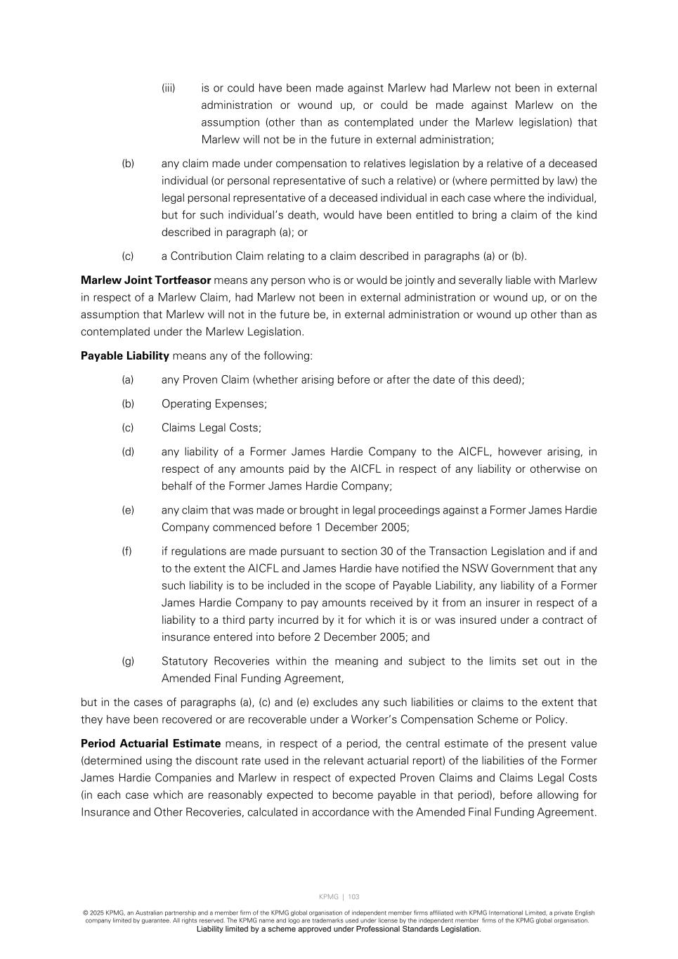 KPMG | 103 © 2025 KPMG, an Australian partnership and a member firm of the KPMG global organisation of independent member firms affiliated with KPMG International Limited, a private English company limited by guarantee. All rights reserved. The KPMG name and logo are trademarks used under license by the independent member firms of the KPMG global organisation. Liability limited by a scheme approved under Professional Standards Legislation. (iii) is or could have been made against Marlew had Marlew not been in external administration or wound up, or could be made against Marlew on the assumption (other than as contemplated under the Marlew legislation) that Marlew will not be in the future in external administration; (b) any claim made under compensation to relatives legislation by a relative of a deceased individual (or personal representative of such a relative) or (where permitted by law) the legal personal representative of a deceased individual in each case where the individual, but for such individual’s death, would have been entitled to bring a claim of the kind described in paragraph (a); or (c) a Contribution Claim relating to a claim described in paragraphs (a) or (b). Marlew Joint Tortfeasor means any person who is or would be jointly and severally liable with Marlew in respect of a Marlew Claim, had Marlew not been in external administration or wound up, or on the assumption that Marlew will not in the future be, in external administration or wound up other than as contemplated under the Marlew Legislation. Payable Liability means any of the following: (a) any Proven Claim (whether arising before or after the date of this deed); (b) Operating Expenses; (c) Claims Legal Costs; (d) any liability of a Former James Hardie Company to the AICFL, however arising, in respect of any amounts paid by the AICFL in respect of any liability or otherwise on behalf of the Former James Hardie Company; (e) any claim that was made or brought in legal proceedings against a Former James Hardie Company commenced before 1 December 2005; (f) if regulations are made pursuant to section 30 of the Transaction Legislation and if and to the extent the AICFL and James Hardie have notified the NSW Government that any such liability is to be included in the scope of Payable Liability, any liability of a Former James Hardie Company to pay amounts received by it from an insurer in respect of a liability to a third party incurred by it for which it is or was insured under a contract of insurance entered into before 2 December 2005; and (g) Statutory Recoveries within the meaning and subject to the limits set out in the Amended Final Funding Agreement, but in the cases of paragraphs (a), (c) and (e) excludes any such liabilities or claims to the extent that they have been recovered or are recoverable under a Worker’s Compensation Scheme or Policy. Period Actuarial Estimate means, in respect of a period, the central estimate of the present value (determined using the discount rate used in the relevant actuarial report) of the liabilities of the Former James Hardie Companies and Marlew in respect of expected Proven Claims and Claims Legal Costs (in each case which are reasonably expected to become payable in that period), before allowing for Insurance and Other Recoveries, calculated in accordance with the Amended Final Funding Agreement.