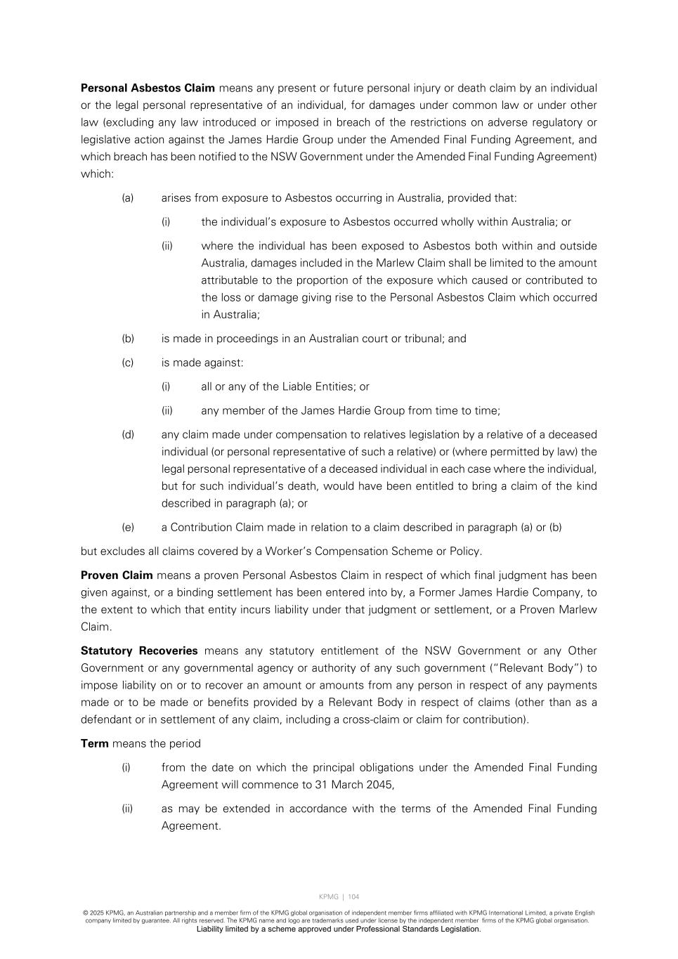 KPMG | 104 © 2025 KPMG, an Australian partnership and a member firm of the KPMG global organisation of independent member firms affiliated with KPMG International Limited, a private English company limited by guarantee. All rights reserved. The KPMG name and logo are trademarks used under license by the independent member firms of the KPMG global organisation. Liability limited by a scheme approved under Professional Standards Legislation. Personal Asbestos Claim means any present or future personal injury or death claim by an individual or the legal personal representative of an individual, for damages under common law or under other law (excluding any law introduced or imposed in breach of the restrictions on adverse regulatory or legislative action against the James Hardie Group under the Amended Final Funding Agreement, and which breach has been notified to the NSW Government under the Amended Final Funding Agreement) which: (a) arises from exposure to Asbestos occurring in Australia, provided that: (i) the individual’s exposure to Asbestos occurred wholly within Australia; or (ii) where the individual has been exposed to Asbestos both within and outside Australia, damages included in the Marlew Claim shall be limited to the amount attributable to the proportion of the exposure which caused or contributed to the loss or damage giving rise to the Personal Asbestos Claim which occurred in Australia; (b) is made in proceedings in an Australian court or tribunal; and (c) is made against: (i) all or any of the Liable Entities; or (ii) any member of the James Hardie Group from time to time; (d) any claim made under compensation to relatives legislation by a relative of a deceased individual (or personal representative of such a relative) or (where permitted by law) the legal personal representative of a deceased individual in each case where the individual, but for such individual’s death, would have been entitled to bring a claim of the kind described in paragraph (a); or (e) a Contribution Claim made in relation to a claim described in paragraph (a) or (b) but excludes all claims covered by a Worker’s Compensation Scheme or Policy. Proven Claim means a proven Personal Asbestos Claim in respect of which final judgment has been given against, or a binding settlement has been entered into by, a Former James Hardie Company, to the extent to which that entity incurs liability under that judgment or settlement, or a Proven Marlew Claim. Statutory Recoveries means any statutory entitlement of the NSW Government or any Other Government or any governmental agency or authority of any such government (“Relevant Body”) to impose liability on or to recover an amount or amounts from any person in respect of any payments made or to be made or benefits provided by a Relevant Body in respect of claims (other than as a defendant or in settlement of any claim, including a cross-claim or claim for contribution). Term means the period (i) from the date on which the principal obligations under the Amended Final Funding Agreement will commence to 31 March 2045, (ii) as may be extended in accordance with the terms of the Amended Final Funding Agreement.