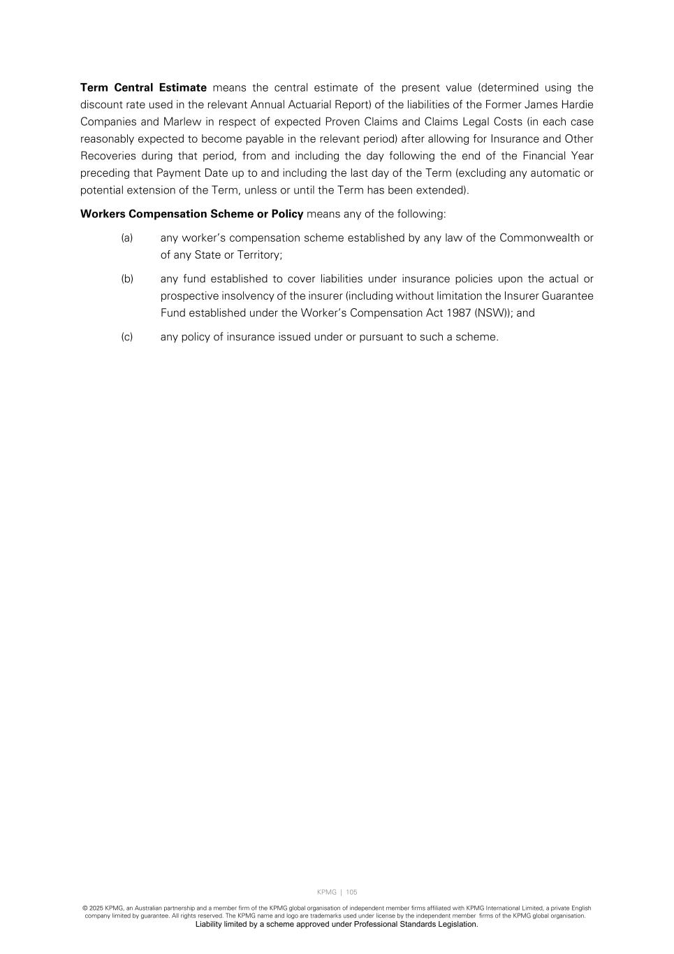 KPMG | 105 © 2025 KPMG, an Australian partnership and a member firm of the KPMG global organisation of independent member firms affiliated with KPMG International Limited, a private English company limited by guarantee. All rights reserved. The KPMG name and logo are trademarks used under license by the independent member firms of the KPMG global organisation. Liability limited by a scheme approved under Professional Standards Legislation. Term Central Estimate means the central estimate of the present value (determined using the discount rate used in the relevant Annual Actuarial Report) of the liabilities of the Former James Hardie Companies and Marlew in respect of expected Proven Claims and Claims Legal Costs (in each case reasonably expected to become payable in the relevant period) after allowing for Insurance and Other Recoveries during that period, from and including the day following the end of the Financial Year preceding that Payment Date up to and including the last day of the Term (excluding any automatic or potential extension of the Term, unless or until the Term has been extended). Workers Compensation Scheme or Policy means any of the following: (a) any worker’s compensation scheme established by any law of the Commonwealth or of any State or Territory; (b) any fund established to cover liabilities under insurance policies upon the actual or prospective insolvency of the insurer (including without limitation the Insurer Guarantee Fund established under the Worker’s Compensation Act 1987 (NSW)); and (c) any policy of insurance issued under or pursuant to such a scheme.