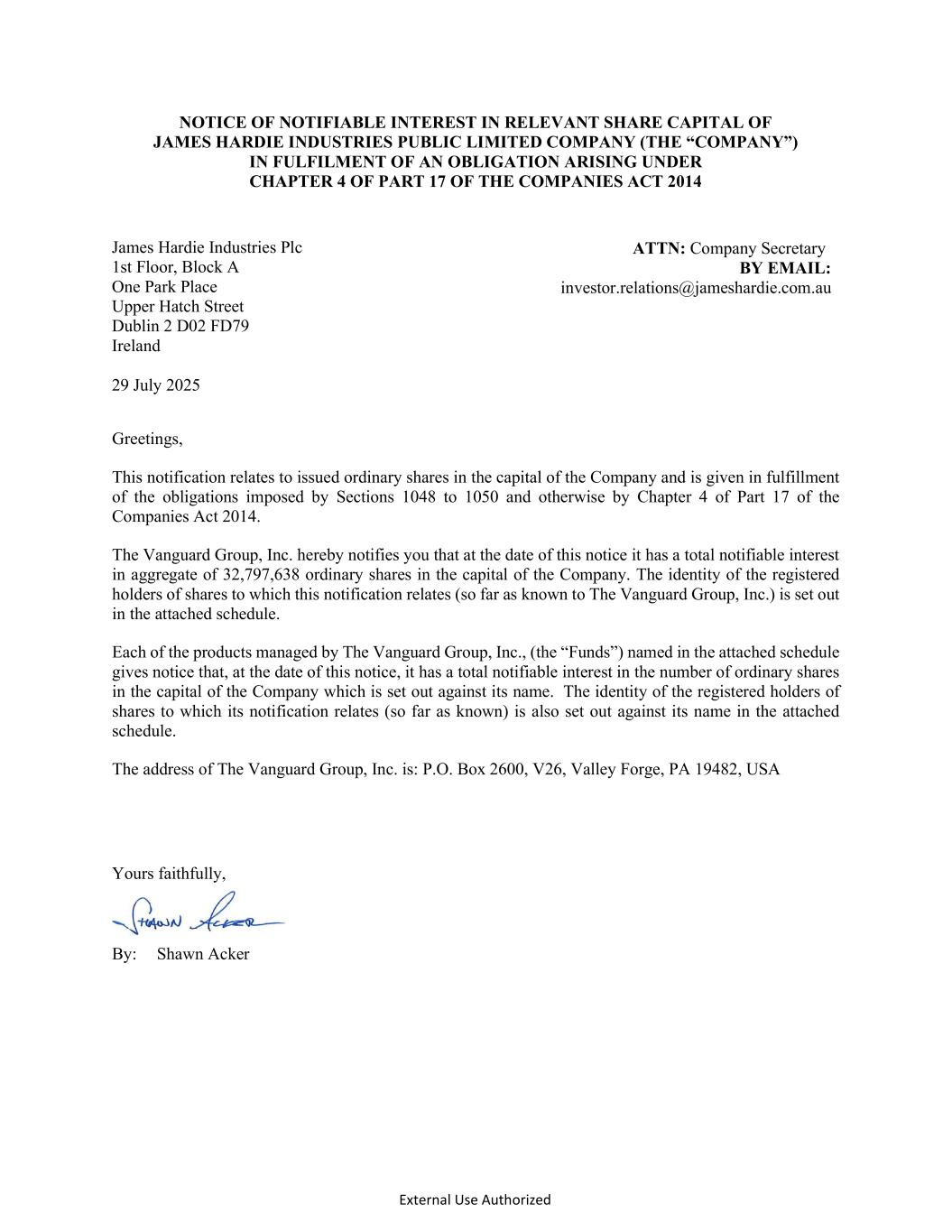 Forward-looking statements are based on the Company’s current expectations, estimates and assumptions and because forward-looking statements address future results, events and conditions, they, by their very nature, involve inherent risks and uncertainties, many of which are unforeseeable and beyond the Company’s control. Such known and unknown risks, uncertainties and other factors may cause actual results, performance or other achievements to differ materially from the anticipated results, performance or achievements expressed, projected or implied by these forward-looking statements. These factors, some of which are discussed under “Risk Factors” in Section 3 of the Form 20-F filed with the Securities and Exchange Commission on 20 May 2025, include, but are not limited to: all matters relating to or arising out of the prior manufacture of products that contained asbestos by current and former Company subsidiaries; required contributions to AICF, any shortfall in AICF funding and the effect of currency exchange rate movements on the amount recorded in the Company’s financial statements as an asbestos liability; compliance with and changes in tax laws and treatments; competition and product pricing in the markets in which the Company operates; the consequences of product failures or defects; exposure to environmental, asbestos, putative consumer class action or other legal proceedings; general economic and market conditions; the supply and cost of raw materials; possible increases in competition and the potential that competitors could copy the Company’s products; compliance with and changes in environmental and health and safety laws; risks of conducting business internationally; compliance with and changes in laws and regulations; currency exchange risks; dependence on customer preference and the concentration of the Company’s customer base; dependence on residential and commercial construction markets; the effect of adverse changes in climate or weather patterns; use of accounting estimates; and all other risks identified in the Company’s reports filed with Australian, Irish and US securities regulatory agencies and exchanges (as appropriate). The Company cautions you that the foregoing list of factors is not exhaustive and that other risks and uncertainties may cause actual results to differ materially from those referenced in the Company’s forward-looking statements. Forward-looking statements speak only as of the date they are made and are statements of the Company’s current expectations concerning future results, events and conditions. The Company assumes no obligation to update any forward-looking statements or information except as required by law.