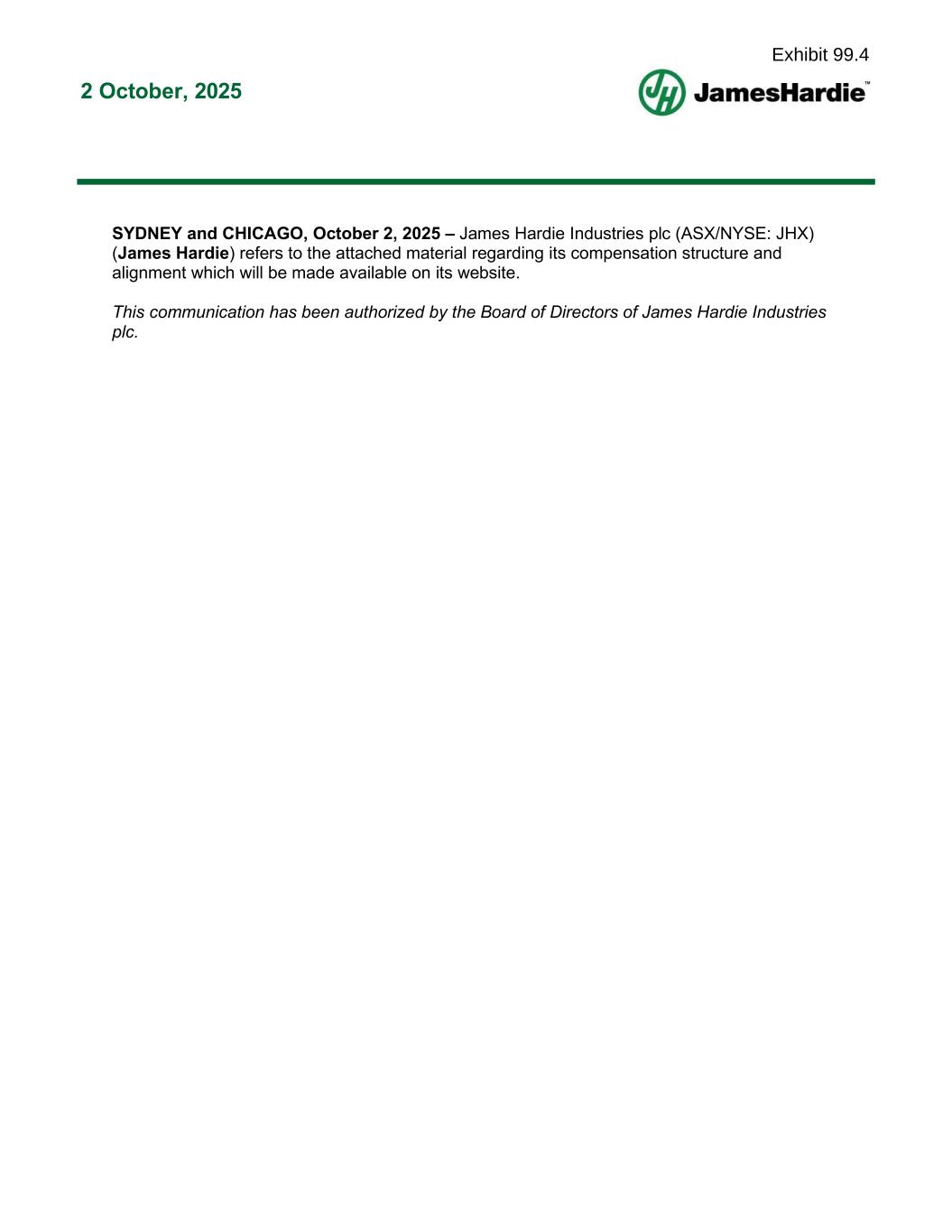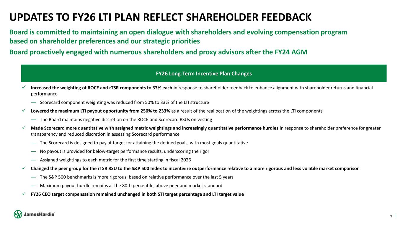 Forward-looking statements are based on the Company’s current expectations, estimates and assumptions and because forward-looking statements address future results, events and conditions, they, by their very nature, involve inherent risks and uncertainties, many of which are unforeseeable and beyond the Company’s control. Such known and unknown risks, uncertainties and other factors may cause actual results, performance or other achievements to differ materially from the anticipated results, performance or achievements expressed, projected or implied by these forward-looking statements. These factors, some of which are discussed under “Risk Factors” in Section 3 of our Form 20-F filed with the Securities and Exchange Commission on 20 May 2025, include, but are not limited to: all matters relating to or arising out of the prior manufacture of products that contained asbestos by current and former Company subsidiaries; required contributions to AICF, any shortfall in AICF funding and the effect of currency exchange rate movements on the amount recorded in the Company’s financial statements as an asbestos liability; compliance with and changes in tax laws and treatments; competition and product pricing in the markets in which the Company operates; the consequences of product failures or defects; exposure to environmental, asbestos, putative consumer class action or other legal proceedings; general economic and market conditions; the supply and cost of raw materials; possible increases in competition and the potential that competitors could copy the Company’s products; compliance with and changes in environmental and health and safety laws; risks of conducting business internationally; compliance with and changes in laws and regulations; currency exchange risks; dependence on customer preference and the concentration of the Company’s customer base; dependence on residential and commercial construction markets; the effect of adverse changes in climate or weather patterns; use of accounting estimates; the AZEK acquisition; and all other risks identified in the Company’s reports filed with Australian, Irish and US securities regulatory agencies and exchanges (as appropriate). The Company cautions you that the foregoing list of factors is not exhaustive and that other risks and uncertainties may cause actual results to differ materially from those referenced in the Company’s forward-looking statements. Forward-looking statements speak only as of the date they are made and are statements of the Company’s current expectations concerning future results, events and conditions. The Company assumes no obligation to update any forward-looking statements or information except as required by law.