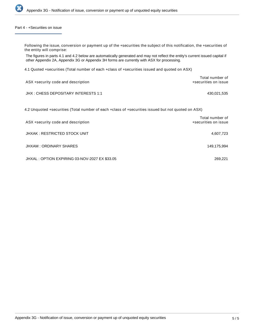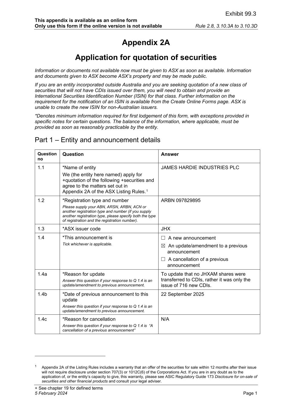 Forward-looking statements are based on the Company’s current expectations, estimates and assumptions and because forward-looking statements address future results, events and conditions, they, by their very nature, involve inherent risks and uncertainties, many of which are unforeseeable and beyond the Company’s control. Such known and unknown risks, uncertainties and other factors may cause actual results, performance or other achievements to differ materially from the anticipated results, performance or achievements expressed, projected or implied by these forward-looking statements. These factors, some of which are discussed under “Risk Factors” in Section 3 of our Form 20-F filed with the Securities and Exchange Commission on 20 May 2025, include, but are not limited to: all matters relating to or arising out of the prior manufacture of products that contained asbestos by current and former Company subsidiaries; required contributions to AICF, any shortfall in AICF funding and the effect of currency exchange rate movements on the amount recorded in the Company’s financial statements as an asbestos liability; compliance with and changes in tax laws and treatments; competition and product pricing in the markets in which the Company operates; the consequences of product failures or defects; exposure to environmental, asbestos, putative consumer class action or other legal proceedings; general economic and market conditions; the supply and cost of raw materials; possible increases in competition and the potential that competitors could copy the Company’s products; compliance with and changes in environmental and health and safety laws; risks of conducting business internationally; compliance with and changes in laws and regulations; currency exchange risks; dependence on customer preference and the concentration of the Company’s customer base; dependence on residential and commercial construction markets; the effect of adverse changes in climate or weather patterns; use of accounting estimates; the AZEK acquisition; and all other risks identified in the Company’s reports filed with Australian, Irish and US securities regulatory agencies and exchanges (as appropriate). The Company cautions you that the foregoing list of factors is not exhaustive and that other risks and uncertainties may cause actual results to differ materially from those referenced in the Company’s forward-looking statements. Forward-looking statements speak only as of the date they are made and are statements of the Company’s current expectations concerning future results, events and conditions. The Company assumes no obligation to update any forward-looking statements or information except as required by law.