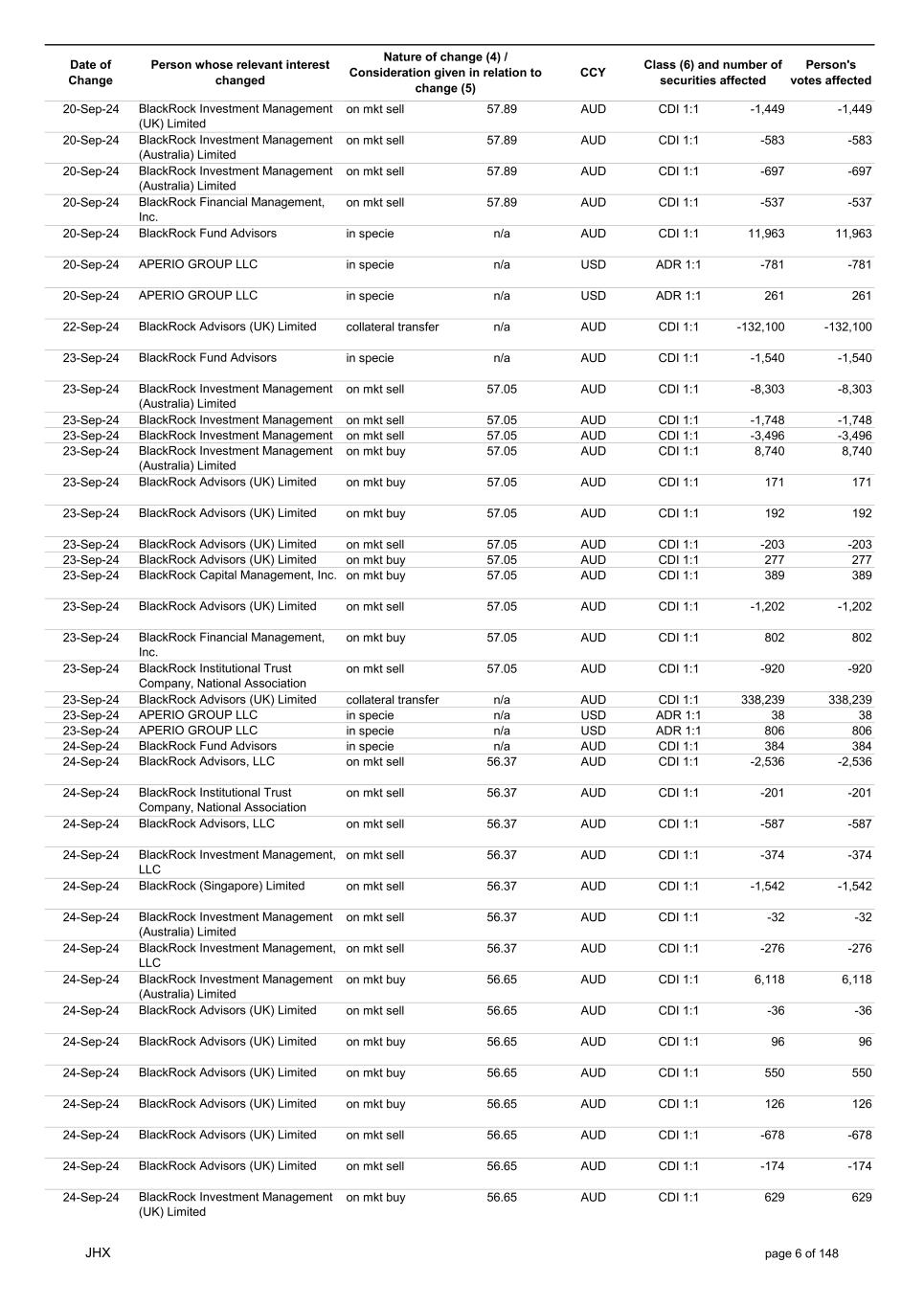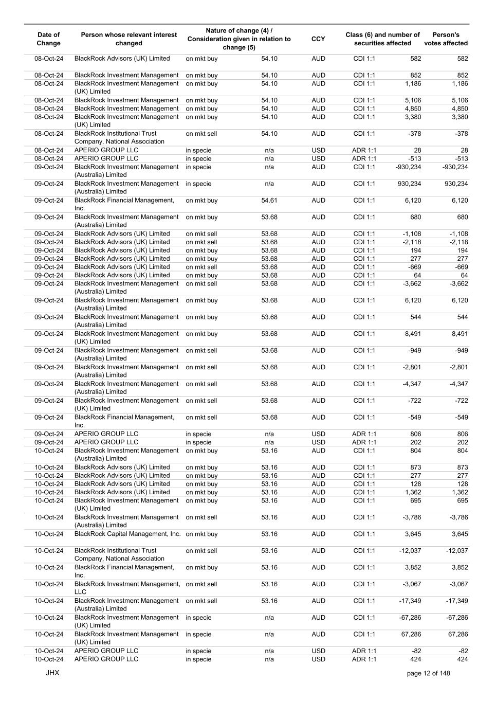 Date of Change Person whose relevant interest changed Nature of change (4) / Consideration given in relation to change (5) Class (6) and number of securities affected Person's votes affected CCY 12-Sep-24 BlackRock Advisors, LLC on mkt sell 53.31 AUD CDI 1:1 -34 -34 12-Sep-24 BlackRock Advisors, LLC on mkt sell 53.31 AUD CDI 1:1 -1,084 -1,084 12-Sep-24 BlackRock Investment Management, LLC on mkt sell 53.31 AUD CDI 1:1 -678 -678 12-Sep-24 BlackRock (Singapore) Limited on mkt sell 53.31 AUD CDI 1:1 -3,436 -3,436 12-Sep-24 BlackRock Investment Management (Australia) Limited on mkt sell 53.31 AUD CDI 1:1 -51 -51 12-Sep-24 BlackRock Investment Management, LLC on mkt sell 53.31 AUD CDI 1:1 -505 -505 12-Sep-24 BlackRock Investment Management (Australia) Limited on mkt buy 53.27 AUD CDI 1:1 4,400 4,400 12-Sep-24 BlackRock Advisors (UK) Limited on mkt buy 53.27 AUD CDI 1:1 291 291 12-Sep-24 BlackRock Advisors (UK) Limited on mkt buy 53.27 AUD CDI 1:1 388 388 12-Sep-24 BlackRock Advisors (UK) Limited on mkt buy 53.27 AUD CDI 1:1 485 485 12-Sep-24 BlackRock Advisors (UK) Limited on mkt buy 53.27 AUD CDI 1:1 1,067 1,067 12-Sep-24 BlackRock Advisors (UK) Limited on mkt sell 53.27 AUD CDI 1:1 -96 -96 12-Sep-24 BlackRock Advisors (UK) Limited on mkt sell 53.27 AUD CDI 1:1 -216 -216 12-Sep-24 BlackRock Fund Advisors in specie n/a AUD CDI 1:1 1,240 1,240 12-Sep-24 BlackRock Advisors (UK) Limited collateral transfer n/a AUD CDI 1:1 -916,306 -916,306 12-Sep-24 APERIO GROUP LLC in specie n/a USD ADR 1:1 29 29 12-Sep-24 APERIO GROUP LLC in specie n/a USD ADR 1:1 2,355 2,355 13-Sep-24 BlackRock Fund Advisors in specie n/a AUD CDI 1:1 220 220 13-Sep-24 BlackRock Investment Management (UK) Limited on mkt sell 53.55 AUD CDI 1:1 -4,337 -4,337 13-Sep-24 BlackRock Institutional Trust Company, National Association on mkt sell 53.21 AUD CDI 1:1 -1,775 -1,775 13-Sep-24 BlackRock Advisors (UK) Limited on mkt sell 53.21 AUD CDI 1:1 -558 -558 13-Sep-24 BlackRock Investment Management (Australia) Limited on mkt buy 53.21 AUD CDI 1:1 4,957 4,957 13-Sep-24 BlackRock Advisors, LLC on mkt sell 53.21 AUD CDI 1:1 -30 -30 13-Sep-24 BlackRock Investment Management (Australia) Limited on mkt buy 53.21 AUD CDI 1:1 4,358 4,358 13-Sep-24 BlackRock Investment Management (Australia) Limited on mkt buy 53.21 AUD CDI 1:1 313 313 13-Sep-24 BlackRock Financial Management, Inc. on mkt sell 53.21 AUD CDI 1:1 -1,366 -1,366 13-Sep-24 BlackRock Financial Management, Inc. on mkt sell 53.21 AUD CDI 1:1 -2,176 -2,176 13-Sep-24 BlackRock Investment Management, LLC on mkt sell 53.21 AUD CDI 1:1 -2,623 -2,623 13-Sep-24 BlackRock Institutional Trust Company, National Association on mkt sell 53.21 AUD CDI 1:1 -287 -287 13-Sep-24 BlackRock Investment Management, LLC on mkt sell 53.21 AUD CDI 1:1 -592 -592 13-Sep-24 BlackRock Financial Management, Inc. on mkt sell 53.21 AUD CDI 1:1 -2,422 -2,422 13-Sep-24 BlackRock Institutional Trust Company, National Association on mkt sell 53.21 AUD CDI 1:1 -423 -423 13-Sep-24 APERIO GROUP LLC in specie n/a USD ADR 1:1 21 21 13-Sep-24 APERIO GROUP LLC in specie n/a USD ADR 1:1 -1,793 -1,793 16-Sep-24 BlackRock Fund Advisors in specie n/a AUD CDI 1:1 1,917 1,917 16-Sep-24 BlackRock Advisors (UK) Limited on mkt buy 53.22 AUD CDI 1:1 1,079 1,079 16-Sep-24 BlackRock Advisors (UK) Limited on mkt sell 53.22 AUD CDI 1:1 -1,079 -1,079 16-Sep-24 BlackRock Advisors (UK) Limited on mkt sell 53.22 AUD CDI 1:1 -1,079 -1,079 16-Sep-24 BlackRock Advisors (UK) Limited on mkt buy 53.22 AUD CDI 1:1 194 194 JHX page 3 of 148