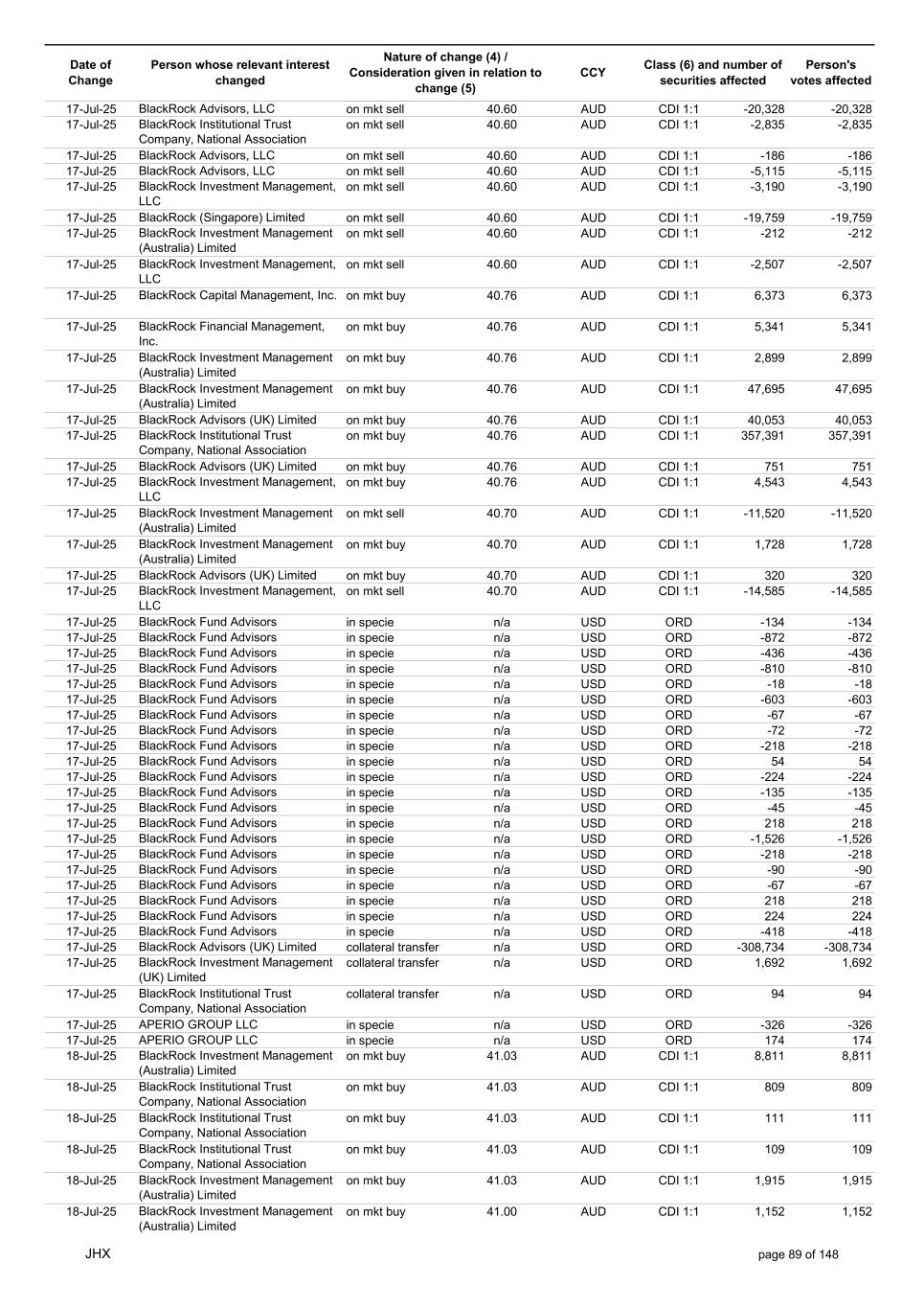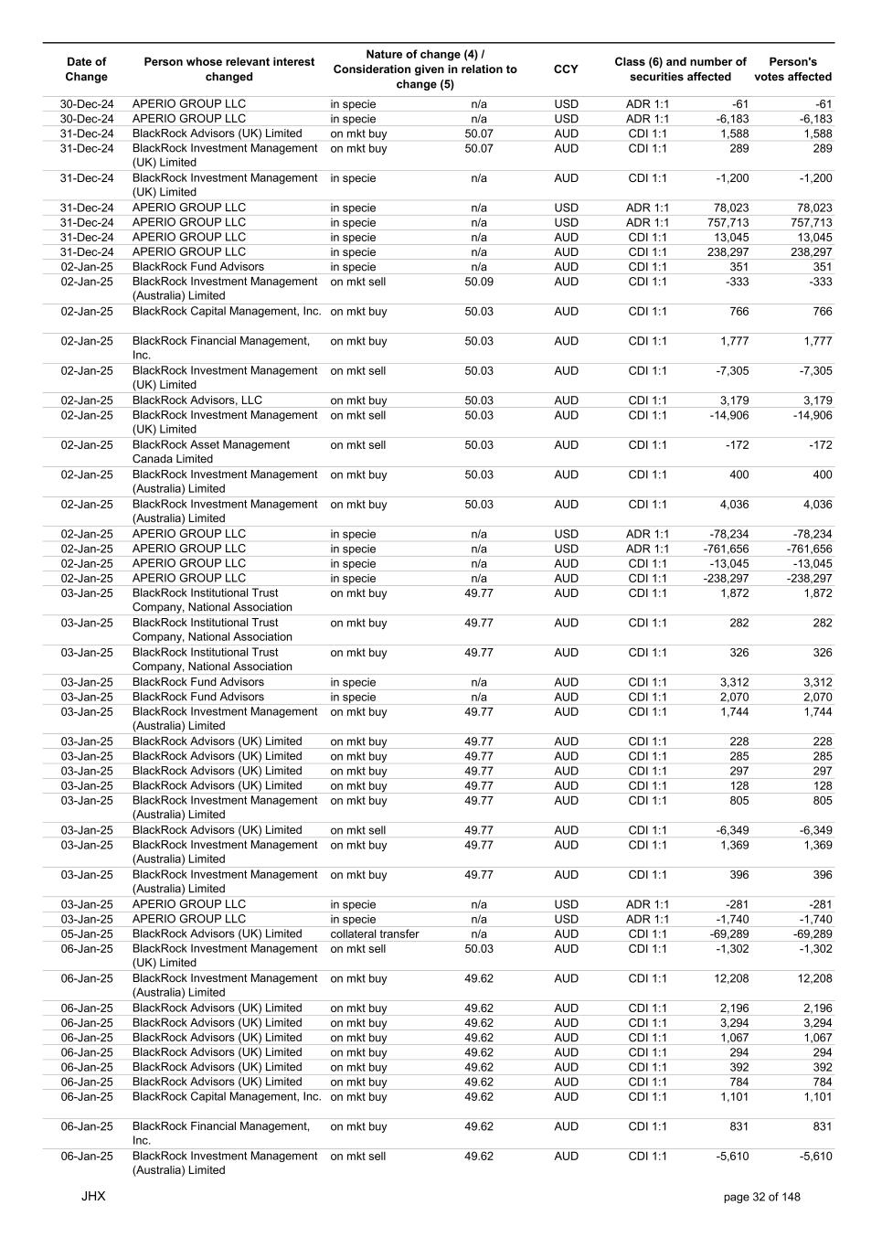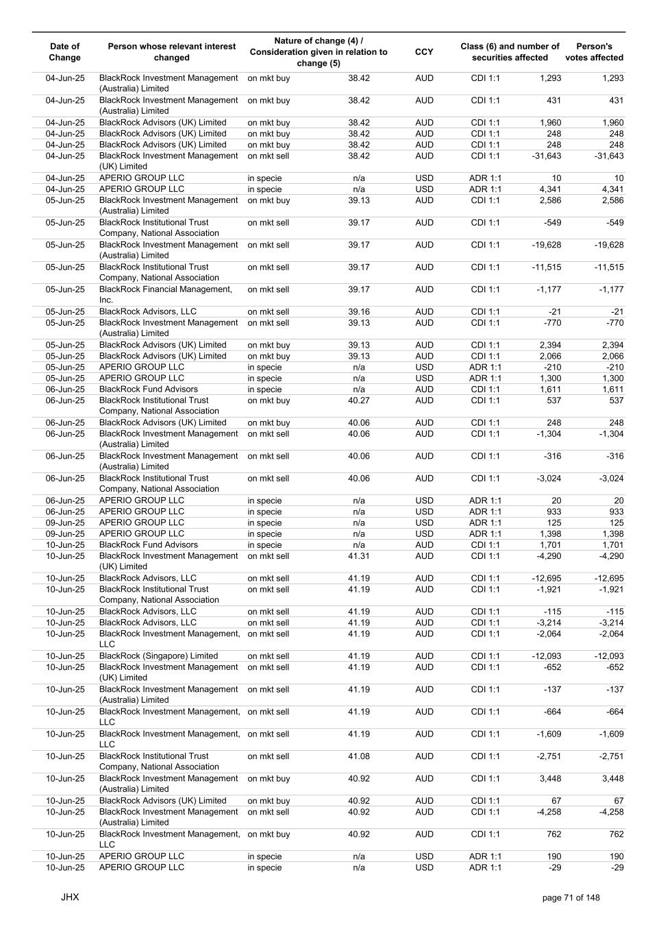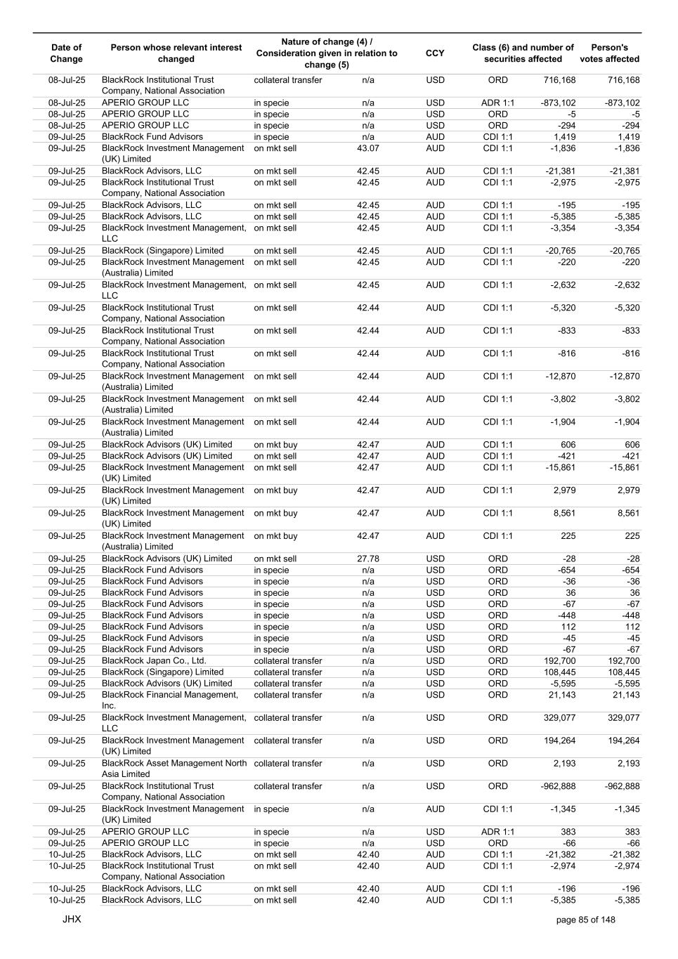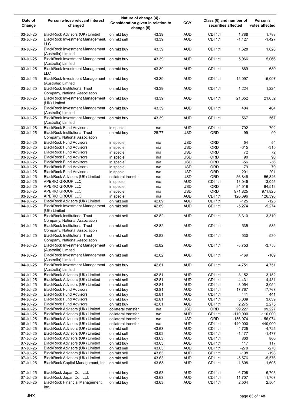 Date of Change Person whose relevant interest changed Nature of change (4) / Consideration given in relation to change (5) Class (6) and number of securities affected Person's votes affected CCY 20-Jun-25 BlackRock Investment Management, LLC on mkt sell 36.88 AUD CDI 1:1 -29,219 -29,219 20-Jun-25 BlackRock Investment Management (UK) Limited on mkt buy 36.88 AUD CDI 1:1 2,954 2,954 20-Jun-25 BlackRock Investment Management (UK) Limited on mkt buy 36.88 AUD CDI 1:1 12,706 12,706 20-Jun-25 BlackRock Investment Management (UK) Limited on mkt sell 36.88 AUD CDI 1:1 -1,224 -1,224 20-Jun-25 APERIO GROUP LLC in specie n/a USD ADR 1:1 -57,504 -57,504 20-Jun-25 APERIO GROUP LLC in specie n/a USD ADR 1:1 -714,219 -714,219 20-Jun-25 APERIO GROUP LLC in specie n/a AUD CDI 1:1 -13,045 -13,045 20-Jun-25 APERIO GROUP LLC in specie n/a AUD CDI 1:1 -183,704 -183,704 22-Jun-25 BlackRock Advisors (UK) Limited collateral transfer n/a AUD CDI 1:1 -686,000 -686,000 23-Jun-25 BlackRock Investment Management (UK) Limited on mkt sell 36.95 AUD CDI 1:1 -15,495 -15,495 23-Jun-25 BlackRock Investment Management, LLC on mkt buy 37.04 AUD CDI 1:1 1,045 1,045 23-Jun-25 BlackRock Investment Management (Australia) Limited on mkt sell 36.85 AUD CDI 1:1 -1,724 -1,724 23-Jun-25 BlackRock Advisors (UK) Limited on mkt sell 36.85 AUD CDI 1:1 -4,420 -4,420 23-Jun-25 BlackRock Advisors (UK) Limited on mkt sell 36.85 AUD CDI 1:1 -91 -91 23-Jun-25 BlackRock Capital Management, Inc. on mkt buy 36.85 AUD CDI 1:1 8,752 8,752 23-Jun-25 BlackRock Financial Management, Inc. on mkt buy 36.85 AUD CDI 1:1 4,340 4,340 23-Jun-25 BlackRock Asset Management Canada Limited on mkt buy 36.85 AUD CDI 1:1 233 233 23-Jun-25 BlackRock Advisors (UK) Limited collateral transfer n/a AUD CDI 1:1 461,097 461,097 23-Jun-25 APERIO GROUP LLC in specie n/a USD ADR 1:1 164 164 23-Jun-25 APERIO GROUP LLC in specie n/a USD ADR 1:1 -977 -977 24-Jun-25 BlackRock Advisors, LLC on mkt sell 37.89 AUD CDI 1:1 -3,056 -3,056 24-Jun-25 BlackRock Institutional Trust Company, National Association on mkt sell 37.89 AUD CDI 1:1 -426 -426 24-Jun-25 BlackRock Advisors, LLC on mkt sell 37.89 AUD CDI 1:1 -49 -49 24-Jun-25 BlackRock Advisors, LLC on mkt sell 37.89 AUD CDI 1:1 -782 -782 24-Jun-25 BlackRock Investment Management, LLC on mkt sell 37.89 AUD CDI 1:1 -496 -496 24-Jun-25 BlackRock Investment Management, LLC on mkt sell 37.99 AUD CDI 1:1 -1,593 -1,593 24-Jun-25 BlackRock (Singapore) Limited on mkt sell 37.89 AUD CDI 1:1 -2,970 -2,970 24-Jun-25 BlackRock Investment Management (Australia) Limited on mkt sell 37.89 AUD CDI 1:1 -35 -35 24-Jun-25 BlackRock Fund Advisors on mkt buy 37.99 AUD CDI 1:1 473 473 24-Jun-25 BlackRock Investment Management, LLC on mkt sell 37.89 AUD CDI 1:1 -393 -393 24-Jun-25 BlackRock Fund Advisors in specie n/a AUD CDI 1:1 -12,738 -12,738 24-Jun-25 BlackRock Advisors (UK) Limited on mkt sell 37.89 AUD CDI 1:1 -1,197 -1,197 24-Jun-25 BlackRock Advisors (UK) Limited on mkt buy 37.89 AUD CDI 1:1 1,180 1,180 24-Jun-25 BlackRock Advisors (UK) Limited on mkt sell 37.89 AUD CDI 1:1 -408 -408 24-Jun-25 BlackRock Advisors (UK) Limited on mkt sell 37.89 AUD CDI 1:1 -1,030 -1,030 24-Jun-25 BlackRock Asset Management Canada Limited on mkt buy 37.89 AUD CDI 1:1 206 206 24-Jun-25 BlackRock Advisors (UK) Limited on mkt buy 37.89 AUD CDI 1:1 229 229 24-Jun-25 BlackRock Institutional Trust Company, National Association on mkt buy 37.89 AUD CDI 1:1 33,796 33,796 24-Jun-25 BlackRock Advisors (UK) Limited collateral transfer n/a AUD CDI 1:1 224,903 224,903 24-Jun-25 APERIO GROUP LLC in specie n/a USD ADR 1:1 418 418 24-Jun-25 APERIO GROUP LLC in specie n/a USD ADR 1:1 2,134 2,134 25-Jun-25 BlackRock Fund Advisors in specie n/a AUD CDI 1:1 -11,842 -11,842 25-Jun-25 BlackRock Advisors, LLC on mkt sell 38.64 AUD CDI 1:1 -2,970 -2,970 25-Jun-25 BlackRock Institutional Trust Company, National Association on mkt sell 38.64 AUD CDI 1:1 -414 -414 25-Jun-25 BlackRock Advisors, LLC on mkt sell 38.64 AUD CDI 1:1 -35 -35 25-Jun-25 BlackRock Advisors, LLC on mkt sell 38.64 AUD CDI 1:1 -761 -761 25-Jun-25 BlackRock Investment Management, LLC on mkt sell 38.64 AUD CDI 1:1 -481 -481 25-Jun-25 BlackRock (Singapore) Limited on mkt sell 38.64 AUD CDI 1:1 -2,887 -2,887 25-Jun-25 BlackRock Investment Management (Australia) Limited on mkt sell 38.64 AUD CDI 1:1 -35 -35 25-Jun-25 BlackRock Investment Management, LLC on mkt sell 38.64 AUD CDI 1:1 -382 -382 25-Jun-25 BlackRock Fund Advisors in specie n/a AUD CDI 1:1 885 885 JHX page 75 of 148