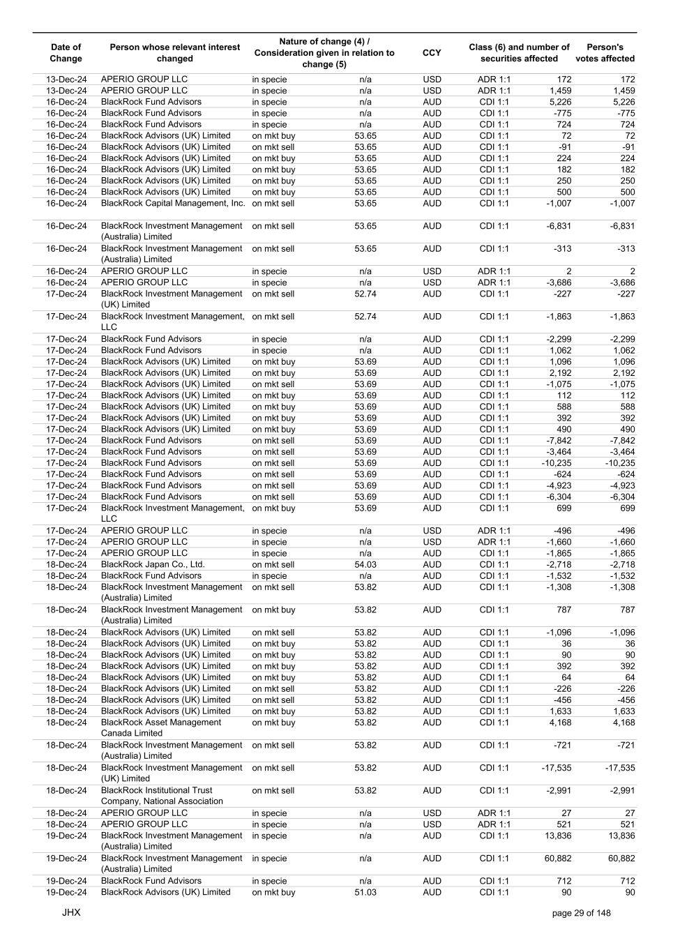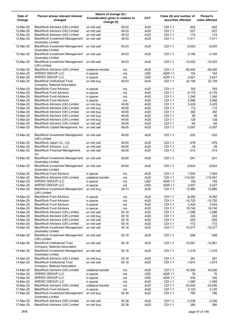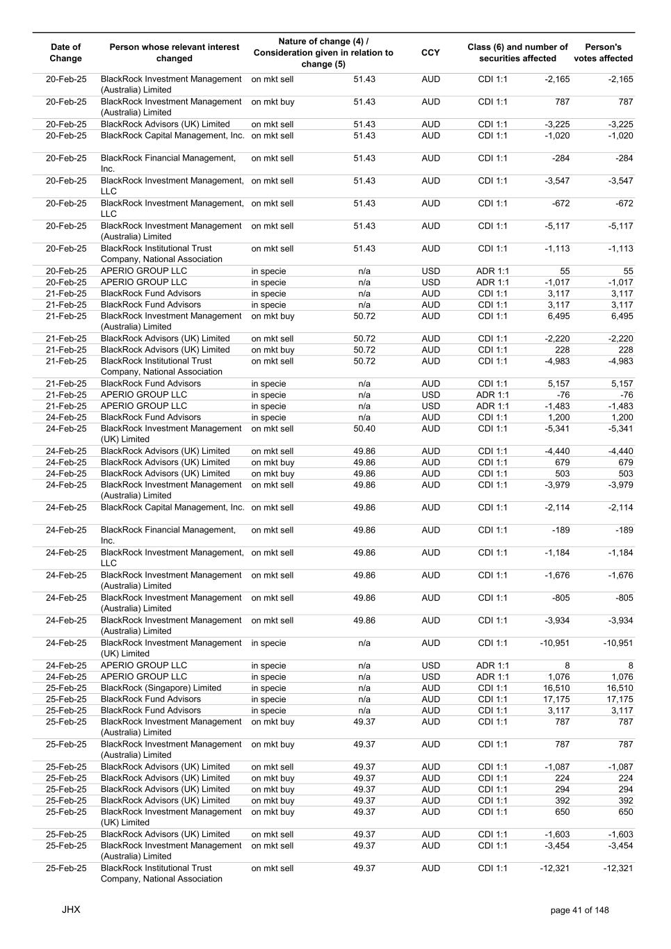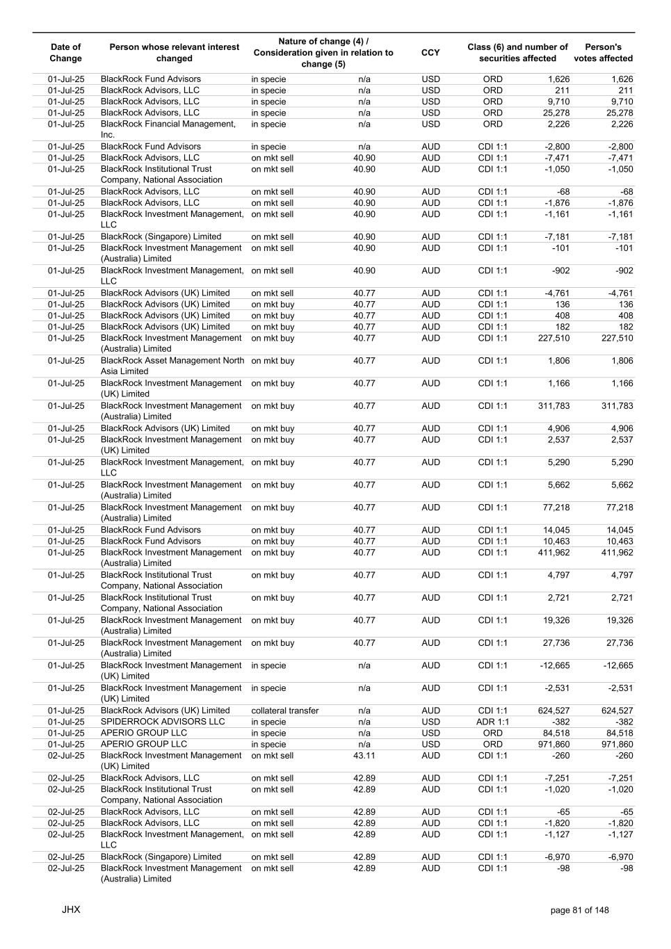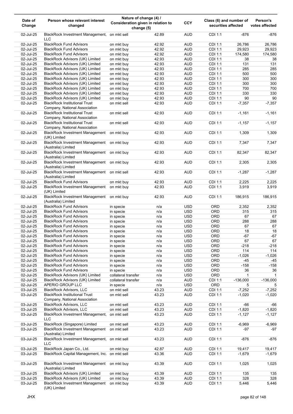 Date of Change Person whose relevant interest changed Nature of change (4) / Consideration given in relation to change (5) Class (6) and number of securities affected Person's votes affected CCY 20-Jun-25 BlackRock Investment Management, LLC on mkt sell 36.88 AUD CDI 1:1 -29,219 -29,219 20-Jun-25 BlackRock Investment Management (UK) Limited on mkt buy 36.88 AUD CDI 1:1 2,954 2,954 20-Jun-25 BlackRock Investment Management (UK) Limited on mkt buy 36.88 AUD CDI 1:1 12,706 12,706 20-Jun-25 BlackRock Investment Management (UK) Limited on mkt sell 36.88 AUD CDI 1:1 -1,224 -1,224 20-Jun-25 APERIO GROUP LLC in specie n/a USD ADR 1:1 -57,504 -57,504 20-Jun-25 APERIO GROUP LLC in specie n/a USD ADR 1:1 -714,219 -714,219 20-Jun-25 APERIO GROUP LLC in specie n/a AUD CDI 1:1 -13,045 -13,045 20-Jun-25 APERIO GROUP LLC in specie n/a AUD CDI 1:1 -183,704 -183,704 22-Jun-25 BlackRock Advisors (UK) Limited collateral transfer n/a AUD CDI 1:1 -686,000 -686,000 23-Jun-25 BlackRock Investment Management (UK) Limited on mkt sell 36.95 AUD CDI 1:1 -15,495 -15,495 23-Jun-25 BlackRock Investment Management, LLC on mkt buy 37.04 AUD CDI 1:1 1,045 1,045 23-Jun-25 BlackRock Investment Management (Australia) Limited on mkt sell 36.85 AUD CDI 1:1 -1,724 -1,724 23-Jun-25 BlackRock Advisors (UK) Limited on mkt sell 36.85 AUD CDI 1:1 -4,420 -4,420 23-Jun-25 BlackRock Advisors (UK) Limited on mkt sell 36.85 AUD CDI 1:1 -91 -91 23-Jun-25 BlackRock Capital Management, Inc. on mkt buy 36.85 AUD CDI 1:1 8,752 8,752 23-Jun-25 BlackRock Financial Management, Inc. on mkt buy 36.85 AUD CDI 1:1 4,340 4,340 23-Jun-25 BlackRock Asset Management Canada Limited on mkt buy 36.85 AUD CDI 1:1 233 233 23-Jun-25 BlackRock Advisors (UK) Limited collateral transfer n/a AUD CDI 1:1 461,097 461,097 23-Jun-25 APERIO GROUP LLC in specie n/a USD ADR 1:1 164 164 23-Jun-25 APERIO GROUP LLC in specie n/a USD ADR 1:1 -977 -977 24-Jun-25 BlackRock Advisors, LLC on mkt sell 37.89 AUD CDI 1:1 -3,056 -3,056 24-Jun-25 BlackRock Institutional Trust Company, National Association on mkt sell 37.89 AUD CDI 1:1 -426 -426 24-Jun-25 BlackRock Advisors, LLC on mkt sell 37.89 AUD CDI 1:1 -49 -49 24-Jun-25 BlackRock Advisors, LLC on mkt sell 37.89 AUD CDI 1:1 -782 -782 24-Jun-25 BlackRock Investment Management, LLC on mkt sell 37.89 AUD CDI 1:1 -496 -496 24-Jun-25 BlackRock Investment Management, LLC on mkt sell 37.99 AUD CDI 1:1 -1,593 -1,593 24-Jun-25 BlackRock (Singapore) Limited on mkt sell 37.89 AUD CDI 1:1 -2,970 -2,970 24-Jun-25 BlackRock Investment Management (Australia) Limited on mkt sell 37.89 AUD CDI 1:1 -35 -35 24-Jun-25 BlackRock Fund Advisors on mkt buy 37.99 AUD CDI 1:1 473 473 24-Jun-25 BlackRock Investment Management, LLC on mkt sell 37.89 AUD CDI 1:1 -393 -393 24-Jun-25 BlackRock Fund Advisors in specie n/a AUD CDI 1:1 -12,738 -12,738 24-Jun-25 BlackRock Advisors (UK) Limited on mkt sell 37.89 AUD CDI 1:1 -1,197 -1,197 24-Jun-25 BlackRock Advisors (UK) Limited on mkt buy 37.89 AUD CDI 1:1 1,180 1,180 24-Jun-25 BlackRock Advisors (UK) Limited on mkt sell 37.89 AUD CDI 1:1 -408 -408 24-Jun-25 BlackRock Advisors (UK) Limited on mkt sell 37.89 AUD CDI 1:1 -1,030 -1,030 24-Jun-25 BlackRock Asset Management Canada Limited on mkt buy 37.89 AUD CDI 1:1 206 206 24-Jun-25 BlackRock Advisors (UK) Limited on mkt buy 37.89 AUD CDI 1:1 229 229 24-Jun-25 BlackRock Institutional Trust Company, National Association on mkt buy 37.89 AUD CDI 1:1 33,796 33,796 24-Jun-25 BlackRock Advisors (UK) Limited collateral transfer n/a AUD CDI 1:1 224,903 224,903 24-Jun-25 APERIO GROUP LLC in specie n/a USD ADR 1:1 418 418 24-Jun-25 APERIO GROUP LLC in specie n/a USD ADR 1:1 2,134 2,134 25-Jun-25 BlackRock Fund Advisors in specie n/a AUD CDI 1:1 -11,842 -11,842 25-Jun-25 BlackRock Advisors, LLC on mkt sell 38.64 AUD CDI 1:1 -2,970 -2,970 25-Jun-25 BlackRock Institutional Trust Company, National Association on mkt sell 38.64 AUD CDI 1:1 -414 -414 25-Jun-25 BlackRock Advisors, LLC on mkt sell 38.64 AUD CDI 1:1 -35 -35 25-Jun-25 BlackRock Advisors, LLC on mkt sell 38.64 AUD CDI 1:1 -761 -761 25-Jun-25 BlackRock Investment Management, LLC on mkt sell 38.64 AUD CDI 1:1 -481 -481 25-Jun-25 BlackRock (Singapore) Limited on mkt sell 38.64 AUD CDI 1:1 -2,887 -2,887 25-Jun-25 BlackRock Investment Management (Australia) Limited on mkt sell 38.64 AUD CDI 1:1 -35 -35 25-Jun-25 BlackRock Investment Management, LLC on mkt sell 38.64 AUD CDI 1:1 -382 -382 25-Jun-25 BlackRock Fund Advisors in specie n/a AUD CDI 1:1 885 885 JHX page 75 of 148