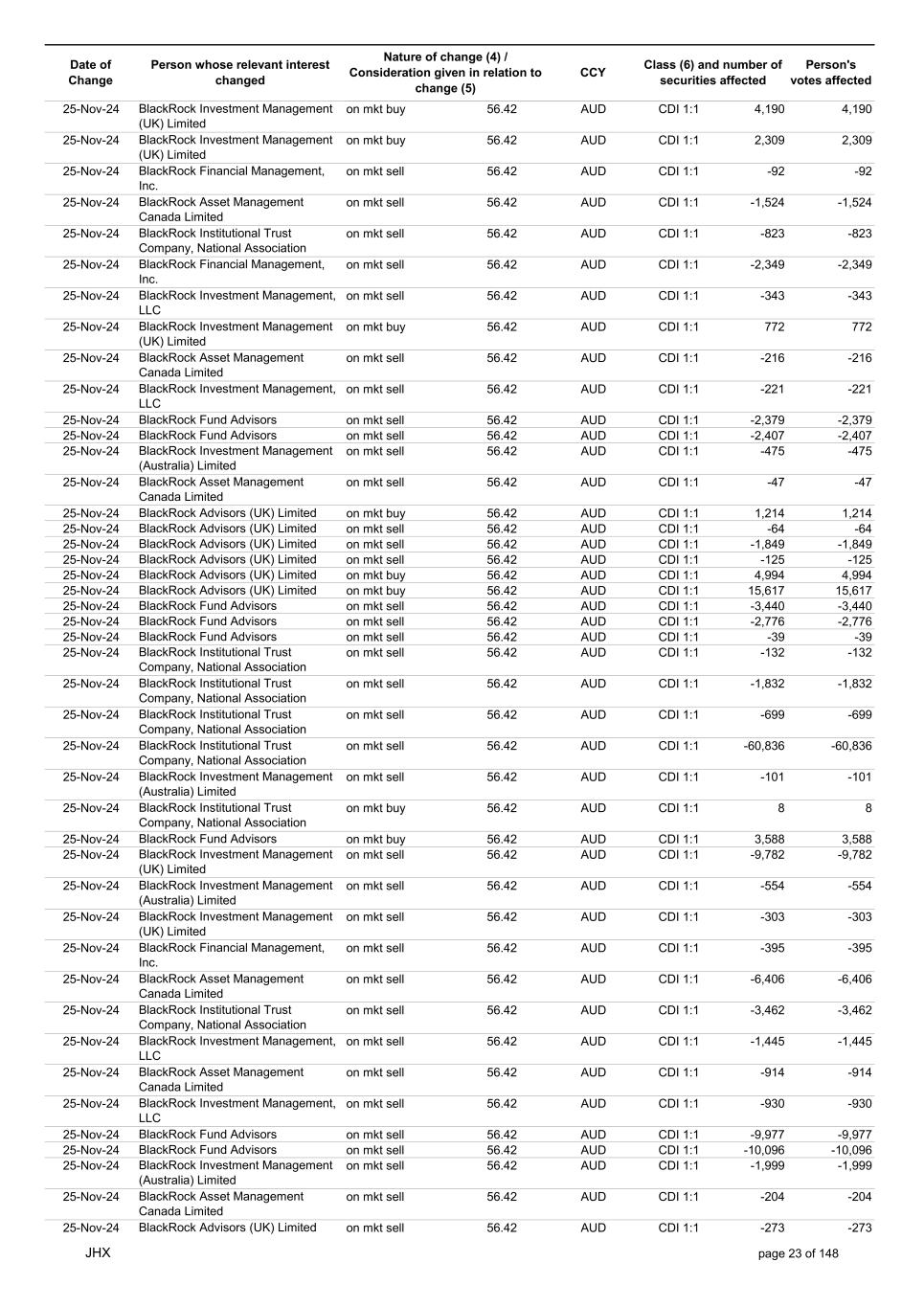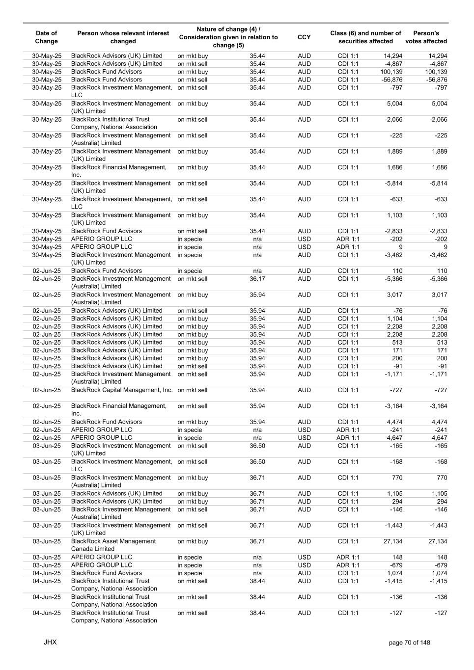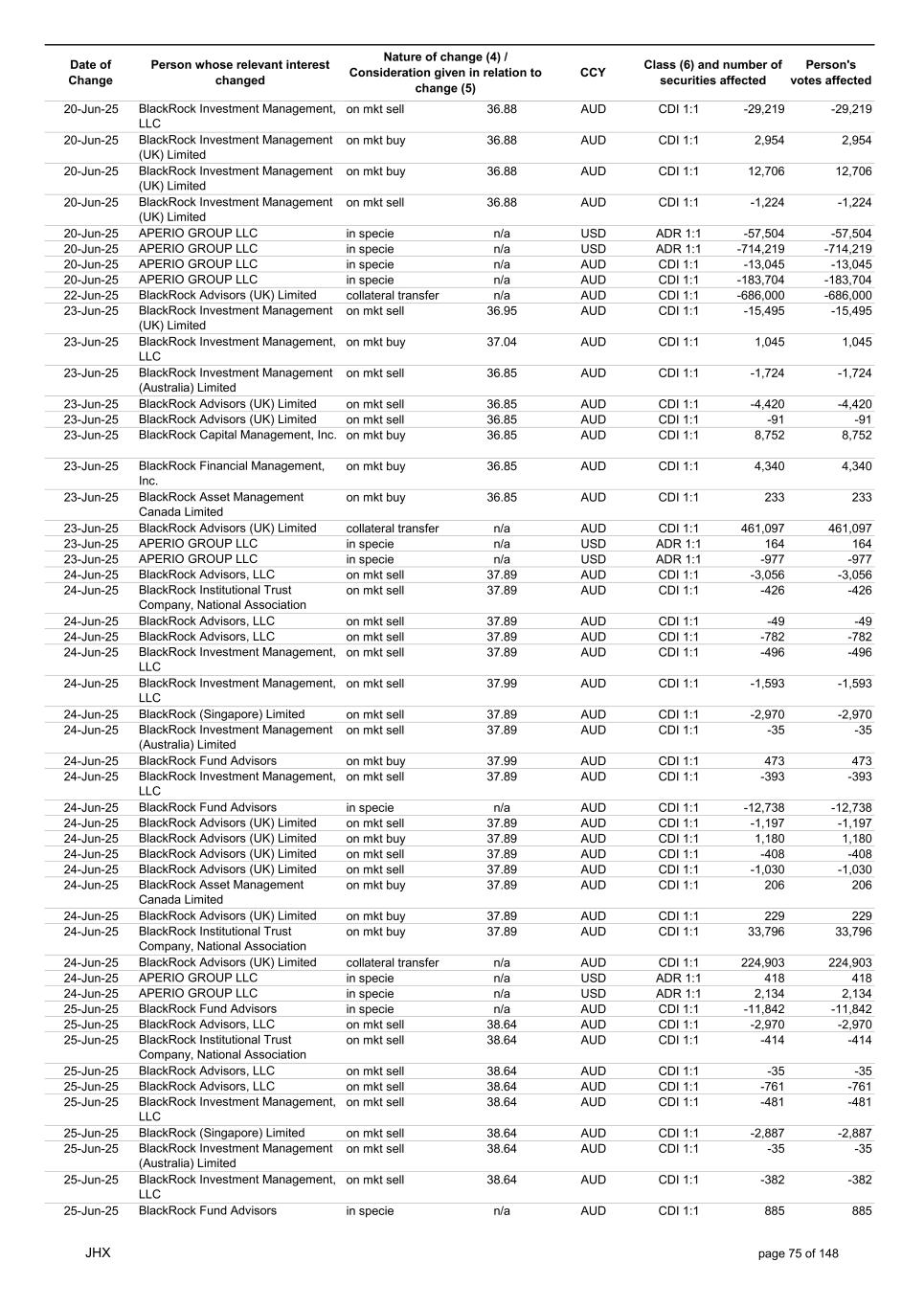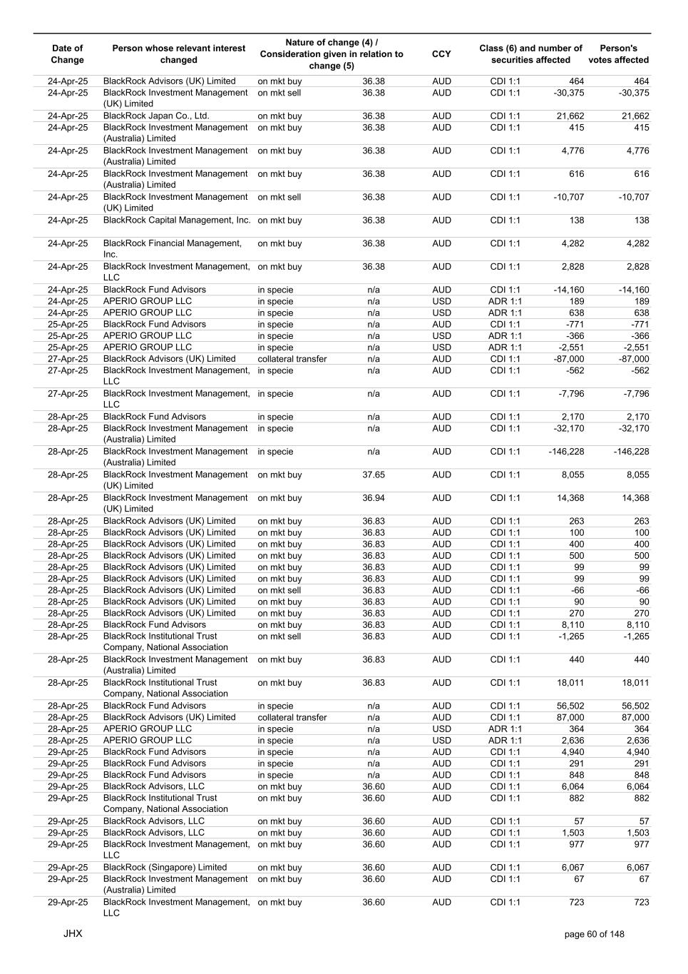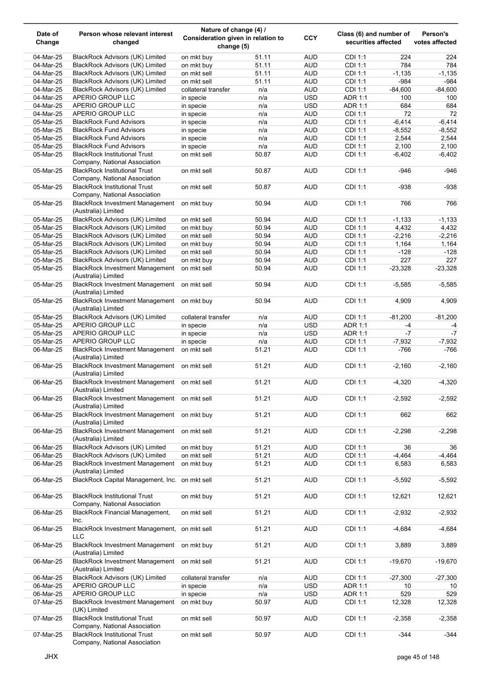 Date of Change Person whose relevant interest changed Nature of change (4) / Consideration given in relation to change (5) Class (6) and number of securities affected Person's votes affected CCY 20-Jun-25 BlackRock Investment Management, LLC on mkt sell 36.88 AUD CDI 1:1 -29,219 -29,219 20-Jun-25 BlackRock Investment Management (UK) Limited on mkt buy 36.88 AUD CDI 1:1 2,954 2,954 20-Jun-25 BlackRock Investment Management (UK) Limited on mkt buy 36.88 AUD CDI 1:1 12,706 12,706 20-Jun-25 BlackRock Investment Management (UK) Limited on mkt sell 36.88 AUD CDI 1:1 -1,224 -1,224 20-Jun-25 APERIO GROUP LLC in specie n/a USD ADR 1:1 -57,504 -57,504 20-Jun-25 APERIO GROUP LLC in specie n/a USD ADR 1:1 -714,219 -714,219 20-Jun-25 APERIO GROUP LLC in specie n/a AUD CDI 1:1 -13,045 -13,045 20-Jun-25 APERIO GROUP LLC in specie n/a AUD CDI 1:1 -183,704 -183,704 22-Jun-25 BlackRock Advisors (UK) Limited collateral transfer n/a AUD CDI 1:1 -686,000 -686,000 23-Jun-25 BlackRock Investment Management (UK) Limited on mkt sell 36.95 AUD CDI 1:1 -15,495 -15,495 23-Jun-25 BlackRock Investment Management, LLC on mkt buy 37.04 AUD CDI 1:1 1,045 1,045 23-Jun-25 BlackRock Investment Management (Australia) Limited on mkt sell 36.85 AUD CDI 1:1 -1,724 -1,724 23-Jun-25 BlackRock Advisors (UK) Limited on mkt sell 36.85 AUD CDI 1:1 -4,420 -4,420 23-Jun-25 BlackRock Advisors (UK) Limited on mkt sell 36.85 AUD CDI 1:1 -91 -91 23-Jun-25 BlackRock Capital Management, Inc. on mkt buy 36.85 AUD CDI 1:1 8,752 8,752 23-Jun-25 BlackRock Financial Management, Inc. on mkt buy 36.85 AUD CDI 1:1 4,340 4,340 23-Jun-25 BlackRock Asset Management Canada Limited on mkt buy 36.85 AUD CDI 1:1 233 233 23-Jun-25 BlackRock Advisors (UK) Limited collateral transfer n/a AUD CDI 1:1 461,097 461,097 23-Jun-25 APERIO GROUP LLC in specie n/a USD ADR 1:1 164 164 23-Jun-25 APERIO GROUP LLC in specie n/a USD ADR 1:1 -977 -977 24-Jun-25 BlackRock Advisors, LLC on mkt sell 37.89 AUD CDI 1:1 -3,056 -3,056 24-Jun-25 BlackRock Institutional Trust Company, National Association on mkt sell 37.89 AUD CDI 1:1 -426 -426 24-Jun-25 BlackRock Advisors, LLC on mkt sell 37.89 AUD CDI 1:1 -49 -49 24-Jun-25 BlackRock Advisors, LLC on mkt sell 37.89 AUD CDI 1:1 -782 -782 24-Jun-25 BlackRock Investment Management, LLC on mkt sell 37.89 AUD CDI 1:1 -496 -496 24-Jun-25 BlackRock Investment Management, LLC on mkt sell 37.99 AUD CDI 1:1 -1,593 -1,593 24-Jun-25 BlackRock (Singapore) Limited on mkt sell 37.89 AUD CDI 1:1 -2,970 -2,970 24-Jun-25 BlackRock Investment Management (Australia) Limited on mkt sell 37.89 AUD CDI 1:1 -35 -35 24-Jun-25 BlackRock Fund Advisors on mkt buy 37.99 AUD CDI 1:1 473 473 24-Jun-25 BlackRock Investment Management, LLC on mkt sell 37.89 AUD CDI 1:1 -393 -393 24-Jun-25 BlackRock Fund Advisors in specie n/a AUD CDI 1:1 -12,738 -12,738 24-Jun-25 BlackRock Advisors (UK) Limited on mkt sell 37.89 AUD CDI 1:1 -1,197 -1,197 24-Jun-25 BlackRock Advisors (UK) Limited on mkt buy 37.89 AUD CDI 1:1 1,180 1,180 24-Jun-25 BlackRock Advisors (UK) Limited on mkt sell 37.89 AUD CDI 1:1 -408 -408 24-Jun-25 BlackRock Advisors (UK) Limited on mkt sell 37.89 AUD CDI 1:1 -1,030 -1,030 24-Jun-25 BlackRock Asset Management Canada Limited on mkt buy 37.89 AUD CDI 1:1 206 206 24-Jun-25 BlackRock Advisors (UK) Limited on mkt buy 37.89 AUD CDI 1:1 229 229 24-Jun-25 BlackRock Institutional Trust Company, National Association on mkt buy 37.89 AUD CDI 1:1 33,796 33,796 24-Jun-25 BlackRock Advisors (UK) Limited collateral transfer n/a AUD CDI 1:1 224,903 224,903 24-Jun-25 APERIO GROUP LLC in specie n/a USD ADR 1:1 418 418 24-Jun-25 APERIO GROUP LLC in specie n/a USD ADR 1:1 2,134 2,134 25-Jun-25 BlackRock Fund Advisors in specie n/a AUD CDI 1:1 -11,842 -11,842 25-Jun-25 BlackRock Advisors, LLC on mkt sell 38.64 AUD CDI 1:1 -2,970 -2,970 25-Jun-25 BlackRock Institutional Trust Company, National Association on mkt sell 38.64 AUD CDI 1:1 -414 -414 25-Jun-25 BlackRock Advisors, LLC on mkt sell 38.64 AUD CDI 1:1 -35 -35 25-Jun-25 BlackRock Advisors, LLC on mkt sell 38.64 AUD CDI 1:1 -761 -761 25-Jun-25 BlackRock Investment Management, LLC on mkt sell 38.64 AUD CDI 1:1 -481 -481 25-Jun-25 BlackRock (Singapore) Limited on mkt sell 38.64 AUD CDI 1:1 -2,887 -2,887 25-Jun-25 BlackRock Investment Management (Australia) Limited on mkt sell 38.64 AUD CDI 1:1 -35 -35 25-Jun-25 BlackRock Investment Management, LLC on mkt sell 38.64 AUD CDI 1:1 -382 -382 25-Jun-25 BlackRock Fund Advisors in specie n/a AUD CDI 1:1 885 885 JHX page 75 of 148