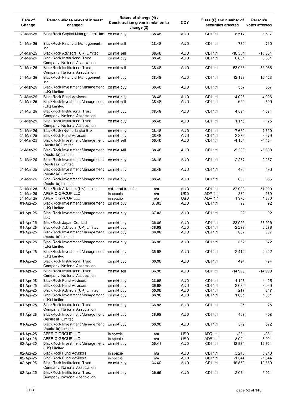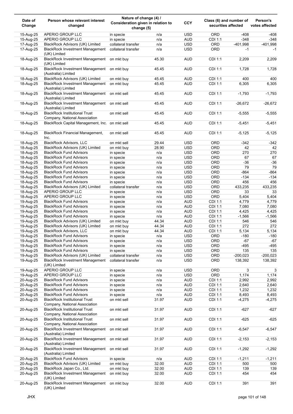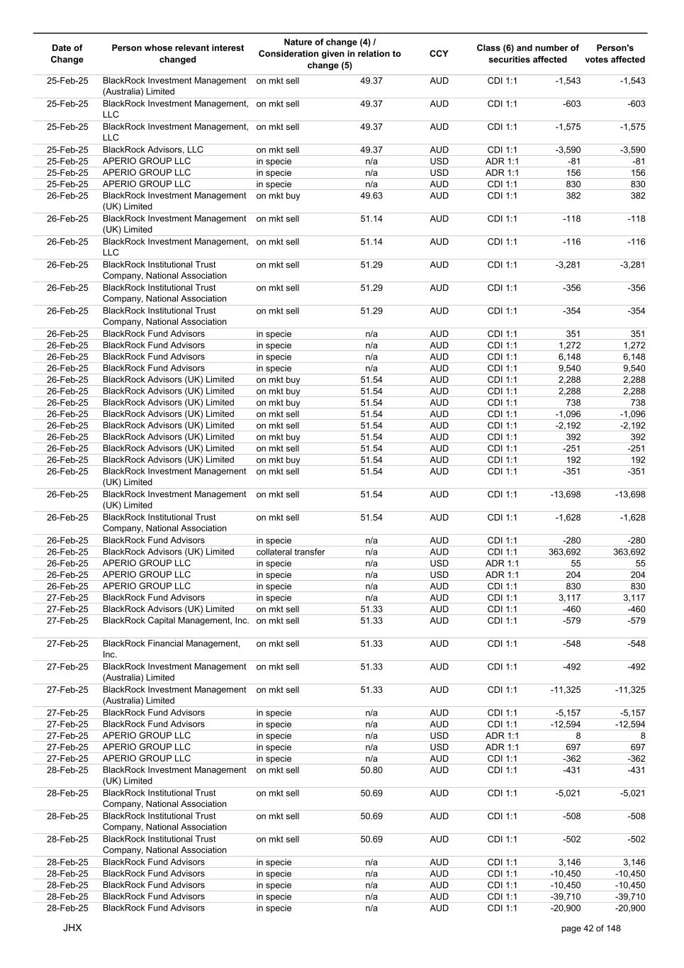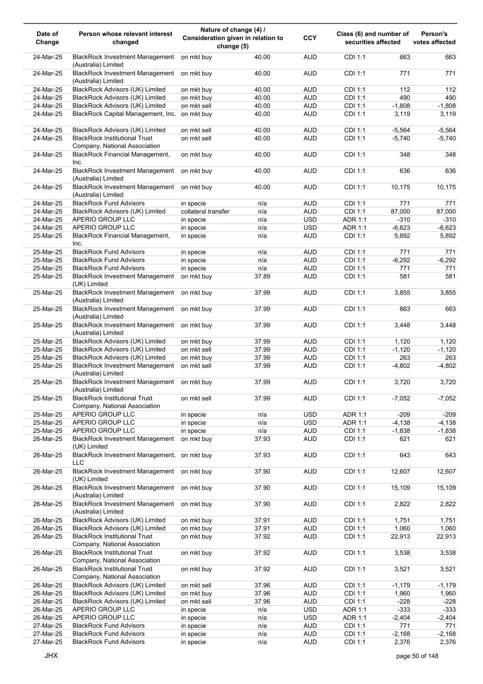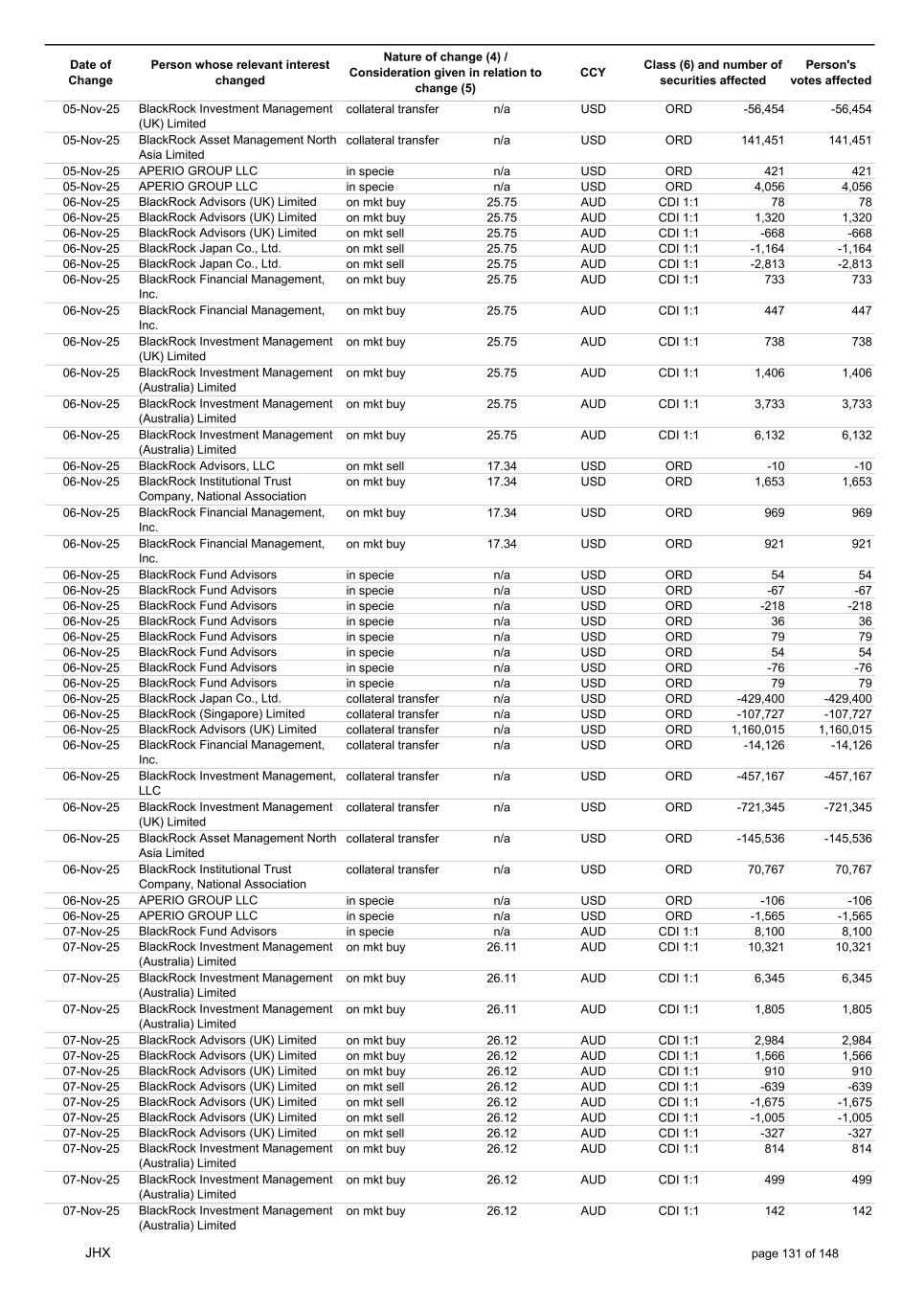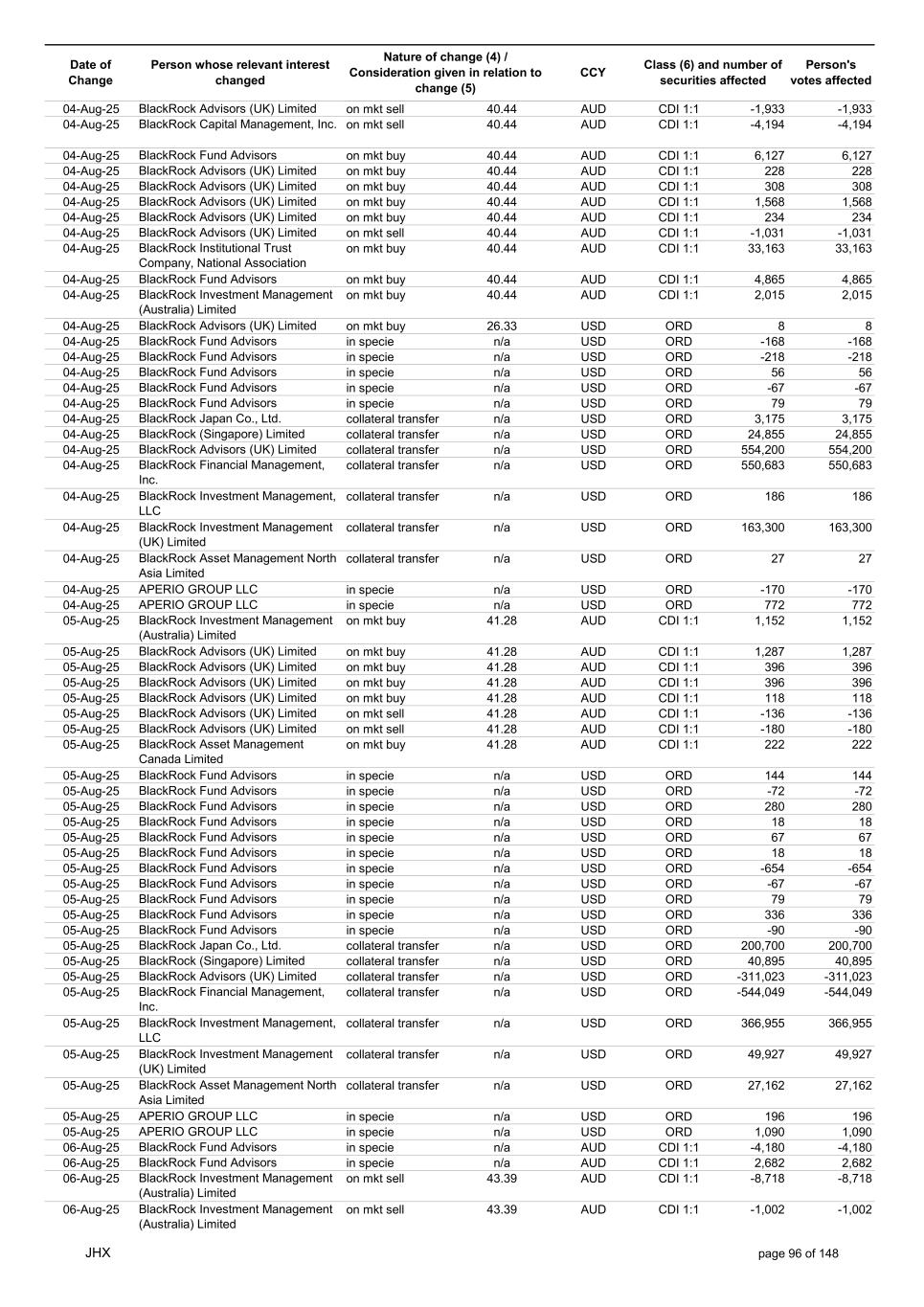 Date of Change Person whose relevant interest changed Nature of change (4) / Consideration given in relation to change (5) Class (6) and number of securities affected Person's votes affected CCY 20-Jun-25 BlackRock Investment Management, LLC on mkt sell 36.88 AUD CDI 1:1 -29,219 -29,219 20-Jun-25 BlackRock Investment Management (UK) Limited on mkt buy 36.88 AUD CDI 1:1 2,954 2,954 20-Jun-25 BlackRock Investment Management (UK) Limited on mkt buy 36.88 AUD CDI 1:1 12,706 12,706 20-Jun-25 BlackRock Investment Management (UK) Limited on mkt sell 36.88 AUD CDI 1:1 -1,224 -1,224 20-Jun-25 APERIO GROUP LLC in specie n/a USD ADR 1:1 -57,504 -57,504 20-Jun-25 APERIO GROUP LLC in specie n/a USD ADR 1:1 -714,219 -714,219 20-Jun-25 APERIO GROUP LLC in specie n/a AUD CDI 1:1 -13,045 -13,045 20-Jun-25 APERIO GROUP LLC in specie n/a AUD CDI 1:1 -183,704 -183,704 22-Jun-25 BlackRock Advisors (UK) Limited collateral transfer n/a AUD CDI 1:1 -686,000 -686,000 23-Jun-25 BlackRock Investment Management (UK) Limited on mkt sell 36.95 AUD CDI 1:1 -15,495 -15,495 23-Jun-25 BlackRock Investment Management, LLC on mkt buy 37.04 AUD CDI 1:1 1,045 1,045 23-Jun-25 BlackRock Investment Management (Australia) Limited on mkt sell 36.85 AUD CDI 1:1 -1,724 -1,724 23-Jun-25 BlackRock Advisors (UK) Limited on mkt sell 36.85 AUD CDI 1:1 -4,420 -4,420 23-Jun-25 BlackRock Advisors (UK) Limited on mkt sell 36.85 AUD CDI 1:1 -91 -91 23-Jun-25 BlackRock Capital Management, Inc. on mkt buy 36.85 AUD CDI 1:1 8,752 8,752 23-Jun-25 BlackRock Financial Management, Inc. on mkt buy 36.85 AUD CDI 1:1 4,340 4,340 23-Jun-25 BlackRock Asset Management Canada Limited on mkt buy 36.85 AUD CDI 1:1 233 233 23-Jun-25 BlackRock Advisors (UK) Limited collateral transfer n/a AUD CDI 1:1 461,097 461,097 23-Jun-25 APERIO GROUP LLC in specie n/a USD ADR 1:1 164 164 23-Jun-25 APERIO GROUP LLC in specie n/a USD ADR 1:1 -977 -977 24-Jun-25 BlackRock Advisors, LLC on mkt sell 37.89 AUD CDI 1:1 -3,056 -3,056 24-Jun-25 BlackRock Institutional Trust Company, National Association on mkt sell 37.89 AUD CDI 1:1 -426 -426 24-Jun-25 BlackRock Advisors, LLC on mkt sell 37.89 AUD CDI 1:1 -49 -49 24-Jun-25 BlackRock Advisors, LLC on mkt sell 37.89 AUD CDI 1:1 -782 -782 24-Jun-25 BlackRock Investment Management, LLC on mkt sell 37.89 AUD CDI 1:1 -496 -496 24-Jun-25 BlackRock Investment Management, LLC on mkt sell 37.99 AUD CDI 1:1 -1,593 -1,593 24-Jun-25 BlackRock (Singapore) Limited on mkt sell 37.89 AUD CDI 1:1 -2,970 -2,970 24-Jun-25 BlackRock Investment Management (Australia) Limited on mkt sell 37.89 AUD CDI 1:1 -35 -35 24-Jun-25 BlackRock Fund Advisors on mkt buy 37.99 AUD CDI 1:1 473 473 24-Jun-25 BlackRock Investment Management, LLC on mkt sell 37.89 AUD CDI 1:1 -393 -393 24-Jun-25 BlackRock Fund Advisors in specie n/a AUD CDI 1:1 -12,738 -12,738 24-Jun-25 BlackRock Advisors (UK) Limited on mkt sell 37.89 AUD CDI 1:1 -1,197 -1,197 24-Jun-25 BlackRock Advisors (UK) Limited on mkt buy 37.89 AUD CDI 1:1 1,180 1,180 24-Jun-25 BlackRock Advisors (UK) Limited on mkt sell 37.89 AUD CDI 1:1 -408 -408 24-Jun-25 BlackRock Advisors (UK) Limited on mkt sell 37.89 AUD CDI 1:1 -1,030 -1,030 24-Jun-25 BlackRock Asset Management Canada Limited on mkt buy 37.89 AUD CDI 1:1 206 206 24-Jun-25 BlackRock Advisors (UK) Limited on mkt buy 37.89 AUD CDI 1:1 229 229 24-Jun-25 BlackRock Institutional Trust Company, National Association on mkt buy 37.89 AUD CDI 1:1 33,796 33,796 24-Jun-25 BlackRock Advisors (UK) Limited collateral transfer n/a AUD CDI 1:1 224,903 224,903 24-Jun-25 APERIO GROUP LLC in specie n/a USD ADR 1:1 418 418 24-Jun-25 APERIO GROUP LLC in specie n/a USD ADR 1:1 2,134 2,134 25-Jun-25 BlackRock Fund Advisors in specie n/a AUD CDI 1:1 -11,842 -11,842 25-Jun-25 BlackRock Advisors, LLC on mkt sell 38.64 AUD CDI 1:1 -2,970 -2,970 25-Jun-25 BlackRock Institutional Trust Company, National Association on mkt sell 38.64 AUD CDI 1:1 -414 -414 25-Jun-25 BlackRock Advisors, LLC on mkt sell 38.64 AUD CDI 1:1 -35 -35 25-Jun-25 BlackRock Advisors, LLC on mkt sell 38.64 AUD CDI 1:1 -761 -761 25-Jun-25 BlackRock Investment Management, LLC on mkt sell 38.64 AUD CDI 1:1 -481 -481 25-Jun-25 BlackRock (Singapore) Limited on mkt sell 38.64 AUD CDI 1:1 -2,887 -2,887 25-Jun-25 BlackRock Investment Management (Australia) Limited on mkt sell 38.64 AUD CDI 1:1 -35 -35 25-Jun-25 BlackRock Investment Management, LLC on mkt sell 38.64 AUD CDI 1:1 -382 -382 25-Jun-25 BlackRock Fund Advisors in specie n/a AUD CDI 1:1 885 885 JHX page 75 of 148