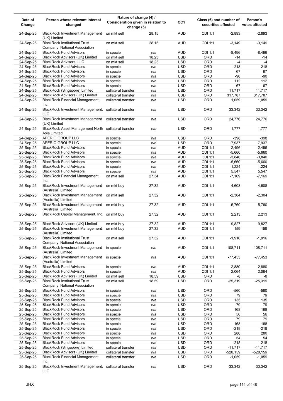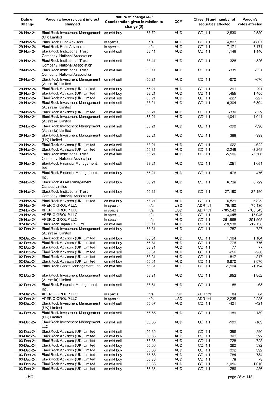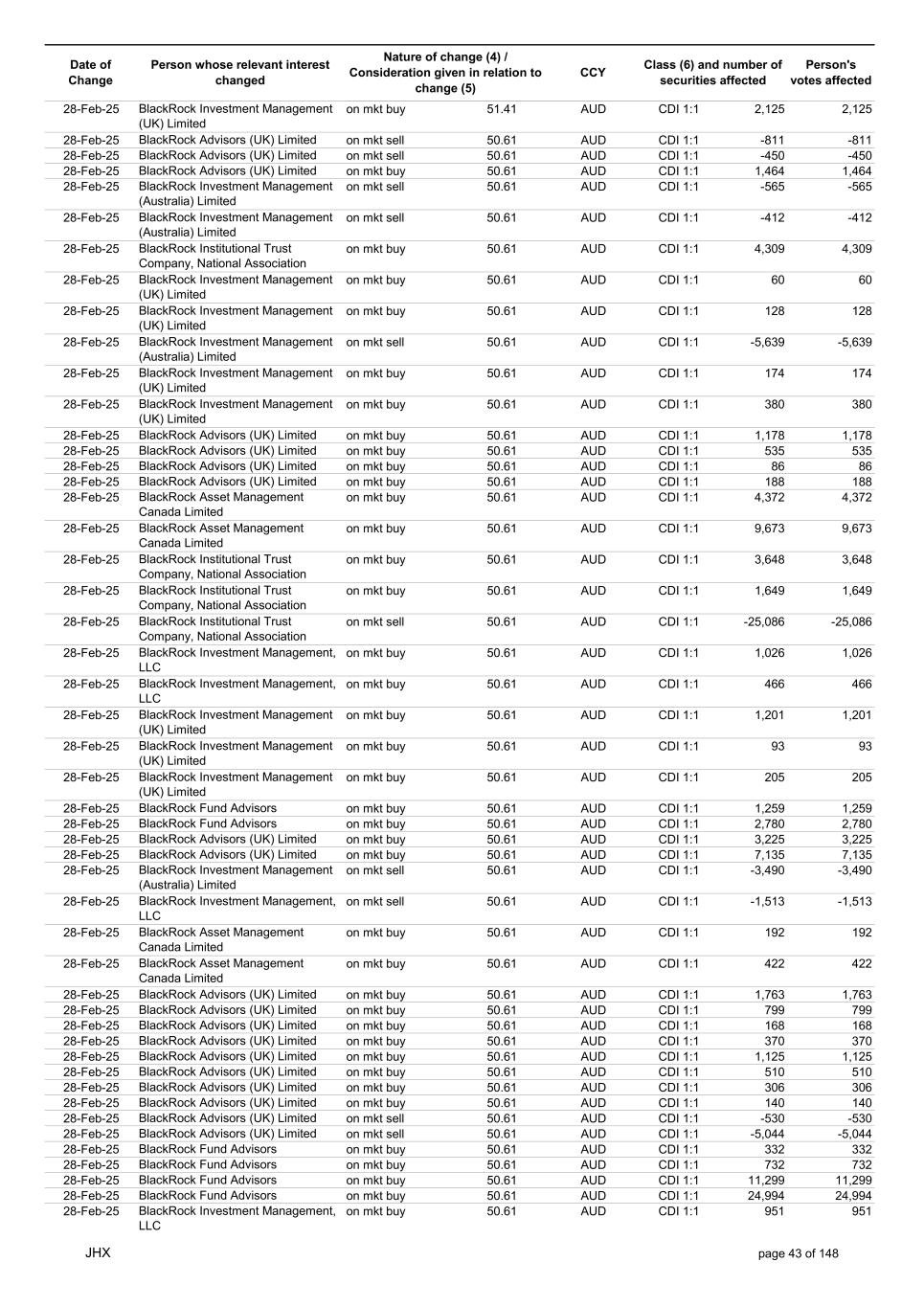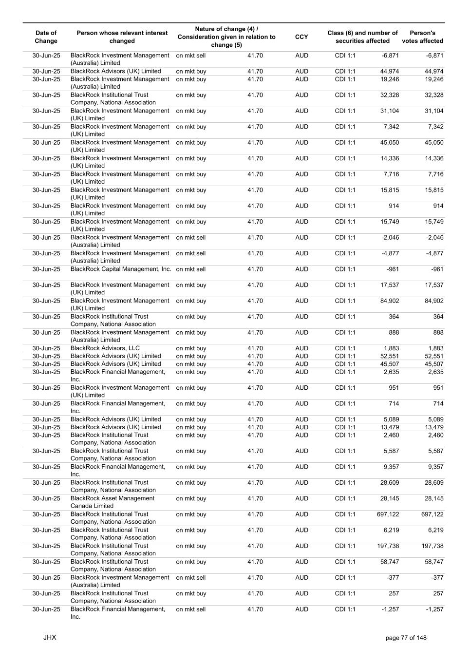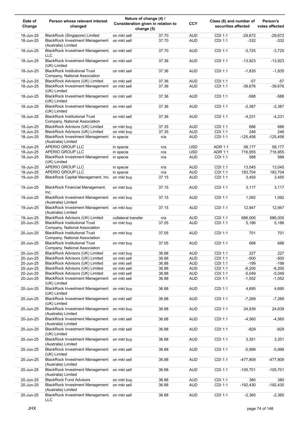 Date of Change Person whose relevant interest changed Nature of change (4) / Consideration given in relation to change (5) Class (6) and number of securities affected Person's votes affected CCY 20-Jun-25 BlackRock Investment Management, LLC on mkt sell 36.88 AUD CDI 1:1 -29,219 -29,219 20-Jun-25 BlackRock Investment Management (UK) Limited on mkt buy 36.88 AUD CDI 1:1 2,954 2,954 20-Jun-25 BlackRock Investment Management (UK) Limited on mkt buy 36.88 AUD CDI 1:1 12,706 12,706 20-Jun-25 BlackRock Investment Management (UK) Limited on mkt sell 36.88 AUD CDI 1:1 -1,224 -1,224 20-Jun-25 APERIO GROUP LLC in specie n/a USD ADR 1:1 -57,504 -57,504 20-Jun-25 APERIO GROUP LLC in specie n/a USD ADR 1:1 -714,219 -714,219 20-Jun-25 APERIO GROUP LLC in specie n/a AUD CDI 1:1 -13,045 -13,045 20-Jun-25 APERIO GROUP LLC in specie n/a AUD CDI 1:1 -183,704 -183,704 22-Jun-25 BlackRock Advisors (UK) Limited collateral transfer n/a AUD CDI 1:1 -686,000 -686,000 23-Jun-25 BlackRock Investment Management (UK) Limited on mkt sell 36.95 AUD CDI 1:1 -15,495 -15,495 23-Jun-25 BlackRock Investment Management, LLC on mkt buy 37.04 AUD CDI 1:1 1,045 1,045 23-Jun-25 BlackRock Investment Management (Australia) Limited on mkt sell 36.85 AUD CDI 1:1 -1,724 -1,724 23-Jun-25 BlackRock Advisors (UK) Limited on mkt sell 36.85 AUD CDI 1:1 -4,420 -4,420 23-Jun-25 BlackRock Advisors (UK) Limited on mkt sell 36.85 AUD CDI 1:1 -91 -91 23-Jun-25 BlackRock Capital Management, Inc. on mkt buy 36.85 AUD CDI 1:1 8,752 8,752 23-Jun-25 BlackRock Financial Management, Inc. on mkt buy 36.85 AUD CDI 1:1 4,340 4,340 23-Jun-25 BlackRock Asset Management Canada Limited on mkt buy 36.85 AUD CDI 1:1 233 233 23-Jun-25 BlackRock Advisors (UK) Limited collateral transfer n/a AUD CDI 1:1 461,097 461,097 23-Jun-25 APERIO GROUP LLC in specie n/a USD ADR 1:1 164 164 23-Jun-25 APERIO GROUP LLC in specie n/a USD ADR 1:1 -977 -977 24-Jun-25 BlackRock Advisors, LLC on mkt sell 37.89 AUD CDI 1:1 -3,056 -3,056 24-Jun-25 BlackRock Institutional Trust Company, National Association on mkt sell 37.89 AUD CDI 1:1 -426 -426 24-Jun-25 BlackRock Advisors, LLC on mkt sell 37.89 AUD CDI 1:1 -49 -49 24-Jun-25 BlackRock Advisors, LLC on mkt sell 37.89 AUD CDI 1:1 -782 -782 24-Jun-25 BlackRock Investment Management, LLC on mkt sell 37.89 AUD CDI 1:1 -496 -496 24-Jun-25 BlackRock Investment Management, LLC on mkt sell 37.99 AUD CDI 1:1 -1,593 -1,593 24-Jun-25 BlackRock (Singapore) Limited on mkt sell 37.89 AUD CDI 1:1 -2,970 -2,970 24-Jun-25 BlackRock Investment Management (Australia) Limited on mkt sell 37.89 AUD CDI 1:1 -35 -35 24-Jun-25 BlackRock Fund Advisors on mkt buy 37.99 AUD CDI 1:1 473 473 24-Jun-25 BlackRock Investment Management, LLC on mkt sell 37.89 AUD CDI 1:1 -393 -393 24-Jun-25 BlackRock Fund Advisors in specie n/a AUD CDI 1:1 -12,738 -12,738 24-Jun-25 BlackRock Advisors (UK) Limited on mkt sell 37.89 AUD CDI 1:1 -1,197 -1,197 24-Jun-25 BlackRock Advisors (UK) Limited on mkt buy 37.89 AUD CDI 1:1 1,180 1,180 24-Jun-25 BlackRock Advisors (UK) Limited on mkt sell 37.89 AUD CDI 1:1 -408 -408 24-Jun-25 BlackRock Advisors (UK) Limited on mkt sell 37.89 AUD CDI 1:1 -1,030 -1,030 24-Jun-25 BlackRock Asset Management Canada Limited on mkt buy 37.89 AUD CDI 1:1 206 206 24-Jun-25 BlackRock Advisors (UK) Limited on mkt buy 37.89 AUD CDI 1:1 229 229 24-Jun-25 BlackRock Institutional Trust Company, National Association on mkt buy 37.89 AUD CDI 1:1 33,796 33,796 24-Jun-25 BlackRock Advisors (UK) Limited collateral transfer n/a AUD CDI 1:1 224,903 224,903 24-Jun-25 APERIO GROUP LLC in specie n/a USD ADR 1:1 418 418 24-Jun-25 APERIO GROUP LLC in specie n/a USD ADR 1:1 2,134 2,134 25-Jun-25 BlackRock Fund Advisors in specie n/a AUD CDI 1:1 -11,842 -11,842 25-Jun-25 BlackRock Advisors, LLC on mkt sell 38.64 AUD CDI 1:1 -2,970 -2,970 25-Jun-25 BlackRock Institutional Trust Company, National Association on mkt sell 38.64 AUD CDI 1:1 -414 -414 25-Jun-25 BlackRock Advisors, LLC on mkt sell 38.64 AUD CDI 1:1 -35 -35 25-Jun-25 BlackRock Advisors, LLC on mkt sell 38.64 AUD CDI 1:1 -761 -761 25-Jun-25 BlackRock Investment Management, LLC on mkt sell 38.64 AUD CDI 1:1 -481 -481 25-Jun-25 BlackRock (Singapore) Limited on mkt sell 38.64 AUD CDI 1:1 -2,887 -2,887 25-Jun-25 BlackRock Investment Management (Australia) Limited on mkt sell 38.64 AUD CDI 1:1 -35 -35 25-Jun-25 BlackRock Investment Management, LLC on mkt sell 38.64 AUD CDI 1:1 -382 -382 25-Jun-25 BlackRock Fund Advisors in specie n/a AUD CDI 1:1 885 885 JHX page 75 of 148