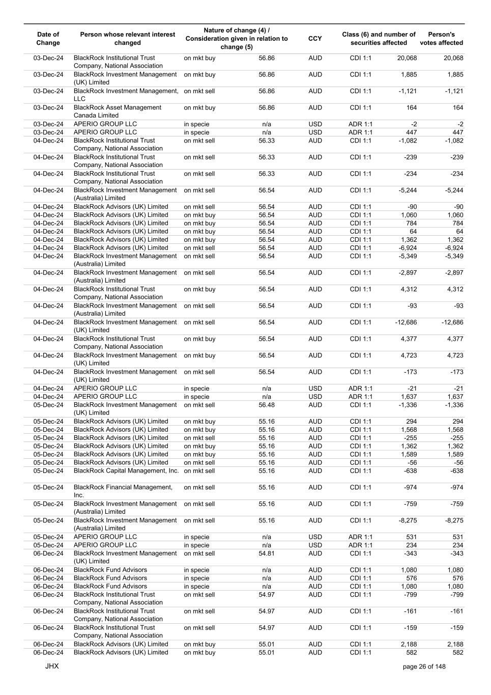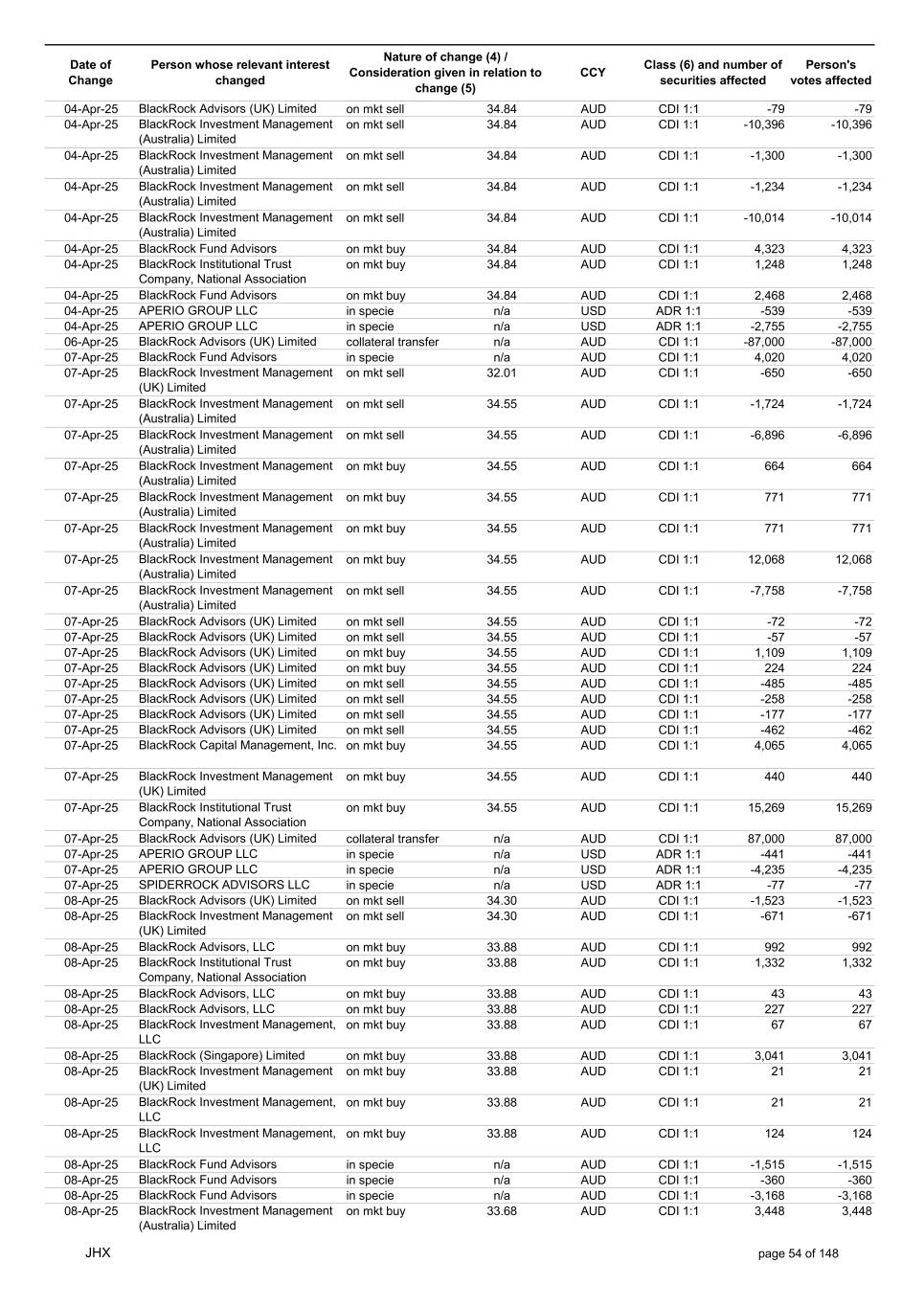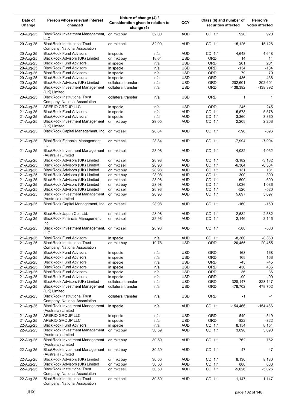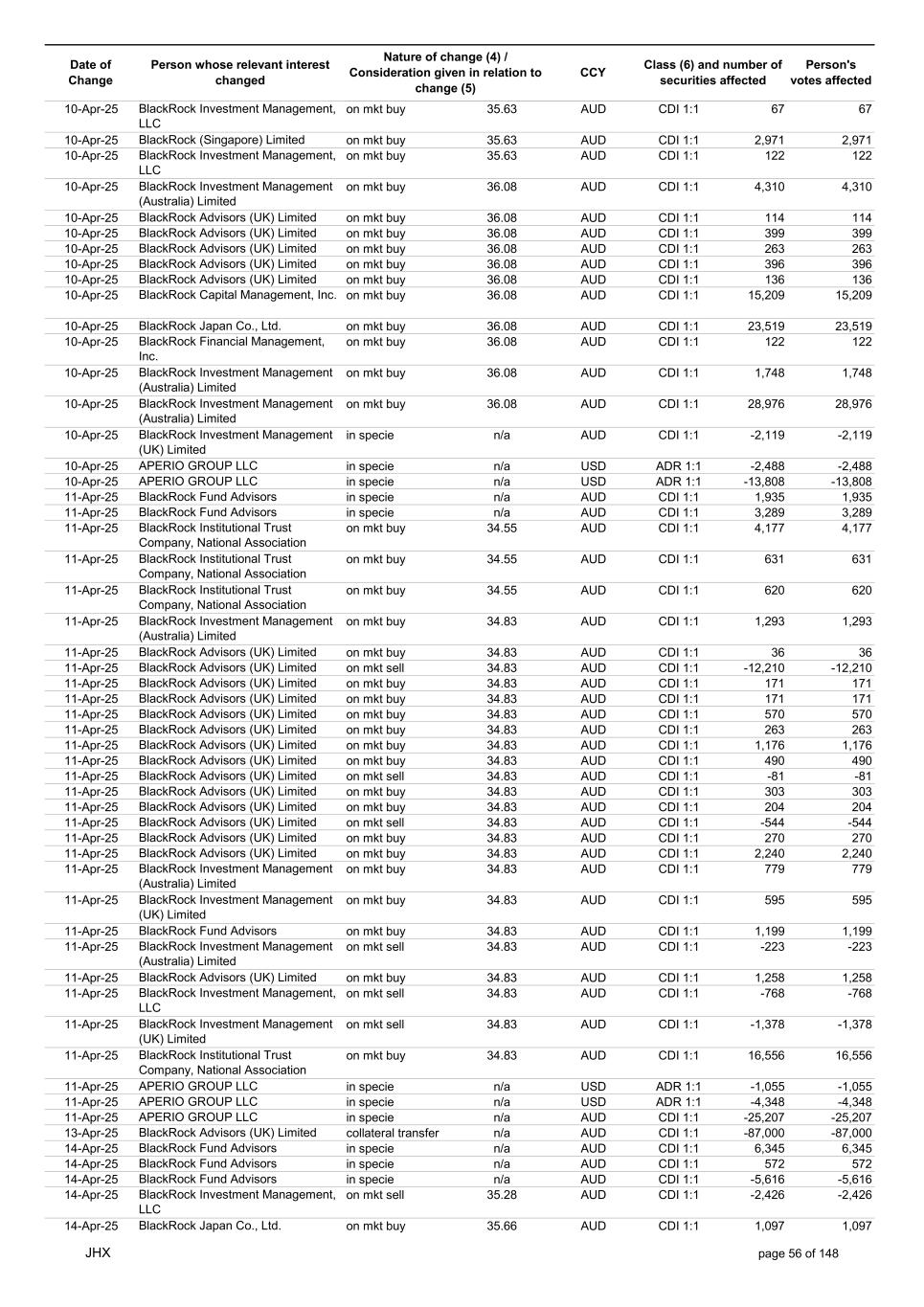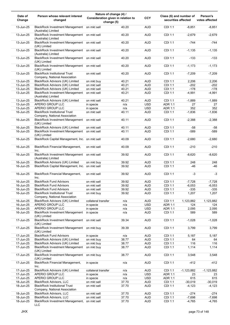 Date of Change Person whose relevant interest changed Nature of change (4) / Consideration given in relation to change (5) Class (6) and number of securities affected Person's votes affected CCY 20-Jun-25 BlackRock Investment Management, LLC on mkt sell 36.88 AUD CDI 1:1 -29,219 -29,219 20-Jun-25 BlackRock Investment Management (UK) Limited on mkt buy 36.88 AUD CDI 1:1 2,954 2,954 20-Jun-25 BlackRock Investment Management (UK) Limited on mkt buy 36.88 AUD CDI 1:1 12,706 12,706 20-Jun-25 BlackRock Investment Management (UK) Limited on mkt sell 36.88 AUD CDI 1:1 -1,224 -1,224 20-Jun-25 APERIO GROUP LLC in specie n/a USD ADR 1:1 -57,504 -57,504 20-Jun-25 APERIO GROUP LLC in specie n/a USD ADR 1:1 -714,219 -714,219 20-Jun-25 APERIO GROUP LLC in specie n/a AUD CDI 1:1 -13,045 -13,045 20-Jun-25 APERIO GROUP LLC in specie n/a AUD CDI 1:1 -183,704 -183,704 22-Jun-25 BlackRock Advisors (UK) Limited collateral transfer n/a AUD CDI 1:1 -686,000 -686,000 23-Jun-25 BlackRock Investment Management (UK) Limited on mkt sell 36.95 AUD CDI 1:1 -15,495 -15,495 23-Jun-25 BlackRock Investment Management, LLC on mkt buy 37.04 AUD CDI 1:1 1,045 1,045 23-Jun-25 BlackRock Investment Management (Australia) Limited on mkt sell 36.85 AUD CDI 1:1 -1,724 -1,724 23-Jun-25 BlackRock Advisors (UK) Limited on mkt sell 36.85 AUD CDI 1:1 -4,420 -4,420 23-Jun-25 BlackRock Advisors (UK) Limited on mkt sell 36.85 AUD CDI 1:1 -91 -91 23-Jun-25 BlackRock Capital Management, Inc. on mkt buy 36.85 AUD CDI 1:1 8,752 8,752 23-Jun-25 BlackRock Financial Management, Inc. on mkt buy 36.85 AUD CDI 1:1 4,340 4,340 23-Jun-25 BlackRock Asset Management Canada Limited on mkt buy 36.85 AUD CDI 1:1 233 233 23-Jun-25 BlackRock Advisors (UK) Limited collateral transfer n/a AUD CDI 1:1 461,097 461,097 23-Jun-25 APERIO GROUP LLC in specie n/a USD ADR 1:1 164 164 23-Jun-25 APERIO GROUP LLC in specie n/a USD ADR 1:1 -977 -977 24-Jun-25 BlackRock Advisors, LLC on mkt sell 37.89 AUD CDI 1:1 -3,056 -3,056 24-Jun-25 BlackRock Institutional Trust Company, National Association on mkt sell 37.89 AUD CDI 1:1 -426 -426 24-Jun-25 BlackRock Advisors, LLC on mkt sell 37.89 AUD CDI 1:1 -49 -49 24-Jun-25 BlackRock Advisors, LLC on mkt sell 37.89 AUD CDI 1:1 -782 -782 24-Jun-25 BlackRock Investment Management, LLC on mkt sell 37.89 AUD CDI 1:1 -496 -496 24-Jun-25 BlackRock Investment Management, LLC on mkt sell 37.99 AUD CDI 1:1 -1,593 -1,593 24-Jun-25 BlackRock (Singapore) Limited on mkt sell 37.89 AUD CDI 1:1 -2,970 -2,970 24-Jun-25 BlackRock Investment Management (Australia) Limited on mkt sell 37.89 AUD CDI 1:1 -35 -35 24-Jun-25 BlackRock Fund Advisors on mkt buy 37.99 AUD CDI 1:1 473 473 24-Jun-25 BlackRock Investment Management, LLC on mkt sell 37.89 AUD CDI 1:1 -393 -393 24-Jun-25 BlackRock Fund Advisors in specie n/a AUD CDI 1:1 -12,738 -12,738 24-Jun-25 BlackRock Advisors (UK) Limited on mkt sell 37.89 AUD CDI 1:1 -1,197 -1,197 24-Jun-25 BlackRock Advisors (UK) Limited on mkt buy 37.89 AUD CDI 1:1 1,180 1,180 24-Jun-25 BlackRock Advisors (UK) Limited on mkt sell 37.89 AUD CDI 1:1 -408 -408 24-Jun-25 BlackRock Advisors (UK) Limited on mkt sell 37.89 AUD CDI 1:1 -1,030 -1,030 24-Jun-25 BlackRock Asset Management Canada Limited on mkt buy 37.89 AUD CDI 1:1 206 206 24-Jun-25 BlackRock Advisors (UK) Limited on mkt buy 37.89 AUD CDI 1:1 229 229 24-Jun-25 BlackRock Institutional Trust Company, National Association on mkt buy 37.89 AUD CDI 1:1 33,796 33,796 24-Jun-25 BlackRock Advisors (UK) Limited collateral transfer n/a AUD CDI 1:1 224,903 224,903 24-Jun-25 APERIO GROUP LLC in specie n/a USD ADR 1:1 418 418 24-Jun-25 APERIO GROUP LLC in specie n/a USD ADR 1:1 2,134 2,134 25-Jun-25 BlackRock Fund Advisors in specie n/a AUD CDI 1:1 -11,842 -11,842 25-Jun-25 BlackRock Advisors, LLC on mkt sell 38.64 AUD CDI 1:1 -2,970 -2,970 25-Jun-25 BlackRock Institutional Trust Company, National Association on mkt sell 38.64 AUD CDI 1:1 -414 -414 25-Jun-25 BlackRock Advisors, LLC on mkt sell 38.64 AUD CDI 1:1 -35 -35 25-Jun-25 BlackRock Advisors, LLC on mkt sell 38.64 AUD CDI 1:1 -761 -761 25-Jun-25 BlackRock Investment Management, LLC on mkt sell 38.64 AUD CDI 1:1 -481 -481 25-Jun-25 BlackRock (Singapore) Limited on mkt sell 38.64 AUD CDI 1:1 -2,887 -2,887 25-Jun-25 BlackRock Investment Management (Australia) Limited on mkt sell 38.64 AUD CDI 1:1 -35 -35 25-Jun-25 BlackRock Investment Management, LLC on mkt sell 38.64 AUD CDI 1:1 -382 -382 25-Jun-25 BlackRock Fund Advisors in specie n/a AUD CDI 1:1 885 885 JHX page 75 of 148
