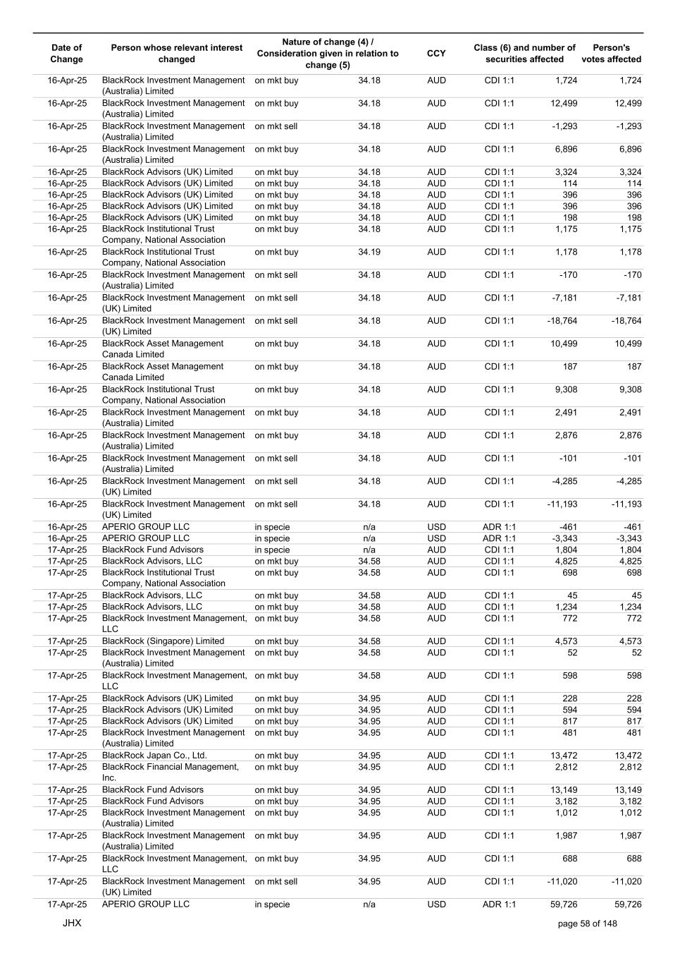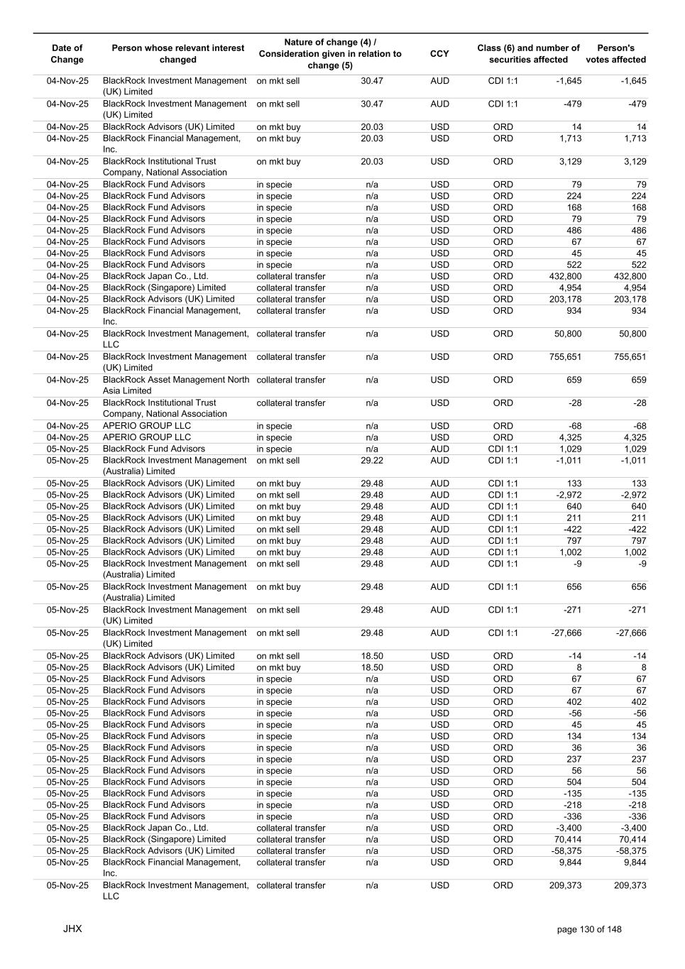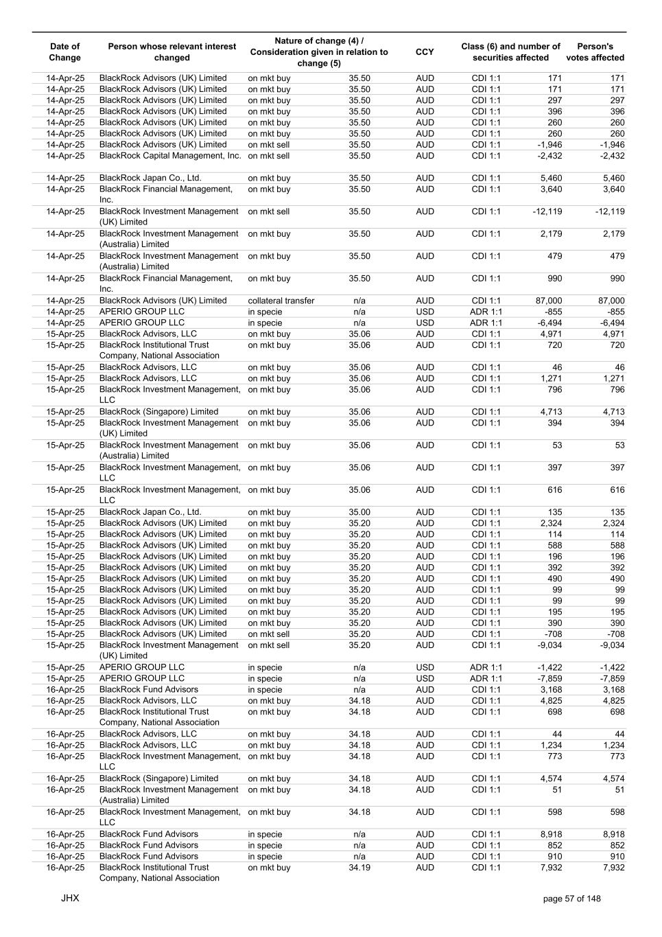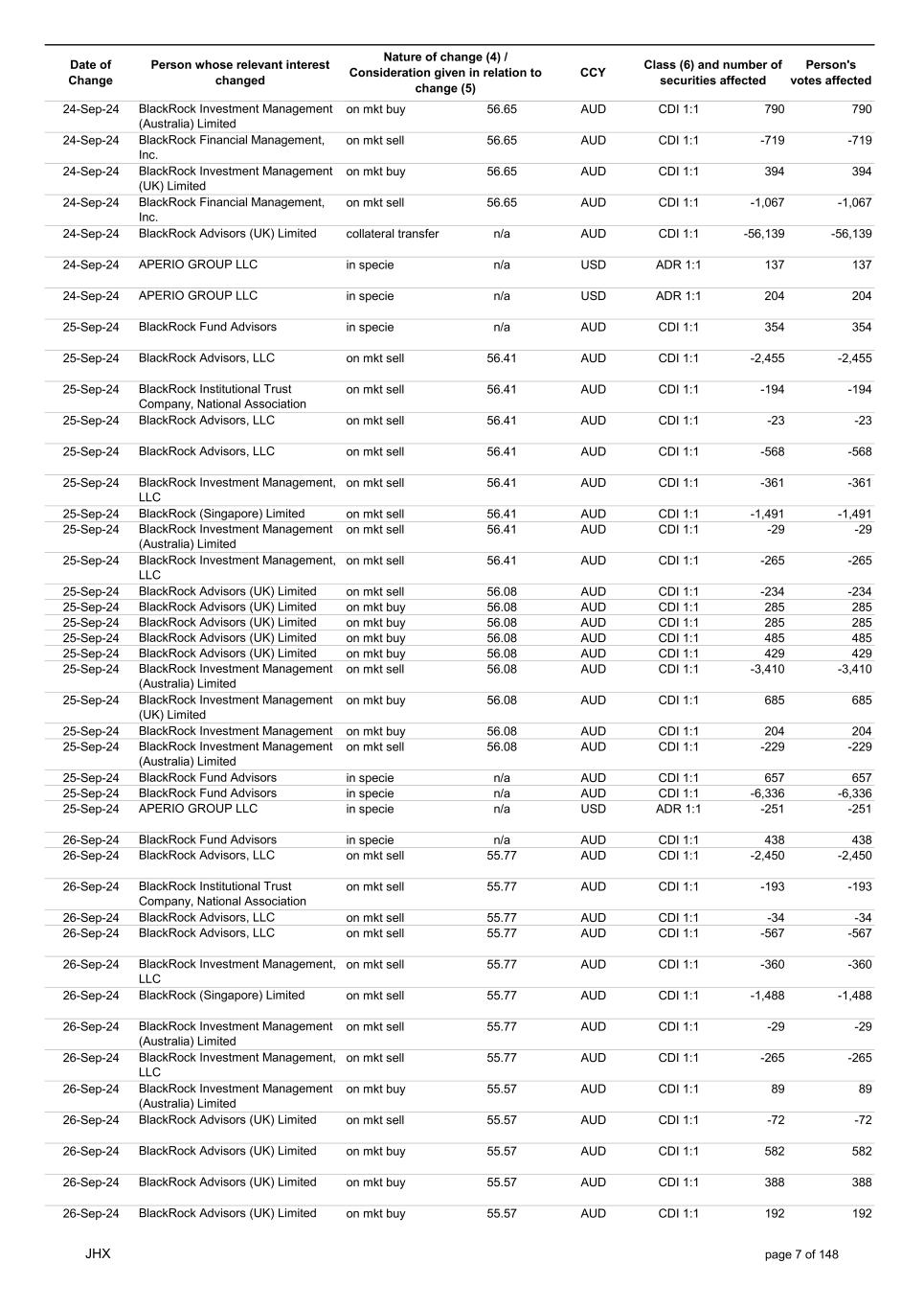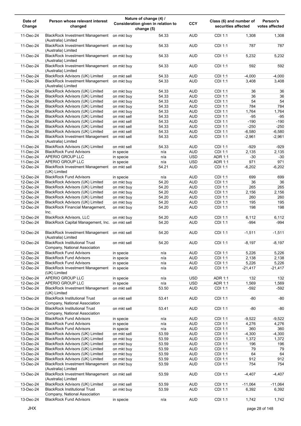 Date of Change Person whose relevant interest changed Nature of change (4) / Consideration given in relation to change (5) Class (6) and number of securities affected Person's votes affected CCY 20-Jun-25 BlackRock Investment Management, LLC on mkt sell 36.88 AUD CDI 1:1 -29,219 -29,219 20-Jun-25 BlackRock Investment Management (UK) Limited on mkt buy 36.88 AUD CDI 1:1 2,954 2,954 20-Jun-25 BlackRock Investment Management (UK) Limited on mkt buy 36.88 AUD CDI 1:1 12,706 12,706 20-Jun-25 BlackRock Investment Management (UK) Limited on mkt sell 36.88 AUD CDI 1:1 -1,224 -1,224 20-Jun-25 APERIO GROUP LLC in specie n/a USD ADR 1:1 -57,504 -57,504 20-Jun-25 APERIO GROUP LLC in specie n/a USD ADR 1:1 -714,219 -714,219 20-Jun-25 APERIO GROUP LLC in specie n/a AUD CDI 1:1 -13,045 -13,045 20-Jun-25 APERIO GROUP LLC in specie n/a AUD CDI 1:1 -183,704 -183,704 22-Jun-25 BlackRock Advisors (UK) Limited collateral transfer n/a AUD CDI 1:1 -686,000 -686,000 23-Jun-25 BlackRock Investment Management (UK) Limited on mkt sell 36.95 AUD CDI 1:1 -15,495 -15,495 23-Jun-25 BlackRock Investment Management, LLC on mkt buy 37.04 AUD CDI 1:1 1,045 1,045 23-Jun-25 BlackRock Investment Management (Australia) Limited on mkt sell 36.85 AUD CDI 1:1 -1,724 -1,724 23-Jun-25 BlackRock Advisors (UK) Limited on mkt sell 36.85 AUD CDI 1:1 -4,420 -4,420 23-Jun-25 BlackRock Advisors (UK) Limited on mkt sell 36.85 AUD CDI 1:1 -91 -91 23-Jun-25 BlackRock Capital Management, Inc. on mkt buy 36.85 AUD CDI 1:1 8,752 8,752 23-Jun-25 BlackRock Financial Management, Inc. on mkt buy 36.85 AUD CDI 1:1 4,340 4,340 23-Jun-25 BlackRock Asset Management Canada Limited on mkt buy 36.85 AUD CDI 1:1 233 233 23-Jun-25 BlackRock Advisors (UK) Limited collateral transfer n/a AUD CDI 1:1 461,097 461,097 23-Jun-25 APERIO GROUP LLC in specie n/a USD ADR 1:1 164 164 23-Jun-25 APERIO GROUP LLC in specie n/a USD ADR 1:1 -977 -977 24-Jun-25 BlackRock Advisors, LLC on mkt sell 37.89 AUD CDI 1:1 -3,056 -3,056 24-Jun-25 BlackRock Institutional Trust Company, National Association on mkt sell 37.89 AUD CDI 1:1 -426 -426 24-Jun-25 BlackRock Advisors, LLC on mkt sell 37.89 AUD CDI 1:1 -49 -49 24-Jun-25 BlackRock Advisors, LLC on mkt sell 37.89 AUD CDI 1:1 -782 -782 24-Jun-25 BlackRock Investment Management, LLC on mkt sell 37.89 AUD CDI 1:1 -496 -496 24-Jun-25 BlackRock Investment Management, LLC on mkt sell 37.99 AUD CDI 1:1 -1,593 -1,593 24-Jun-25 BlackRock (Singapore) Limited on mkt sell 37.89 AUD CDI 1:1 -2,970 -2,970 24-Jun-25 BlackRock Investment Management (Australia) Limited on mkt sell 37.89 AUD CDI 1:1 -35 -35 24-Jun-25 BlackRock Fund Advisors on mkt buy 37.99 AUD CDI 1:1 473 473 24-Jun-25 BlackRock Investment Management, LLC on mkt sell 37.89 AUD CDI 1:1 -393 -393 24-Jun-25 BlackRock Fund Advisors in specie n/a AUD CDI 1:1 -12,738 -12,738 24-Jun-25 BlackRock Advisors (UK) Limited on mkt sell 37.89 AUD CDI 1:1 -1,197 -1,197 24-Jun-25 BlackRock Advisors (UK) Limited on mkt buy 37.89 AUD CDI 1:1 1,180 1,180 24-Jun-25 BlackRock Advisors (UK) Limited on mkt sell 37.89 AUD CDI 1:1 -408 -408 24-Jun-25 BlackRock Advisors (UK) Limited on mkt sell 37.89 AUD CDI 1:1 -1,030 -1,030 24-Jun-25 BlackRock Asset Management Canada Limited on mkt buy 37.89 AUD CDI 1:1 206 206 24-Jun-25 BlackRock Advisors (UK) Limited on mkt buy 37.89 AUD CDI 1:1 229 229 24-Jun-25 BlackRock Institutional Trust Company, National Association on mkt buy 37.89 AUD CDI 1:1 33,796 33,796 24-Jun-25 BlackRock Advisors (UK) Limited collateral transfer n/a AUD CDI 1:1 224,903 224,903 24-Jun-25 APERIO GROUP LLC in specie n/a USD ADR 1:1 418 418 24-Jun-25 APERIO GROUP LLC in specie n/a USD ADR 1:1 2,134 2,134 25-Jun-25 BlackRock Fund Advisors in specie n/a AUD CDI 1:1 -11,842 -11,842 25-Jun-25 BlackRock Advisors, LLC on mkt sell 38.64 AUD CDI 1:1 -2,970 -2,970 25-Jun-25 BlackRock Institutional Trust Company, National Association on mkt sell 38.64 AUD CDI 1:1 -414 -414 25-Jun-25 BlackRock Advisors, LLC on mkt sell 38.64 AUD CDI 1:1 -35 -35 25-Jun-25 BlackRock Advisors, LLC on mkt sell 38.64 AUD CDI 1:1 -761 -761 25-Jun-25 BlackRock Investment Management, LLC on mkt sell 38.64 AUD CDI 1:1 -481 -481 25-Jun-25 BlackRock (Singapore) Limited on mkt sell 38.64 AUD CDI 1:1 -2,887 -2,887 25-Jun-25 BlackRock Investment Management (Australia) Limited on mkt sell 38.64 AUD CDI 1:1 -35 -35 25-Jun-25 BlackRock Investment Management, LLC on mkt sell 38.64 AUD CDI 1:1 -382 -382 25-Jun-25 BlackRock Fund Advisors in specie n/a AUD CDI 1:1 885 885 JHX page 75 of 148