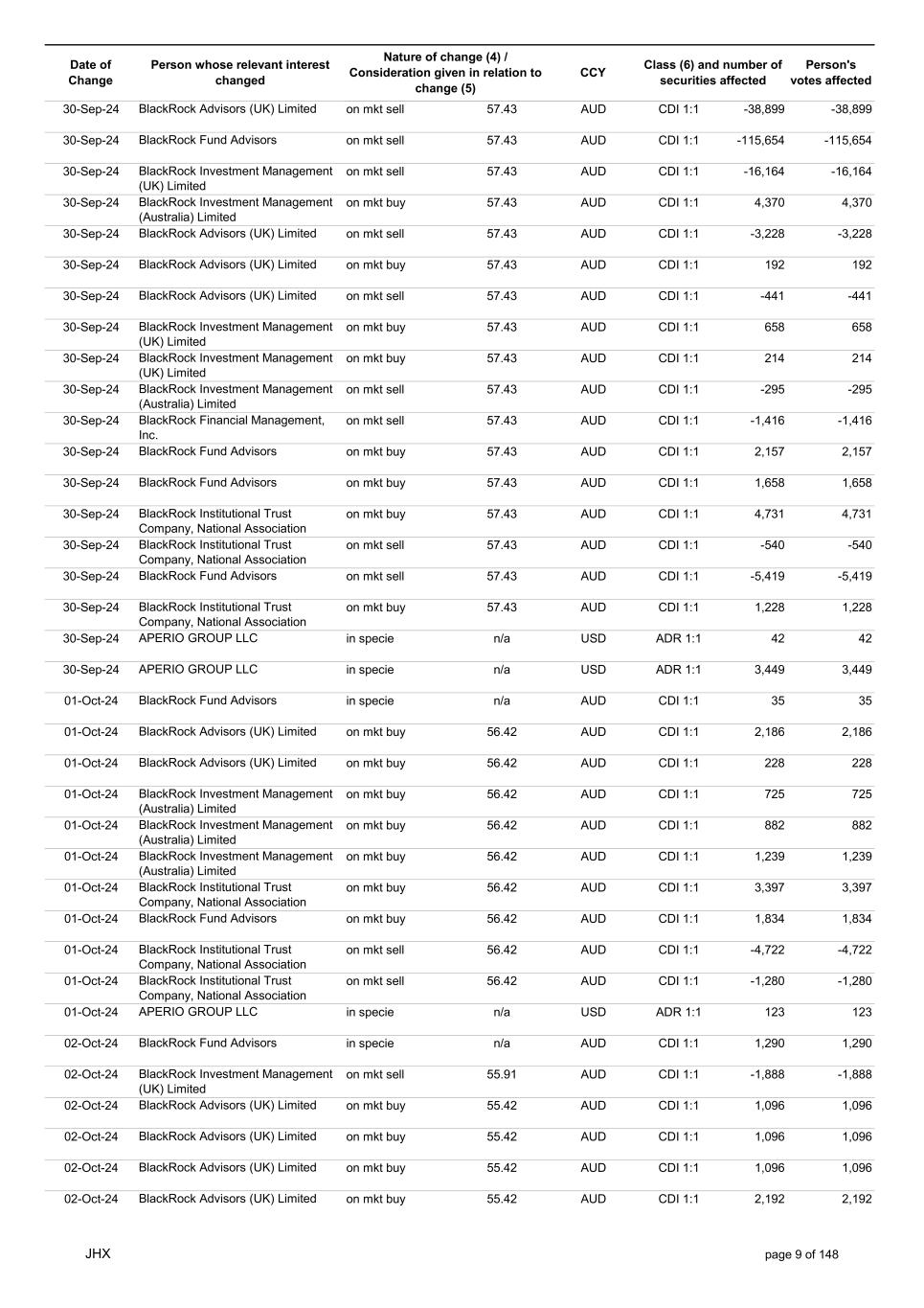 Date of Change Person whose relevant interest changed Nature of change (4) / Consideration given in relation to change (5) Class (6) and number of securities affected Person's votes affected CCY 30-Sep-24 BlackRock Advisors (UK) Limited on mkt sell 57.43 AUD CDI 1:1 -38,899 -38,899 30-Sep-24 BlackRock Fund Advisors on mkt sell 57.43 AUD CDI 1:1 -115,654 -115,654 30-Sep-24 BlackRock Investment Management (UK) Limited on mkt sell 57.43 AUD CDI 1:1 -16,164 -16,164 30-Sep-24 BlackRock Investment Management (Australia) Limited on mkt buy 57.43 AUD CDI 1:1 4,370 4,370 30-Sep-24 BlackRock Advisors (UK) Limited on mkt sell 57.43 AUD CDI 1:1 -3,228 -3,228 30-Sep-24 BlackRock Advisors (UK) Limited on mkt buy 57.43 AUD CDI 1:1 192 192 30-Sep-24 BlackRock Advisors (UK) Limited on mkt sell 57.43 AUD CDI 1:1 -441 -441 30-Sep-24 BlackRock Investment Management (UK) Limited on mkt buy 57.43 AUD CDI 1:1 658 658 30-Sep-24 BlackRock Investment Management (UK) Limited on mkt buy 57.43 AUD CDI 1:1 214 214 30-Sep-24 BlackRock Investment Management (Australia) Limited on mkt sell 57.43 AUD CDI 1:1 -295 -295 30-Sep-24 BlackRock Financial Management, Inc. on mkt sell 57.43 AUD CDI 1:1 -1,416 -1,416 30-Sep-24 BlackRock Fund Advisors on mkt buy 57.43 AUD CDI 1:1 2,157 2,157 30-Sep-24 BlackRock Fund Advisors on mkt buy 57.43 AUD CDI 1:1 1,658 1,658 30-Sep-24 BlackRock Institutional Trust Company, National Association on mkt buy 57.43 AUD CDI 1:1 4,731 4,731 30-Sep-24 BlackRock Institutional Trust Company, National Association on mkt sell 57.43 AUD CDI 1:1 -540 -540 30-Sep-24 BlackRock Fund Advisors on mkt sell 57.43 AUD CDI 1:1 -5,419 -5,419 30-Sep-24 BlackRock Institutional Trust Company, National Association on mkt buy 57.43 AUD CDI 1:1 1,228 1,228 30-Sep-24 APERIO GROUP LLC in specie n/a USD ADR 1:1 42 42 30-Sep-24 APERIO GROUP LLC in specie n/a USD ADR 1:1 3,449 3,449 01-Oct-24 BlackRock Fund Advisors in specie n/a AUD CDI 1:1 35 35 01-Oct-24 BlackRock Advisors (UK) Limited on mkt buy 56.42 AUD CDI 1:1 2,186 2,186 01-Oct-24 BlackRock Advisors (UK) Limited on mkt buy 56.42 AUD CDI 1:1 228 228 01-Oct-24 BlackRock Investment Management (Australia) Limited on mkt buy 56.42 AUD CDI 1:1 725 725 01-Oct-24 BlackRock Investment Management (Australia) Limited on mkt buy 56.42 AUD CDI 1:1 882 882 01-Oct-24 BlackRock Investment Management (Australia) Limited on mkt buy 56.42 AUD CDI 1:1 1,239 1,239 01-Oct-24 BlackRock Institutional Trust Company, National Association on mkt buy 56.42 AUD CDI 1:1 3,397 3,397 01-Oct-24 BlackRock Fund Advisors on mkt buy 56.42 AUD CDI 1:1 1,834 1,834 01-Oct-24 BlackRock Institutional Trust Company, National Association on mkt sell 56.42 AUD CDI 1:1 -4,722 -4,722 01-Oct-24 BlackRock Institutional Trust Company, National Association on mkt sell 56.42 AUD CDI 1:1 -1,280 -1,280 01-Oct-24 APERIO GROUP LLC in specie n/a USD ADR 1:1 123 123 02-Oct-24 BlackRock Fund Advisors in specie n/a AUD CDI 1:1 1,290 1,290 02-Oct-24 BlackRock Investment Management (UK) Limited on mkt sell 55.91 AUD CDI 1:1 -1,888 -1,888 02-Oct-24 BlackRock Advisors (UK) Limited on mkt buy 55.42 AUD CDI 1:1 1,096 1,096 02-Oct-24 BlackRock Advisors (UK) Limited on mkt buy 55.42 AUD CDI 1:1 1,096 1,096 02-Oct-24 BlackRock Advisors (UK) Limited on mkt buy 55.42 AUD CDI 1:1 1,096 1,096 02-Oct-24 BlackRock Advisors (UK) Limited on mkt buy 55.42 AUD CDI 1:1 2,192 2,192 JHX page 9 of 148