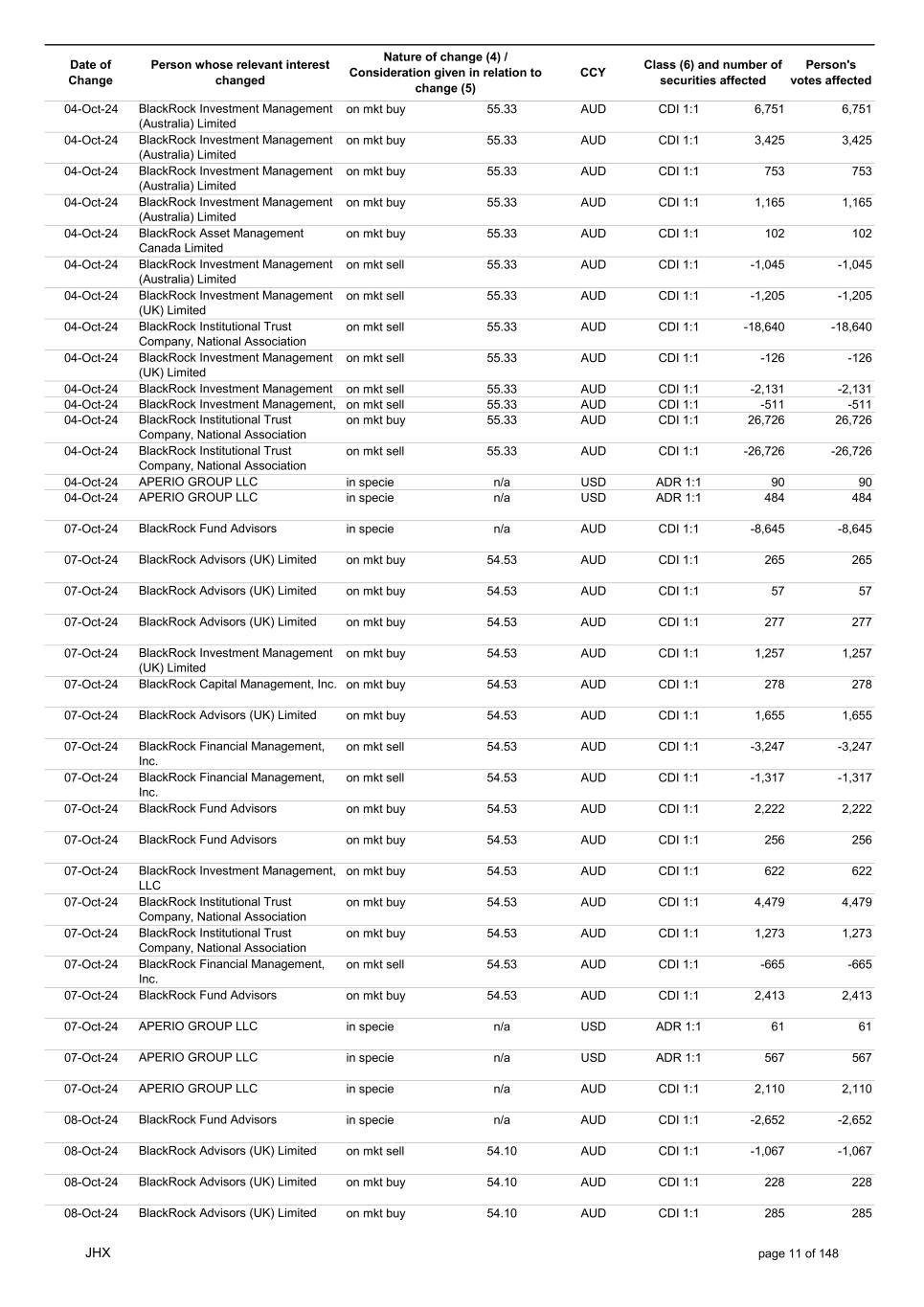 Date of Change Person whose relevant interest changed Nature of change (4) / Consideration given in relation to change (5) Class (6) and number of securities affected Person's votes affected CCY 02-Oct-24 BlackRock Advisors (UK) Limited on mkt buy 55.42 AUD CDI 1:1 294 294 02-Oct-24 BlackRock Advisors (UK) Limited on mkt buy 55.42 AUD CDI 1:1 1,176 1,176 02-Oct-24 BlackRock Advisors (UK) Limited on mkt buy 55.42 AUD CDI 1:1 281 281 02-Oct-24 BlackRock Advisors (UK) Limited on mkt sell 55.42 AUD CDI 1:1 -454 -454 02-Oct-24 BlackRock Investment Management (Australia) Limited on mkt sell 55.42 AUD CDI 1:1 -3,252 -3,252 02-Oct-24 BlackRock Institutional Trust Company, National Association on mkt sell 55.42 AUD CDI 1:1 -18,546 -18,546 02-Oct-24 BlackRock Investment Management (Australia) Limited on mkt sell 55.42 AUD CDI 1:1 -1,097 -1,097 02-Oct-24 BlackRock Investment Management (Australia) Limited on mkt buy 55.42 AUD CDI 1:1 3,854 3,854 02-Oct-24 BlackRock Investment Management (Australia) Limited on mkt buy 55.42 AUD CDI 1:1 849 849 02-Oct-24 BlackRock Investment Management (Australia) Limited on mkt buy 55.42 AUD CDI 1:1 1,567 1,567 02-Oct-24 BlackRock Financial Management, Inc. on mkt sell 55.42 AUD CDI 1:1 -1,307 -1,307 02-Oct-24 BlackRock Advisors (UK) Limited on mkt buy 55.42 AUD CDI 1:1 6,012 6,012 02-Oct-24 BlackRock Investment Management, LLC on mkt buy 55.42 AUD CDI 1:1 437 437 02-Oct-24 BlackRock Fund Advisors on mkt sell 55.42 AUD CDI 1:1 -4,877 -4,877 02-Oct-24 BlackRock Investment Management (Australia) Limited on mkt buy 55.42 AUD CDI 1:1 340 340 02-Oct-24 BlackRock Investment Management (Australia) Limited on mkt buy 55.42 AUD CDI 1:1 477 477 02-Oct-24 BlackRock Financial Management, Inc. on mkt sell 55.42 AUD CDI 1:1 -711 -711 02-Oct-24 APERIO GROUP LLC in specie n/a USD ADR 1:1 132 132 02-Oct-24 APERIO GROUP LLC in specie n/a USD ADR 1:1 862 862 03-Oct-24 BlackRock Investment Management (Australia) Limited on mkt buy 55.33 AUD CDI 1:1 4,807 4,807 03-Oct-24 BlackRock Advisors (UK) Limited on mkt buy 55.33 AUD CDI 1:1 2,196 2,196 03-Oct-24 BlackRock Advisors (UK) Limited on mkt buy 55.33 AUD CDI 1:1 54 54 03-Oct-24 BlackRock Advisors (UK) Limited on mkt buy 55.33 AUD CDI 1:1 128 128 03-Oct-24 BlackRock Advisors (UK) Limited on mkt buy 55.33 AUD CDI 1:1 231 231 03-Oct-24 BlackRock Capital Management, Inc. on mkt sell 55.33 AUD CDI 1:1 -1,426 -1,426 03-Oct-24 BlackRock Financial Management, Inc. on mkt sell 55.33 AUD CDI 1:1 -10,822 -10,822 03-Oct-24 BlackRock Investment Management (Australia) Limited on mkt sell 55.33 AUD CDI 1:1 -2,695 -2,695 03-Oct-24 APERIO GROUP LLC in specie n/a USD ADR 1:1 642 642 04-Oct-24 BlackRock Investment Management (UK) Limited on mkt sell 54.75 AUD CDI 1:1 -6,228 -6,228 04-Oct-24 BlackRock Investment Management (Australia) Limited on mkt buy 55.33 AUD CDI 1:1 3,933 3,933 04-Oct-24 BlackRock Advisors (UK) Limited on mkt buy 55.33 AUD CDI 1:1 270 270 04-Oct-24 BlackRock Advisors (UK) Limited on mkt sell 55.33 AUD CDI 1:1 -13,858 -13,858 04-Oct-24 BlackRock Advisors (UK) Limited on mkt buy 55.33 AUD CDI 1:1 171 171 04-Oct-24 BlackRock Advisors (UK) Limited on mkt buy 55.33 AUD CDI 1:1 686 686 04-Oct-24 BlackRock Advisors (UK) Limited on mkt buy 55.33 AUD CDI 1:1 3,370 3,370 04-Oct-24 BlackRock Investment Management (Australia) Limited on mkt buy 55.33 AUD CDI 1:1 5,987 5,987 JHX page 10 of 148
