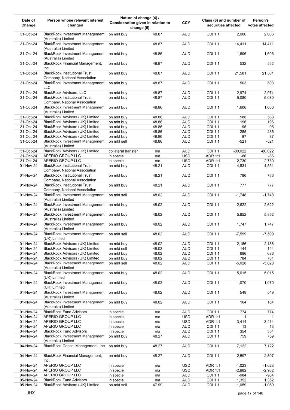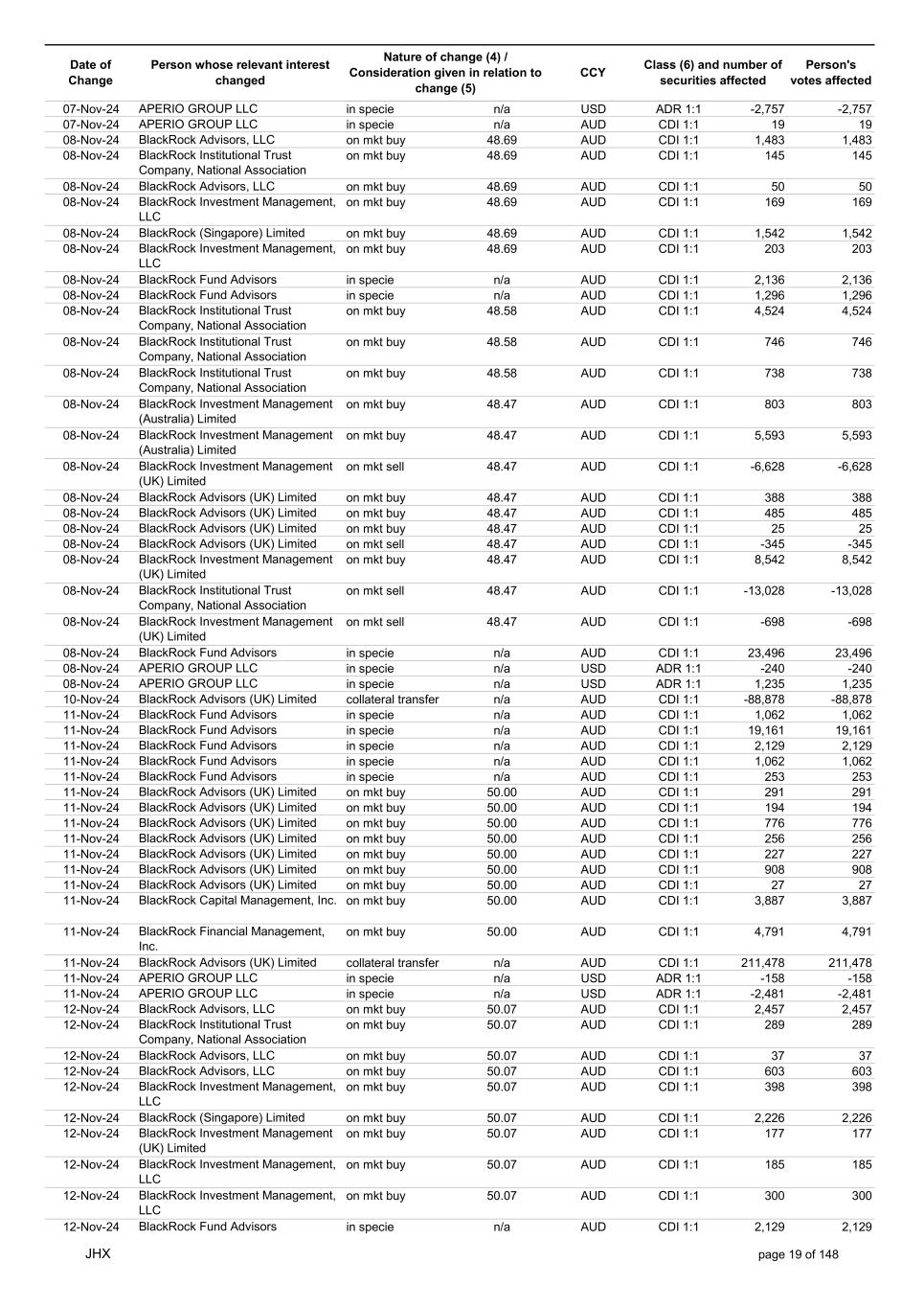 Date of Change Person whose relevant interest changed Nature of change (4) / Consideration given in relation to change (5) Class (6) and number of securities affected Person's votes affected CCY 25-Nov-24 BlackRock Advisors (UK) Limited on mkt sell 56.42 AUD CDI 1:1 -7,775 -7,775 25-Nov-24 BlackRock Advisors (UK) Limited on mkt sell 56.42 AUD CDI 1:1 -527 -527 25-Nov-24 BlackRock Fund Advisors on mkt sell 56.42 AUD CDI 1:1 -14,432 -14,432 25-Nov-24 BlackRock Fund Advisors on mkt sell 56.42 AUD CDI 1:1 -11,647 -11,647 25-Nov-24 BlackRock Fund Advisors on mkt sell 56.42 AUD CDI 1:1 -171 -171 25-Nov-24 BlackRock Institutional Trust Company, National Association on mkt sell 56.42 AUD CDI 1:1 -558 -558 25-Nov-24 BlackRock Institutional Trust Company, National Association on mkt sell 56.42 AUD CDI 1:1 -7,703 -7,703 25-Nov-24 BlackRock Institutional Trust Company, National Association on mkt sell 56.42 AUD CDI 1:1 -2,944 -2,944 25-Nov-24 BlackRock Investment Management (Australia) Limited on mkt sell 56.42 AUD CDI 1:1 -425 -425 25-Nov-24 BlackRock Investment Management (Australia) Limited on mkt buy 56.42 AUD CDI 1:1 4,370 4,370 25-Nov-24 BlackRock Fund Advisors in specie n/a AUD CDI 1:1 976 976 25-Nov-24 APERIO GROUP LLC in specie n/a USD ADR 1:1 29 29 25-Nov-24 APERIO GROUP LLC in specie n/a USD ADR 1:1 1,768 1,768 26-Nov-24 BlackRock Investment Management (UK) Limited on mkt sell 57.82 AUD CDI 1:1 -11 -11 26-Nov-24 BlackRock Investment Management, LLC on mkt sell 57.82 AUD CDI 1:1 -10 -10 26-Nov-24 BlackRock Fund Advisors in specie n/a AUD CDI 1:1 4,270 4,270 26-Nov-24 BlackRock Advisors (UK) Limited on mkt buy 57.60 AUD CDI 1:1 3,279 3,279 26-Nov-24 BlackRock Advisors (UK) Limited on mkt buy 57.60 AUD CDI 1:1 582 582 26-Nov-24 BlackRock Advisors (UK) Limited on mkt buy 57.60 AUD CDI 1:1 1,164 1,164 26-Nov-24 BlackRock Advisors (UK) Limited on mkt buy 57.60 AUD CDI 1:1 485 485 26-Nov-24 BlackRock Advisors (UK) Limited on mkt buy 57.60 AUD CDI 1:1 103 103 26-Nov-24 BlackRock Advisors (UK) Limited on mkt buy 57.60 AUD CDI 1:1 64 64 26-Nov-24 BlackRock Investment Management, LLC on mkt buy 57.60 AUD CDI 1:1 1,152 1,152 26-Nov-24 BlackRock Institutional Trust Company, National Association on mkt sell 57.60 AUD CDI 1:1 -28,235 -28,235 26-Nov-24 BlackRock Fund Advisors in specie n/a AUD CDI 1:1 288 288 26-Nov-24 APERIO GROUP LLC in specie n/a USD ADR 1:1 109 109 26-Nov-24 APERIO GROUP LLC in specie n/a USD ADR 1:1 281 281 27-Nov-24 BlackRock Institutional Trust Company, National Association on mkt sell 56.40 AUD CDI 1:1 -1,092 -1,092 27-Nov-24 BlackRock Institutional Trust Company, National Association on mkt sell 56.40 AUD CDI 1:1 -197 -197 27-Nov-24 BlackRock Institutional Trust Company, National Association on mkt sell 56.40 AUD CDI 1:1 -191 -191 27-Nov-24 BlackRock Advisors (UK) Limited on mkt buy 56.40 AUD CDI 1:1 776 776 27-Nov-24 BlackRock Investment Management (UK) Limited on mkt buy 56.40 AUD CDI 1:1 706 706 27-Nov-24 BlackRock Investment Management (Australia) Limited on mkt sell 56.40 AUD CDI 1:1 -9,553 -9,553 27-Nov-24 BlackRock Investment Management (Australia) Limited on mkt sell 56.40 AUD CDI 1:1 -12,424 -12,424 27-Nov-24 BlackRock Investment Management (Australia) Limited on mkt sell 56.40 AUD CDI 1:1 -1,079 -1,079 27-Nov-24 BlackRock Investment Management (UK) Limited on mkt sell 56.40 AUD CDI 1:1 -10,741 -10,741 27-Nov-24 BlackRock Investment Management, LLC on mkt sell 56.40 AUD CDI 1:1 -1,492 -1,492 27-Nov-24 APERIO GROUP LLC in specie n/a USD ADR 1:1 79,245 79,245 27-Nov-24 APERIO GROUP LLC in specie n/a USD ADR 1:1 787,171 787,171 27-Nov-24 APERIO GROUP LLC in specie n/a AUD CDI 1:1 -17,743 -17,743 27-Nov-24 APERIO GROUP LLC in specie n/a AUD CDI 1:1 251,968 251,968 28-Nov-24 BlackRock Investment Management (Australia) Limited on mkt buy 56.72 AUD CDI 1:1 3,496 3,496 28-Nov-24 BlackRock Investment Management (Australia) Limited on mkt buy 56.72 AUD CDI 1:1 437 437 28-Nov-24 BlackRock Advisors (UK) Limited on mkt sell 56.72 AUD CDI 1:1 -1,240 -1,240 28-Nov-24 BlackRock Capital Management, Inc. on mkt sell 56.72 AUD CDI 1:1 -1,557 -1,557 28-Nov-24 BlackRock Financial Management, Inc. on mkt sell 56.72 AUD CDI 1:1 -1,711 -1,711 28-Nov-24 BlackRock Investment Management (Australia) Limited on mkt sell 56.72 AUD CDI 1:1 -2,231 -2,231 28-Nov-24 BlackRock Investment Management (Australia) Limited on mkt sell 56.72 AUD CDI 1:1 -11,420 -11,420 JHX page 24 of 148