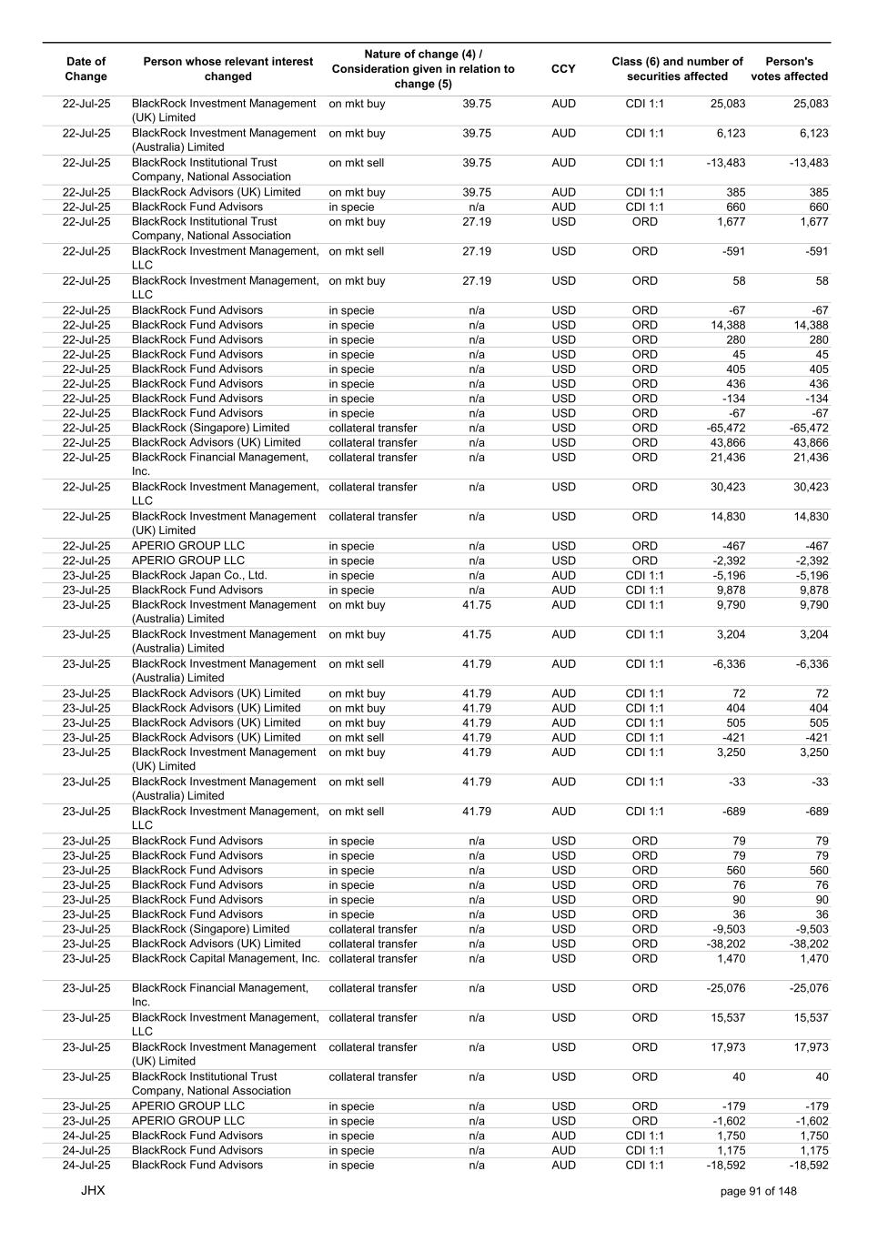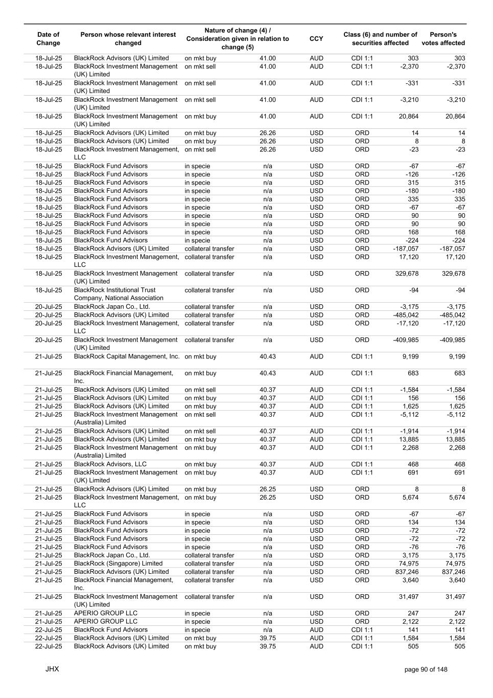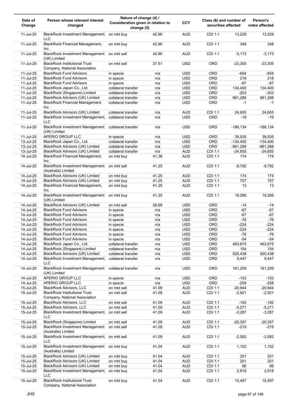 Date of Change Person whose relevant interest changed Nature of change (4) / Consideration given in relation to change (5) Class (6) and number of securities affected Person's votes affected CCY 18-Jul-25 BlackRock Advisors (UK) Limited on mkt buy 41.00 AUD CDI 1:1 303 303 18-Jul-25 BlackRock Investment Management (UK) Limited on mkt sell 41.00 AUD CDI 1:1 -2,370 -2,370 18-Jul-25 BlackRock Investment Management (UK) Limited on mkt sell 41.00 AUD CDI 1:1 -331 -331 18-Jul-25 BlackRock Investment Management (UK) Limited on mkt sell 41.00 AUD CDI 1:1 -3,210 -3,210 18-Jul-25 BlackRock Investment Management (UK) Limited on mkt buy 41.00 AUD CDI 1:1 20,864 20,864 18-Jul-25 BlackRock Advisors (UK) Limited on mkt buy 26.26 USD ORD 14 14 18-Jul-25 BlackRock Advisors (UK) Limited on mkt buy 26.26 USD ORD 8 8 18-Jul-25 BlackRock Investment Management, LLC on mkt sell 26.26 USD ORD -23 -23 18-Jul-25 BlackRock Fund Advisors in specie n/a USD ORD -67 -67 18-Jul-25 BlackRock Fund Advisors in specie n/a USD ORD -126 -126 18-Jul-25 BlackRock Fund Advisors in specie n/a USD ORD 315 315 18-Jul-25 BlackRock Fund Advisors in specie n/a USD ORD -180 -180 18-Jul-25 BlackRock Fund Advisors in specie n/a USD ORD 335 335 18-Jul-25 BlackRock Fund Advisors in specie n/a USD ORD -67 -67 18-Jul-25 BlackRock Fund Advisors in specie n/a USD ORD 90 90 18-Jul-25 BlackRock Fund Advisors in specie n/a USD ORD 90 90 18-Jul-25 BlackRock Fund Advisors in specie n/a USD ORD 168 168 18-Jul-25 BlackRock Fund Advisors in specie n/a USD ORD -224 -224 18-Jul-25 BlackRock Advisors (UK) Limited collateral transfer n/a USD ORD -187,057 -187,057 18-Jul-25 BlackRock Investment Management, LLC collateral transfer n/a USD ORD 17,120 17,120 18-Jul-25 BlackRock Investment Management (UK) Limited collateral transfer n/a USD ORD 329,678 329,678 18-Jul-25 BlackRock Institutional Trust Company, National Association collateral transfer n/a USD ORD -94 -94 20-Jul-25 BlackRock Japan Co., Ltd. collateral transfer n/a USD ORD -3,175 -3,175 20-Jul-25 BlackRock Advisors (UK) Limited collateral transfer n/a USD ORD -485,042 -485,042 20-Jul-25 BlackRock Investment Management, LLC collateral transfer n/a USD ORD -17,120 -17,120 20-Jul-25 BlackRock Investment Management (UK) Limited collateral transfer n/a USD ORD -409,985 -409,985 21-Jul-25 BlackRock Capital Management, Inc. on mkt buy 40.43 AUD CDI 1:1 9,199 9,199 21-Jul-25 BlackRock Financial Management, Inc. on mkt buy 40.43 AUD CDI 1:1 683 683 21-Jul-25 BlackRock Advisors (UK) Limited on mkt sell 40.37 AUD CDI 1:1 -1,584 -1,584 21-Jul-25 BlackRock Advisors (UK) Limited on mkt buy 40.37 AUD CDI 1:1 156 156 21-Jul-25 BlackRock Advisors (UK) Limited on mkt buy 40.37 AUD CDI 1:1 1,625 1,625 21-Jul-25 BlackRock Investment Management (Australia) Limited on mkt sell 40.37 AUD CDI 1:1 -5,112 -5,112 21-Jul-25 BlackRock Advisors (UK) Limited on mkt sell 40.37 AUD CDI 1:1 -1,914 -1,914 21-Jul-25 BlackRock Advisors (UK) Limited on mkt buy 40.37 AUD CDI 1:1 13,885 13,885 21-Jul-25 BlackRock Investment Management (Australia) Limited on mkt buy 40.37 AUD CDI 1:1 2,268 2,268 21-Jul-25 BlackRock Advisors, LLC on mkt buy 40.37 AUD CDI 1:1 468 468 21-Jul-25 BlackRock Investment Management (UK) Limited on mkt buy 40.37 AUD CDI 1:1 691 691 21-Jul-25 BlackRock Advisors (UK) Limited on mkt buy 26.25 USD ORD 8 8 21-Jul-25 BlackRock Investment Management, LLC on mkt buy 26.25 USD ORD 5,674 5,674 21-Jul-25 BlackRock Fund Advisors in specie n/a USD ORD -67 -67 21-Jul-25 BlackRock Fund Advisors in specie n/a USD ORD 134 134 21-Jul-25 BlackRock Fund Advisors in specie n/a USD ORD -72 -72 21-Jul-25 BlackRock Fund Advisors in specie n/a USD ORD -72 -72 21-Jul-25 BlackRock Fund Advisors in specie n/a USD ORD -76 -76 21-Jul-25 BlackRock Japan Co., Ltd. collateral transfer n/a USD ORD 3,175 3,175 21-Jul-25 BlackRock (Singapore) Limited collateral transfer n/a USD ORD 74,975 74,975 21-Jul-25 BlackRock Advisors (UK) Limited collateral transfer n/a USD ORD 837,246 837,246 21-Jul-25 BlackRock Financial Management, Inc. collateral transfer n/a USD ORD 3,640 3,640 21-Jul-25 BlackRock Investment Management (UK) Limited collateral transfer n/a USD ORD 31,497 31,497 21-Jul-25 APERIO GROUP LLC in specie n/a USD ORD 247 247 21-Jul-25 APERIO GROUP LLC in specie n/a USD ORD 2,122 2,122 22-Jul-25 BlackRock Fund Advisors in specie n/a AUD CDI 1:1 141 141 22-Jul-25 BlackRock Advisors (UK) Limited on mkt buy 39.75 AUD CDI 1:1 1,584 1,584 22-Jul-25 BlackRock Advisors (UK) Limited on mkt buy 39.75 AUD CDI 1:1 505 505 JHX page 90 of 148