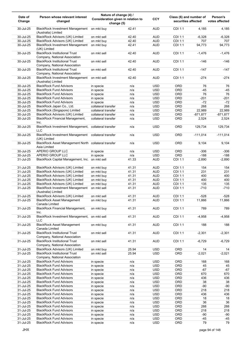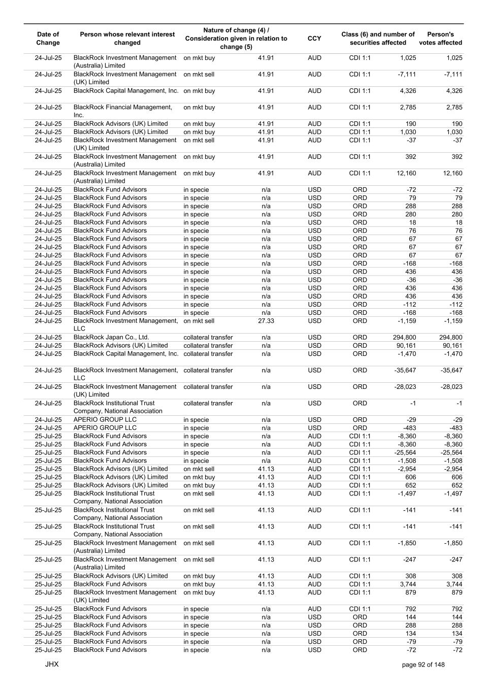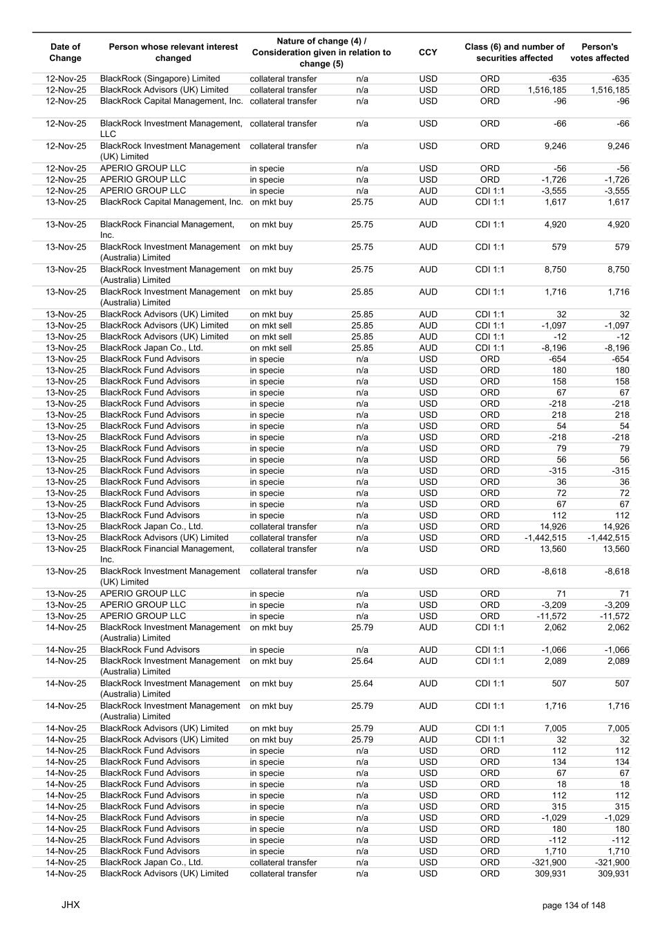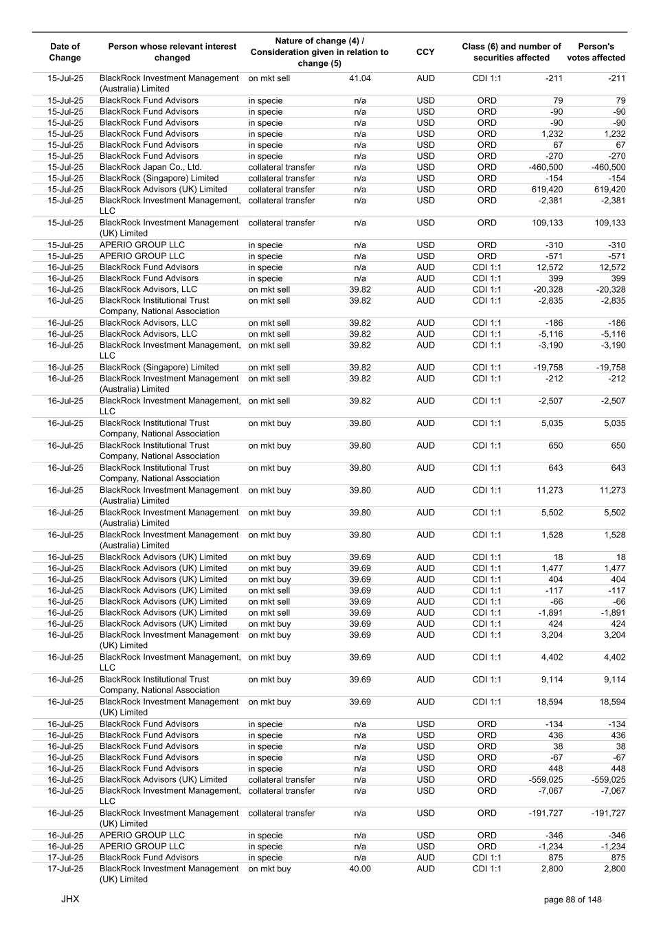 Date of Change Person whose relevant interest changed Nature of change (4) / Consideration given in relation to change (5) Class (6) and number of securities affected Person's votes affected CCY 18-Jul-25 BlackRock Advisors (UK) Limited on mkt buy 41.00 AUD CDI 1:1 303 303 18-Jul-25 BlackRock Investment Management (UK) Limited on mkt sell 41.00 AUD CDI 1:1 -2,370 -2,370 18-Jul-25 BlackRock Investment Management (UK) Limited on mkt sell 41.00 AUD CDI 1:1 -331 -331 18-Jul-25 BlackRock Investment Management (UK) Limited on mkt sell 41.00 AUD CDI 1:1 -3,210 -3,210 18-Jul-25 BlackRock Investment Management (UK) Limited on mkt buy 41.00 AUD CDI 1:1 20,864 20,864 18-Jul-25 BlackRock Advisors (UK) Limited on mkt buy 26.26 USD ORD 14 14 18-Jul-25 BlackRock Advisors (UK) Limited on mkt buy 26.26 USD ORD 8 8 18-Jul-25 BlackRock Investment Management, LLC on mkt sell 26.26 USD ORD -23 -23 18-Jul-25 BlackRock Fund Advisors in specie n/a USD ORD -67 -67 18-Jul-25 BlackRock Fund Advisors in specie n/a USD ORD -126 -126 18-Jul-25 BlackRock Fund Advisors in specie n/a USD ORD 315 315 18-Jul-25 BlackRock Fund Advisors in specie n/a USD ORD -180 -180 18-Jul-25 BlackRock Fund Advisors in specie n/a USD ORD 335 335 18-Jul-25 BlackRock Fund Advisors in specie n/a USD ORD -67 -67 18-Jul-25 BlackRock Fund Advisors in specie n/a USD ORD 90 90 18-Jul-25 BlackRock Fund Advisors in specie n/a USD ORD 90 90 18-Jul-25 BlackRock Fund Advisors in specie n/a USD ORD 168 168 18-Jul-25 BlackRock Fund Advisors in specie n/a USD ORD -224 -224 18-Jul-25 BlackRock Advisors (UK) Limited collateral transfer n/a USD ORD -187,057 -187,057 18-Jul-25 BlackRock Investment Management, LLC collateral transfer n/a USD ORD 17,120 17,120 18-Jul-25 BlackRock Investment Management (UK) Limited collateral transfer n/a USD ORD 329,678 329,678 18-Jul-25 BlackRock Institutional Trust Company, National Association collateral transfer n/a USD ORD -94 -94 20-Jul-25 BlackRock Japan Co., Ltd. collateral transfer n/a USD ORD -3,175 -3,175 20-Jul-25 BlackRock Advisors (UK) Limited collateral transfer n/a USD ORD -485,042 -485,042 20-Jul-25 BlackRock Investment Management, LLC collateral transfer n/a USD ORD -17,120 -17,120 20-Jul-25 BlackRock Investment Management (UK) Limited collateral transfer n/a USD ORD -409,985 -409,985 21-Jul-25 BlackRock Capital Management, Inc. on mkt buy 40.43 AUD CDI 1:1 9,199 9,199 21-Jul-25 BlackRock Financial Management, Inc. on mkt buy 40.43 AUD CDI 1:1 683 683 21-Jul-25 BlackRock Advisors (UK) Limited on mkt sell 40.37 AUD CDI 1:1 -1,584 -1,584 21-Jul-25 BlackRock Advisors (UK) Limited on mkt buy 40.37 AUD CDI 1:1 156 156 21-Jul-25 BlackRock Advisors (UK) Limited on mkt buy 40.37 AUD CDI 1:1 1,625 1,625 21-Jul-25 BlackRock Investment Management (Australia) Limited on mkt sell 40.37 AUD CDI 1:1 -5,112 -5,112 21-Jul-25 BlackRock Advisors (UK) Limited on mkt sell 40.37 AUD CDI 1:1 -1,914 -1,914 21-Jul-25 BlackRock Advisors (UK) Limited on mkt buy 40.37 AUD CDI 1:1 13,885 13,885 21-Jul-25 BlackRock Investment Management (Australia) Limited on mkt buy 40.37 AUD CDI 1:1 2,268 2,268 21-Jul-25 BlackRock Advisors, LLC on mkt buy 40.37 AUD CDI 1:1 468 468 21-Jul-25 BlackRock Investment Management (UK) Limited on mkt buy 40.37 AUD CDI 1:1 691 691 21-Jul-25 BlackRock Advisors (UK) Limited on mkt buy 26.25 USD ORD 8 8 21-Jul-25 BlackRock Investment Management, LLC on mkt buy 26.25 USD ORD 5,674 5,674 21-Jul-25 BlackRock Fund Advisors in specie n/a USD ORD -67 -67 21-Jul-25 BlackRock Fund Advisors in specie n/a USD ORD 134 134 21-Jul-25 BlackRock Fund Advisors in specie n/a USD ORD -72 -72 21-Jul-25 BlackRock Fund Advisors in specie n/a USD ORD -72 -72 21-Jul-25 BlackRock Fund Advisors in specie n/a USD ORD -76 -76 21-Jul-25 BlackRock Japan Co., Ltd. collateral transfer n/a USD ORD 3,175 3,175 21-Jul-25 BlackRock (Singapore) Limited collateral transfer n/a USD ORD 74,975 74,975 21-Jul-25 BlackRock Advisors (UK) Limited collateral transfer n/a USD ORD 837,246 837,246 21-Jul-25 BlackRock Financial Management, Inc. collateral transfer n/a USD ORD 3,640 3,640 21-Jul-25 BlackRock Investment Management (UK) Limited collateral transfer n/a USD ORD 31,497 31,497 21-Jul-25 APERIO GROUP LLC in specie n/a USD ORD 247 247 21-Jul-25 APERIO GROUP LLC in specie n/a USD ORD 2,122 2,122 22-Jul-25 BlackRock Fund Advisors in specie n/a AUD CDI 1:1 141 141 22-Jul-25 BlackRock Advisors (UK) Limited on mkt buy 39.75 AUD CDI 1:1 1,584 1,584 22-Jul-25 BlackRock Advisors (UK) Limited on mkt buy 39.75 AUD CDI 1:1 505 505 JHX page 90 of 148