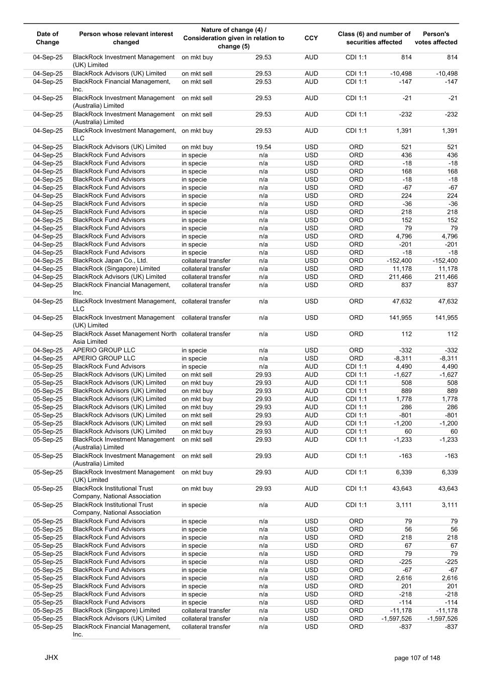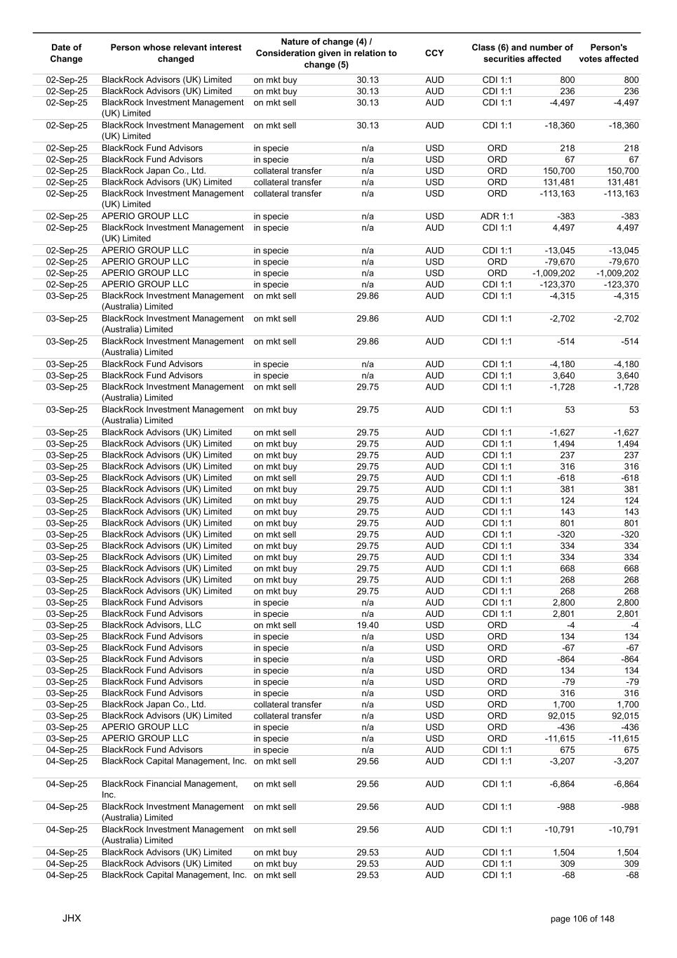 Date of Change Person whose relevant interest changed Nature of change (4) / Consideration given in relation to change (5) Class (6) and number of securities affected Person's votes affected CCY 05-Sep-25 BlackRock Investment Management, LLC collateral transfer n/a USD ORD -47,632 -47,632 05-Sep-25 BlackRock Investment Management (UK) Limited collateral transfer n/a USD ORD -141,955 -141,955 05-Sep-25 BlackRock Asset Management North Asia Limited collateral transfer n/a USD ORD -112 -112 05-Sep-25 APERIO GROUP LLC in specie n/a USD ORD -1,497 -1,497 05-Sep-25 APERIO GROUP LLC in specie n/a USD ORD -12,364 -12,364 07-Sep-25 BlackRock Advisors (UK) Limited collateral transfer n/a USD ORD -67,644 -67,644 08-Sep-25 BlackRock Capital Management, Inc. on mkt sell 30.94 AUD CDI 1:1 -293 -293 08-Sep-25 BlackRock Financial Management, Inc. on mkt sell 30.94 AUD CDI 1:1 -367 -367 08-Sep-25 BlackRock Investment Management (Australia) Limited on mkt buy 30.92 AUD CDI 1:1 6,336 6,336 08-Sep-25 BlackRock Investment Management (Australia) Limited on mkt buy 30.92 AUD CDI 1:1 2,064 2,064 08-Sep-25 BlackRock Advisors (UK) Limited on mkt buy 30.92 AUD CDI 1:1 1,505 1,505 08-Sep-25 BlackRock Advisors (UK) Limited on mkt sell 30.92 AUD CDI 1:1 -207 -207 08-Sep-25 BlackRock Investment Management (UK) Limited on mkt buy 30.92 AUD CDI 1:1 21,786 21,786 08-Sep-25 BlackRock Capital Management, Inc. on mkt sell 30.92 AUD CDI 1:1 -498 -498 08-Sep-25 BlackRock Financial Management, Inc. on mkt sell 30.92 AUD CDI 1:1 -629 -629 08-Sep-25 BlackRock Financial Management, Inc. in specie n/a AUD CDI 1:1 107,889 107,889 08-Sep-25 BlackRock Fund Advisors in specie n/a USD ORD -90 -90 08-Sep-25 BlackRock Fund Advisors in specie n/a USD ORD 67 67 08-Sep-25 BlackRock Fund Advisors in specie n/a USD ORD 180 180 08-Sep-25 BlackRock Advisors (UK) Limited in specie n/a AUD CDI 1:1 -7,079 -7,079 08-Sep-25 BlackRock Advisors (UK) Limited in specie n/a AUD CDI 1:1 -1,610 -1,610 08-Sep-25 BlackRock (Singapore) Limited collateral transfer n/a USD ORD 2,028 2,028 08-Sep-25 BlackRock Advisors (UK) Limited collateral transfer n/a USD ORD 38 38 08-Sep-25 BlackRock Financial Management, Inc. collateral transfer n/a USD ORD 53,796 53,796 08-Sep-25 BlackRock Investment Management (UK) Limited collateral transfer n/a USD ORD 14,044 14,044 08-Sep-25 APERIO GROUP LLC in specie n/a USD ORD -914 -914 08-Sep-25 APERIO GROUP LLC in specie n/a USD ORD -1,693 -1,693 09-Sep-25 BlackRock Fund Advisors in specie n/a AUD CDI 1:1 41,496 41,496 09-Sep-25 BlackRock Advisors (UK) Limited on mkt sell 30.20 AUD CDI 1:1 -1,627 -1,627 09-Sep-25 BlackRock Advisors (UK) Limited on mkt sell 30.20 AUD CDI 1:1 -3,014 -3,014 09-Sep-25 BlackRock Advisors (UK) Limited on mkt buy 30.20 AUD CDI 1:1 395 395 09-Sep-25 BlackRock Advisors (UK) Limited on mkt buy 30.20 AUD CDI 1:1 316 316 09-Sep-25 BlackRock Advisors (UK) Limited on mkt buy 30.20 AUD CDI 1:1 512 512 09-Sep-25 BlackRock Advisors (UK) Limited on mkt buy 30.20 AUD CDI 1:1 512 512 09-Sep-25 BlackRock Advisors (UK) Limited on mkt buy 30.20 AUD CDI 1:1 640 640 09-Sep-25 BlackRock Fund Advisors in specie n/a USD ORD -134 -134 09-Sep-25 BlackRock Fund Advisors in specie n/a USD ORD 395 395 09-Sep-25 BlackRock Fund Advisors in specie n/a USD ORD -450 -450 09-Sep-25 BlackRock Fund Advisors in specie n/a USD ORD 90 90 09-Sep-25 BlackRock Fund Advisors in specie n/a USD ORD 54 54 09-Sep-25 BlackRock Fund Advisors in specie n/a USD ORD 224 224 09-Sep-25 BlackRock Fund Advisors in specie n/a USD ORD 76 76 09-Sep-25 BlackRock Fund Advisors in specie n/a USD ORD 114 114 09-Sep-25 BlackRock Fund Advisors in specie n/a USD ORD 56 56 09-Sep-25 BlackRock Japan Co., Ltd. collateral transfer n/a USD ORD 46,700 46,700 09-Sep-25 BlackRock (Singapore) Limited collateral transfer n/a USD ORD 169 169 09-Sep-25 BlackRock Advisors (UK) Limited collateral transfer n/a USD ORD -17 -17 09-Sep-25 BlackRock Financial Management, Inc. collateral transfer n/a USD ORD -40 -40 09-Sep-25 BlackRock Investment Management, LLC collateral transfer n/a USD ORD 501 501 09-Sep-25 BlackRock Investment Management (UK) Limited collateral transfer n/a USD ORD -657 -657 09-Sep-25 BlackRock Asset Management North Asia Limited collateral transfer n/a USD ORD 26 26 09-Sep-25 BlackRock Institutional Trust Company, National Association collateral transfer n/a USD ORD 27,426 27,426 09-Sep-25 APERIO GROUP LLC in specie n/a USD ORD -740 -740 09-Sep-25 APERIO GROUP LLC in specie n/a USD ORD -7,768 -7,768 10-Sep-25 BlackRock Fund Advisors in specie n/a AUD CDI 1:1 4,540 4,540 JHX page 108 of 148