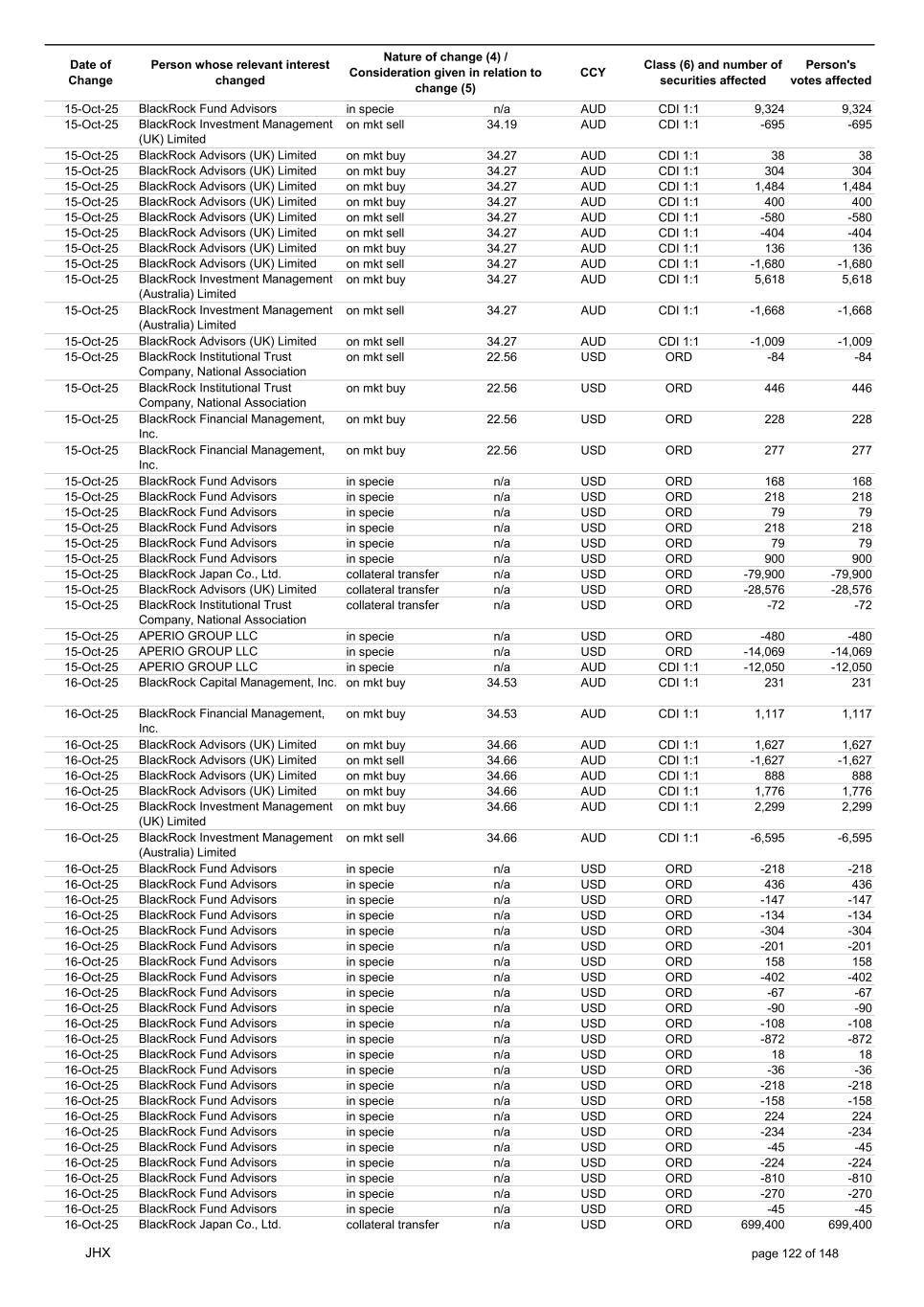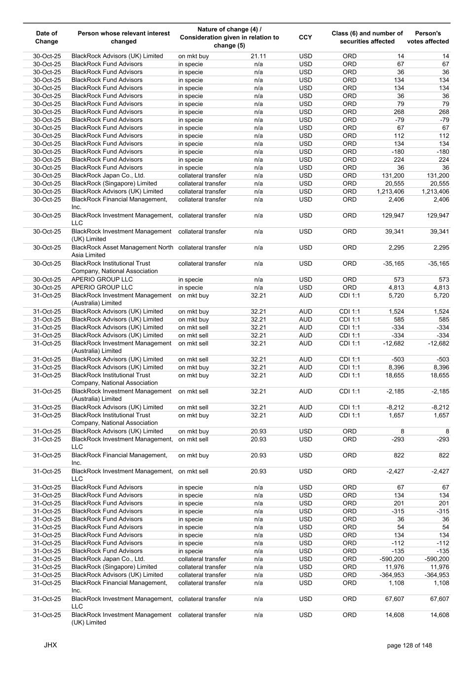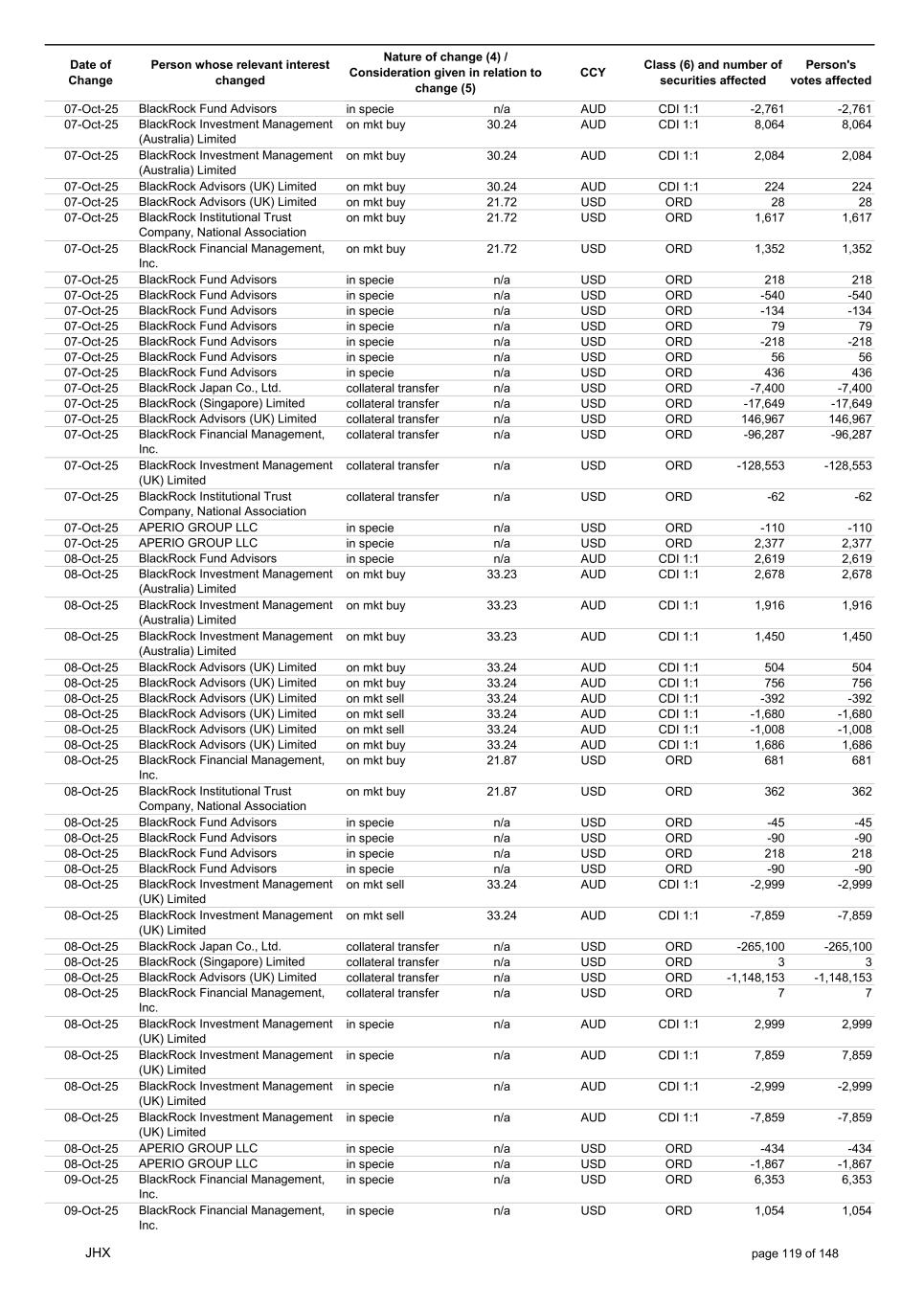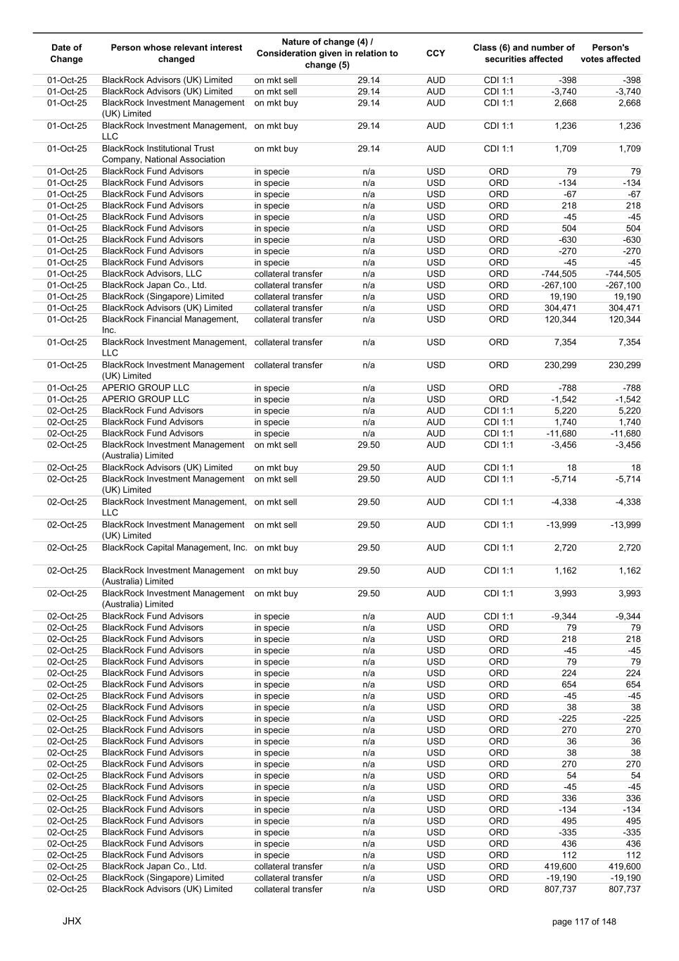 Date of Change Person whose relevant interest changed Nature of change (4) / Consideration given in relation to change (5) Class (6) and number of securities affected Person's votes affected CCY 10-Oct-25 BlackRock Investment Management (UK) Limited collateral transfer n/a USD ORD -35,796 -35,796 10-Oct-25 BlackRock Asset Management North Asia Limited collateral transfer n/a USD ORD 10,519 10,519 10-Oct-25 APERIO GROUP LLC in specie n/a USD ORD -46 -46 10-Oct-25 APERIO GROUP LLC in specie n/a USD ORD 364 364 12-Oct-25 BlackRock (Singapore) Limited collateral transfer n/a USD ORD -6,591 -6,591 12-Oct-25 BlackRock Advisors (UK) Limited collateral transfer n/a USD ORD -1,305,710 -1,305,710 12-Oct-25 BlackRock Financial Management, Inc. collateral transfer n/a USD ORD -619 -619 12-Oct-25 BlackRock Investment Management, LLC collateral transfer n/a USD ORD -30,402 -30,402 12-Oct-25 BlackRock Investment Management (UK) Limited collateral transfer n/a USD ORD -66,429 -66,429 12-Oct-25 BlackRock Asset Management North Asia Limited collateral transfer n/a USD ORD -10,519 -10,519 13-Oct-25 BlackRock Fund Advisors in specie n/a AUD CDI 1:1 -5,550 -5,550 13-Oct-25 BlackRock Capital Management, Inc. on mkt sell 32.81 AUD CDI 1:1 -4,864 -4,864 13-Oct-25 BlackRock Advisors (UK) Limited on mkt buy 32.80 AUD CDI 1:1 76 76 13-Oct-25 BlackRock Advisors (UK) Limited on mkt sell 32.80 AUD CDI 1:1 -5,936 -5,936 13-Oct-25 BlackRock Advisors (UK) Limited on mkt sell 32.80 AUD CDI 1:1 -402 -402 13-Oct-25 BlackRock Advisors (UK) Limited on mkt sell 32.80 AUD CDI 1:1 -3,102 -3,102 13-Oct-25 BlackRock Investment Management (UK) Limited on mkt buy 32.80 AUD CDI 1:1 795 795 13-Oct-25 BlackRock Fund Advisors on mkt buy 21.44 USD ORD 772 772 13-Oct-25 BlackRock Fund Advisors in specie n/a USD ORD 79 79 13-Oct-25 BlackRock Fund Advisors in specie n/a USD ORD 79 79 13-Oct-25 BlackRock Fund Advisors in specie n/a USD ORD -67 -67 13-Oct-25 BlackRock Fund Advisors in specie n/a USD ORD -114 -114 13-Oct-25 BlackRock Fund Advisors in specie n/a USD ORD 67 67 13-Oct-25 BlackRock Fund Advisors in specie n/a USD ORD -36 -36 13-Oct-25 BlackRock Fund Advisors in specie n/a USD ORD -56 -56 13-Oct-25 BlackRock Advisors (UK) Limited collateral transfer n/a USD ORD 9,999 9,999 13-Oct-25 BlackRock Investment Management, LLC collateral transfer n/a USD ORD 6,156 6,156 13-Oct-25 BlackRock Investment Management (UK) Limited collateral transfer n/a USD ORD 456,774 456,774 13-Oct-25 APERIO GROUP LLC in specie n/a USD ORD -107 -107 13-Oct-25 APERIO GROUP LLC in specie n/a USD ORD -106 -106 14-Oct-25 BlackRock Fund Advisors in specie n/a AUD CDI 1:1 -5,872 -5,872 14-Oct-25 BlackRock Advisors (UK) Limited on mkt buy 32.50 AUD CDI 1:1 1,484 1,484 14-Oct-25 BlackRock Advisors (UK) Limited on mkt buy 32.50 AUD CDI 1:1 1,484 1,484 14-Oct-25 BlackRock Advisors (UK) Limited on mkt sell 32.50 AUD CDI 1:1 -199 -199 14-Oct-25 BlackRock Institutional Trust Company, National Association on mkt sell 32.50 AUD CDI 1:1 -16,455 -16,455 14-Oct-25 BlackRock Japan Co., Ltd. on mkt sell 32.50 AUD CDI 1:1 -3,472 -3,472 14-Oct-25 BlackRock Investment Management (UK) Limited on mkt buy 32.50 AUD CDI 1:1 45,045 45,045 14-Oct-25 BlackRock Advisors (UK) Limited on mkt buy 22.41 USD ORD 24 24 14-Oct-25 BlackRock Fund Advisors in specie n/a USD ORD -147 -147 14-Oct-25 BlackRock Fund Advisors in specie n/a USD ORD 218 218 14-Oct-25 BlackRock Fund Advisors in specie n/a USD ORD 134 134 14-Oct-25 BlackRock Fund Advisors in specie n/a USD ORD 79 79 14-Oct-25 BlackRock Fund Advisors in specie n/a USD ORD 79 79 14-Oct-25 BlackRock Fund Advisors in specie n/a USD ORD 79 79 14-Oct-25 BlackRock Fund Advisors in specie n/a USD ORD -45 -45 14-Oct-25 BlackRock Fund Advisors in specie n/a USD ORD 18 18 14-Oct-25 BlackRock Fund Advisors in specie n/a USD ORD 79 79 14-Oct-25 BlackRock Fund Advisors in specie n/a USD ORD 90 90 14-Oct-25 BlackRock Fund Advisors in specie n/a USD ORD 36 36 14-Oct-25 BlackRock Japan Co., Ltd. collateral transfer n/a USD ORD 79,900 79,900 14-Oct-25 BlackRock Advisors (UK) Limited collateral transfer n/a USD ORD 1,365,923 1,365,923 14-Oct-25 BlackRock Investment Management, LLC collateral transfer n/a USD ORD -6,156 -6,156 14-Oct-25 BlackRock Investment Management (UK) Limited collateral transfer n/a USD ORD -456,774 -456,774 14-Oct-25 BlackRock Institutional Trust Company, National Association collateral transfer n/a USD ORD 72 72 14-Oct-25 APERIO GROUP LLC in specie n/a USD ORD -8 -8 14-Oct-25 APERIO GROUP LLC in specie n/a USD ORD 1,800 1,800 15-Oct-25 BlackRock Fund Advisors in specie n/a AUD CDI 1:1 -2,171 -2,171 15-Oct-25 BlackRock Fund Advisors in specie n/a AUD CDI 1:1 -102 -102 JHX page 121 of 148