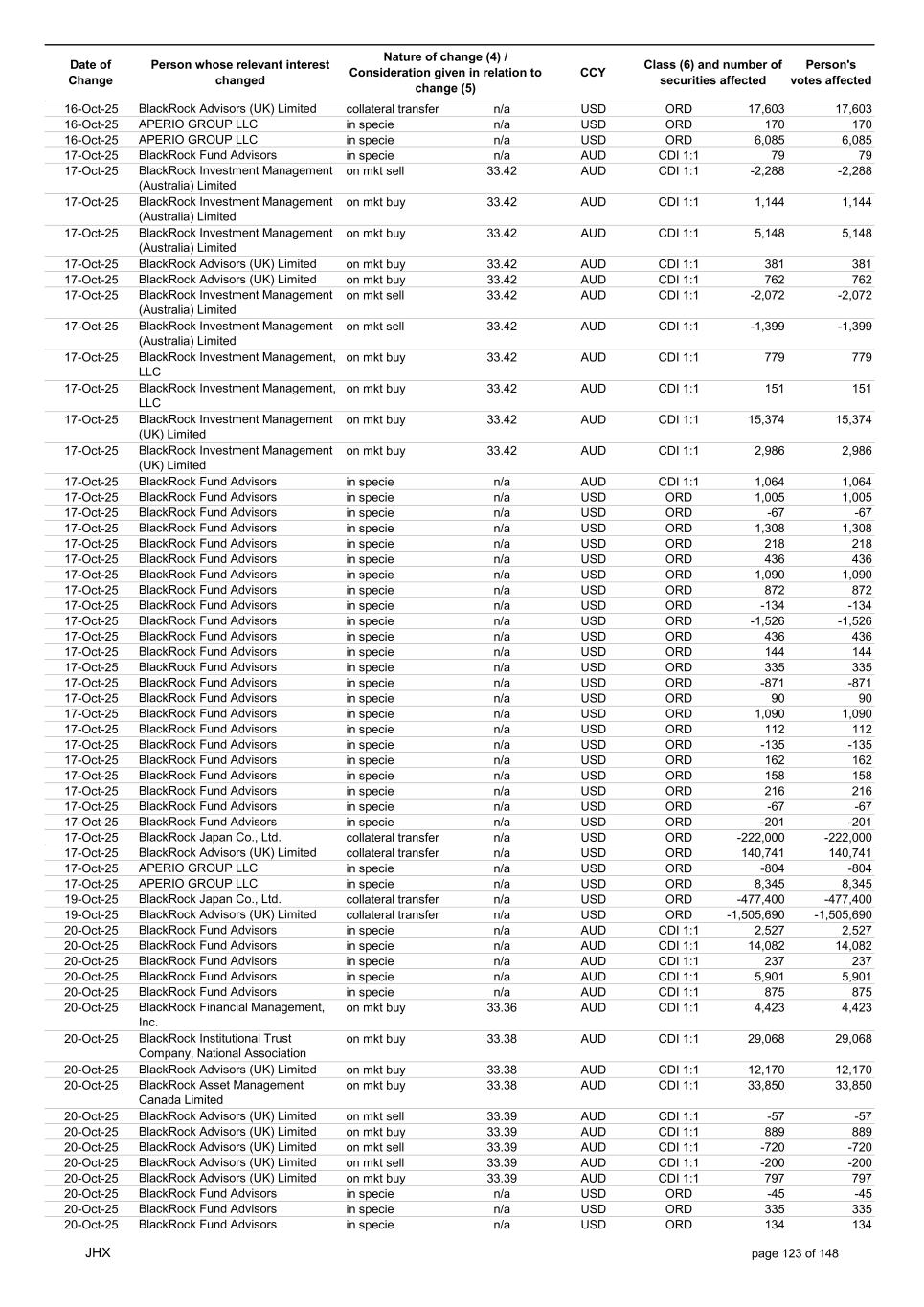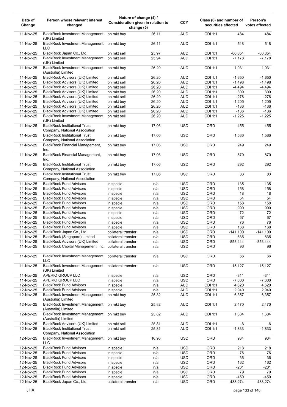 Date of Change Person whose relevant interest changed Nature of change (4) / Consideration given in relation to change (5) Class (6) and number of securities affected Person's votes affected CCY 22-Oct-25 APERIO GROUP LLC in specie n/a USD ORD -307 -307 22-Oct-25 APERIO GROUP LLC in specie n/a USD ORD -1,251 -1,251 23-Oct-25 BlackRock Institutional Trust Company, National Association in specie n/a AUD CDI 1:1 13,778 13,778 23-Oct-25 BlackRock Fund Advisors in specie n/a AUD CDI 1:1 1,580 1,580 23-Oct-25 BlackRock Capital Management, Inc. on mkt sell 33.37 AUD CDI 1:1 -1,502 -1,502 23-Oct-25 BlackRock Investment Management (Australia) Limited on mkt sell 33.37 AUD CDI 1:1 -408 -408 23-Oct-25 BlackRock Investment Management (Australia) Limited on mkt sell 33.37 AUD CDI 1:1 -7,879 -7,879 23-Oct-25 BlackRock Advisors (UK) Limited on mkt buy 33.41 AUD CDI 1:1 2,968 2,968 23-Oct-25 BlackRock Institutional Trust Company, National Association on mkt sell 33.41 AUD CDI 1:1 -30,356 -30,356 23-Oct-25 BlackRock Japan Co., Ltd. on mkt sell 33.41 AUD CDI 1:1 -6,483 -6,483 23-Oct-25 BlackRock Financial Management, Inc. on mkt sell 33.41 AUD CDI 1:1 -6,844 -6,844 23-Oct-25 BlackRock Financial Management, Inc. on mkt buy 33.41 AUD CDI 1:1 1,194 1,194 23-Oct-25 BlackRock Institutional Trust Company, National Association on mkt buy 33.41 AUD CDI 1:1 6,029 6,029 23-Oct-25 BlackRock Fund Advisors in specie n/a USD ORD -436 -436 23-Oct-25 BlackRock Fund Advisors in specie n/a USD ORD -134 -134 23-Oct-25 BlackRock Fund Advisors in specie n/a USD ORD -180 -180 23-Oct-25 BlackRock Fund Advisors in specie n/a USD ORD 135 135 23-Oct-25 BlackRock Fund Advisors in specie n/a USD ORD 79 79 23-Oct-25 BlackRock Fund Advisors in specie n/a USD ORD 112 112 23-Oct-25 BlackRock Fund Advisors in specie n/a USD ORD 18 18 23-Oct-25 BlackRock Fund Advisors in specie n/a USD ORD -2,616 -2,616 23-Oct-25 BlackRock Fund Advisors in specie n/a USD ORD 79 79 23-Oct-25 BlackRock Fund Advisors in specie n/a USD ORD -218 -218 23-Oct-25 BlackRock Fund Advisors in specie n/a USD ORD -342 -342 23-Oct-25 BlackRock Fund Advisors in specie n/a USD ORD 45 45 23-Oct-25 BlackRock Fund Advisors in specie n/a USD ORD 54 54 23-Oct-25 BlackRock Japan Co., Ltd. collateral transfer n/a USD ORD -474,700 -474,700 23-Oct-25 BlackRock Advisors (UK) Limited collateral transfer n/a USD ORD -641,916 -641,916 23-Oct-25 BlackRock Investment Management (UK) Limited collateral transfer n/a USD ORD 1,096,753 1,096,753 23-Oct-25 APERIO GROUP LLC in specie n/a USD ORD -110 -110 23-Oct-25 APERIO GROUP LLC in specie n/a USD ORD -3,637 -3,637 24-Oct-25 BlackRock Fund Advisors in specie n/a AUD CDI 1:1 1,056 1,056 24-Oct-25 BlackRock Investment Management (Australia) Limited on mkt sell 34.14 AUD CDI 1:1 -936 -936 24-Oct-25 BlackRock Investment Management (Australia) Limited on mkt sell 34.14 AUD CDI 1:1 -199 -199 24-Oct-25 BlackRock Investment Management (Australia) Limited on mkt buy 34.13 AUD CDI 1:1 1,144 1,144 24-Oct-25 BlackRock Investment Management (Australia) Limited on mkt buy 34.13 AUD CDI 1:1 5,720 5,720 24-Oct-25 BlackRock Advisors (UK) Limited on mkt buy 34.13 AUD CDI 1:1 1,484 1,484 24-Oct-25 BlackRock Advisors (UK) Limited on mkt buy 34.13 AUD CDI 1:1 1,008 1,008 24-Oct-25 BlackRock Advisors (UK) Limited on mkt buy 34.13 AUD CDI 1:1 378 378 24-Oct-25 BlackRock Advisors (UK) Limited on mkt sell 34.13 AUD CDI 1:1 -145 -145 24-Oct-25 BlackRock Advisors (UK) Limited on mkt sell 34.13 AUD CDI 1:1 -1,665 -1,665 24-Oct-25 BlackRock Advisors (UK) Limited on mkt sell 34.13 AUD CDI 1:1 -1,665 -1,665 24-Oct-25 BlackRock Advisors (UK) Limited on mkt sell 34.13 AUD CDI 1:1 -333 -333 24-Oct-25 BlackRock Investment Management (UK) Limited on mkt sell 34.13 AUD CDI 1:1 -1,863 -1,863 24-Oct-25 BlackRock Investment Management (Australia) Limited on mkt sell 34.13 AUD CDI 1:1 -11,789 -11,789 24-Oct-25 BlackRock Investment Management (Australia) Limited on mkt sell 34.13 AUD CDI 1:1 -2,506 -2,506 24-Oct-25 BlackRock Investment Management (UK) Limited on mkt sell 34.13 AUD CDI 1:1 -23,448 -23,448 24-Oct-25 BlackRock Fund Advisors in specie n/a AUD CDI 1:1 2,534 2,534 24-Oct-25 BlackRock Fund Advisors in specie n/a USD ORD 560 560 24-Oct-25 BlackRock Fund Advisors in specie n/a USD ORD -114 -114 24-Oct-25 BlackRock Fund Advisors in specie n/a USD ORD 36 36 24-Oct-25 BlackRock Fund Advisors in specie n/a USD ORD 1,323 1,323 24-Oct-25 BlackRock Fund Advisors in specie n/a USD ORD 45 45 24-Oct-25 BlackRock Fund Advisors in specie n/a USD ORD 336 336 24-Oct-25 BlackRock Japan Co., Ltd. collateral transfer n/a USD ORD 291,000 291,000 24-Oct-25 BlackRock (Singapore) Limited collateral transfer n/a USD ORD 3,535 3,535 JHX page 125 of 148
