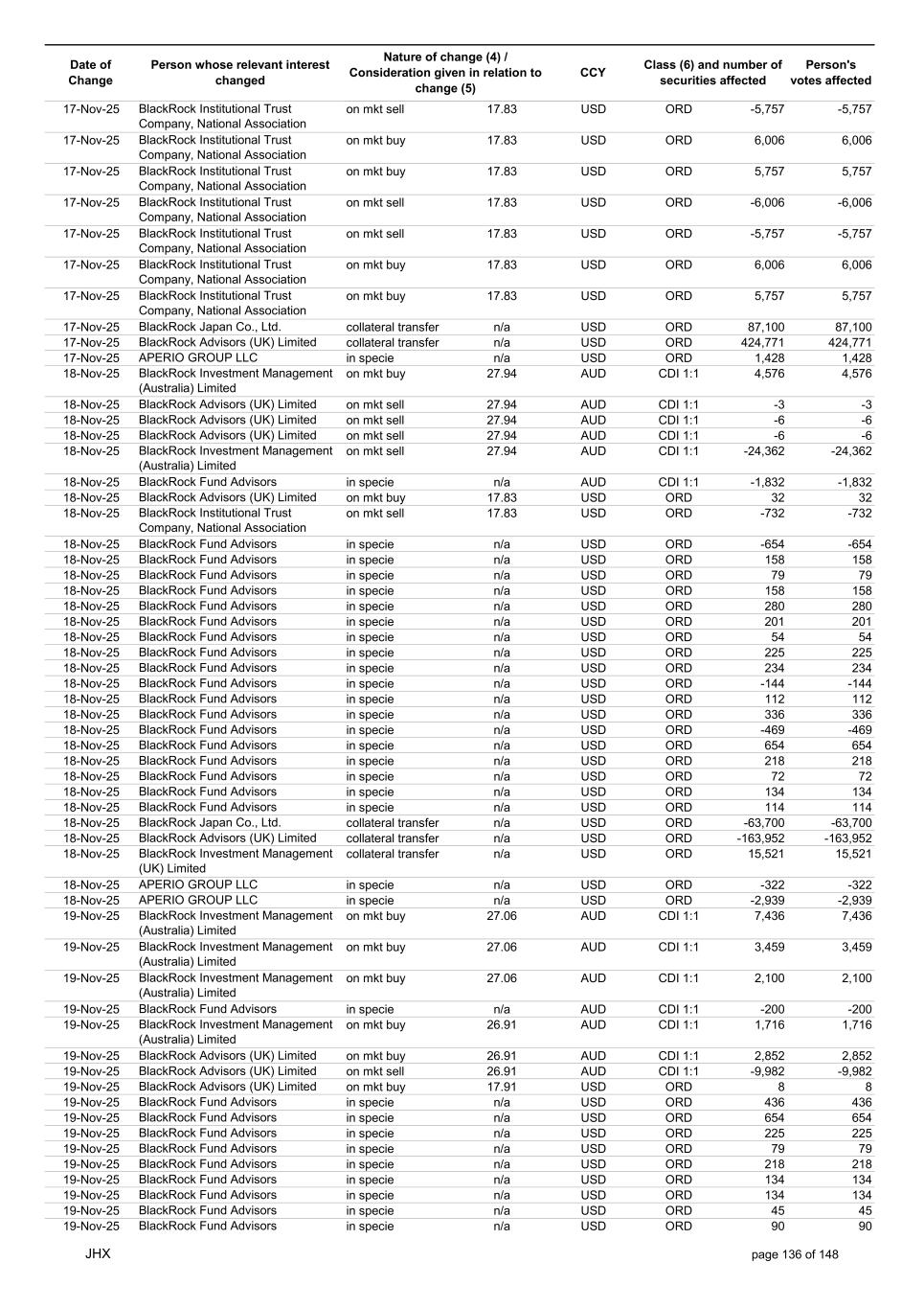 Date of Change Person whose relevant interest changed Nature of change (4) / Consideration given in relation to change (5) Class (6) and number of securities affected Person's votes affected CCY 05-Nov-25 BlackRock Investment Management (UK) Limited collateral transfer n/a USD ORD -56,454 -56,454 05-Nov-25 BlackRock Asset Management North Asia Limited collateral transfer n/a USD ORD 141,451 141,451 05-Nov-25 APERIO GROUP LLC in specie n/a USD ORD 421 421 05-Nov-25 APERIO GROUP LLC in specie n/a USD ORD 4,056 4,056 06-Nov-25 BlackRock Advisors (UK) Limited on mkt buy 25.75 AUD CDI 1:1 78 78 06-Nov-25 BlackRock Advisors (UK) Limited on mkt buy 25.75 AUD CDI 1:1 1,320 1,320 06-Nov-25 BlackRock Advisors (UK) Limited on mkt sell 25.75 AUD CDI 1:1 -668 -668 06-Nov-25 BlackRock Japan Co., Ltd. on mkt sell 25.75 AUD CDI 1:1 -1,164 -1,164 06-Nov-25 BlackRock Japan Co., Ltd. on mkt sell 25.75 AUD CDI 1:1 -2,813 -2,813 06-Nov-25 BlackRock Financial Management, Inc. on mkt buy 25.75 AUD CDI 1:1 733 733 06-Nov-25 BlackRock Financial Management, Inc. on mkt buy 25.75 AUD CDI 1:1 447 447 06-Nov-25 BlackRock Investment Management (UK) Limited on mkt buy 25.75 AUD CDI 1:1 738 738 06-Nov-25 BlackRock Investment Management (Australia) Limited on mkt buy 25.75 AUD CDI 1:1 1,406 1,406 06-Nov-25 BlackRock Investment Management (Australia) Limited on mkt buy 25.75 AUD CDI 1:1 3,733 3,733 06-Nov-25 BlackRock Investment Management (Australia) Limited on mkt buy 25.75 AUD CDI 1:1 6,132 6,132 06-Nov-25 BlackRock Advisors, LLC on mkt sell 17.34 USD ORD -10 -10 06-Nov-25 BlackRock Institutional Trust Company, National Association on mkt buy 17.34 USD ORD 1,653 1,653 06-Nov-25 BlackRock Financial Management, Inc. on mkt buy 17.34 USD ORD 969 969 06-Nov-25 BlackRock Financial Management, Inc. on mkt buy 17.34 USD ORD 921 921 06-Nov-25 BlackRock Fund Advisors in specie n/a USD ORD 54 54 06-Nov-25 BlackRock Fund Advisors in specie n/a USD ORD -67 -67 06-Nov-25 BlackRock Fund Advisors in specie n/a USD ORD -218 -218 06-Nov-25 BlackRock Fund Advisors in specie n/a USD ORD 36 36 06-Nov-25 BlackRock Fund Advisors in specie n/a USD ORD 79 79 06-Nov-25 BlackRock Fund Advisors in specie n/a USD ORD 54 54 06-Nov-25 BlackRock Fund Advisors in specie n/a USD ORD -76 -76 06-Nov-25 BlackRock Fund Advisors in specie n/a USD ORD 79 79 06-Nov-25 BlackRock Japan Co., Ltd. collateral transfer n/a USD ORD -429,400 -429,400 06-Nov-25 BlackRock (Singapore) Limited collateral transfer n/a USD ORD -107,727 -107,727 06-Nov-25 BlackRock Advisors (UK) Limited collateral transfer n/a USD ORD 1,160,015 1,160,015 06-Nov-25 BlackRock Financial Management, Inc. collateral transfer n/a USD ORD -14,126 -14,126 06-Nov-25 BlackRock Investment Management, LLC collateral transfer n/a USD ORD -457,167 -457,167 06-Nov-25 BlackRock Investment Management (UK) Limited collateral transfer n/a USD ORD -721,345 -721,345 06-Nov-25 BlackRock Asset Management North Asia Limited collateral transfer n/a USD ORD -145,536 -145,536 06-Nov-25 BlackRock Institutional Trust Company, National Association collateral transfer n/a USD ORD 70,767 70,767 06-Nov-25 APERIO GROUP LLC in specie n/a USD ORD -106 -106 06-Nov-25 APERIO GROUP LLC in specie n/a USD ORD -1,565 -1,565 07-Nov-25 BlackRock Fund Advisors in specie n/a AUD CDI 1:1 8,100 8,100 07-Nov-25 BlackRock Investment Management (Australia) Limited on mkt buy 26.11 AUD CDI 1:1 10,321 10,321 07-Nov-25 BlackRock Investment Management (Australia) Limited on mkt buy 26.11 AUD CDI 1:1 6,345 6,345 07-Nov-25 BlackRock Investment Management (Australia) Limited on mkt buy 26.11 AUD CDI 1:1 1,805 1,805 07-Nov-25 BlackRock Advisors (UK) Limited on mkt buy 26.12 AUD CDI 1:1 2,984 2,984 07-Nov-25 BlackRock Advisors (UK) Limited on mkt buy 26.12 AUD CDI 1:1 1,566 1,566 07-Nov-25 BlackRock Advisors (UK) Limited on mkt buy 26.12 AUD CDI 1:1 910 910 07-Nov-25 BlackRock Advisors (UK) Limited on mkt sell 26.12 AUD CDI 1:1 -639 -639 07-Nov-25 BlackRock Advisors (UK) Limited on mkt sell 26.12 AUD CDI 1:1 -1,675 -1,675 07-Nov-25 BlackRock Advisors (UK) Limited on mkt sell 26.12 AUD CDI 1:1 -1,005 -1,005 07-Nov-25 BlackRock Advisors (UK) Limited on mkt sell 26.12 AUD CDI 1:1 -327 -327 07-Nov-25 BlackRock Investment Management (Australia) Limited on mkt buy 26.12 AUD CDI 1:1 814 814 07-Nov-25 BlackRock Investment Management (Australia) Limited on mkt buy 26.12 AUD CDI 1:1 499 499 07-Nov-25 BlackRock Investment Management (Australia) Limited on mkt buy 26.12 AUD CDI 1:1 142 142 JHX page 131 of 148
