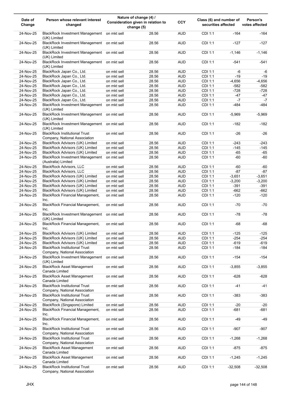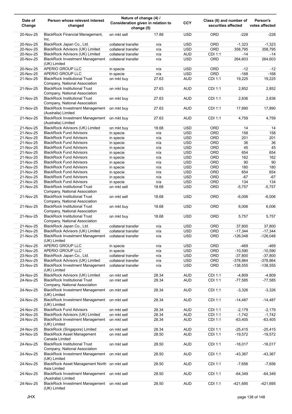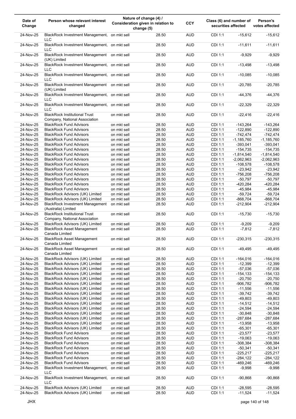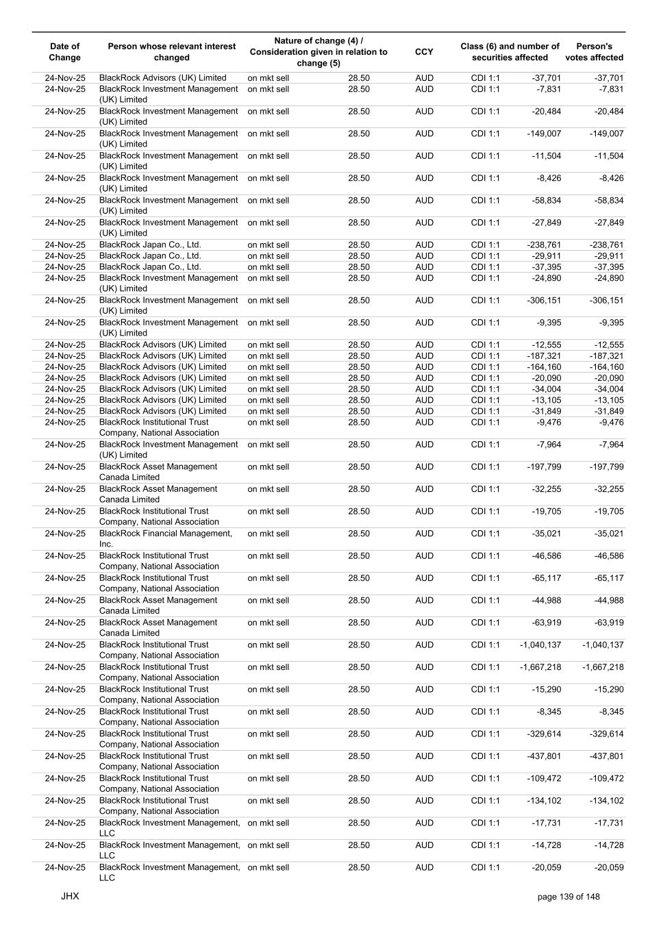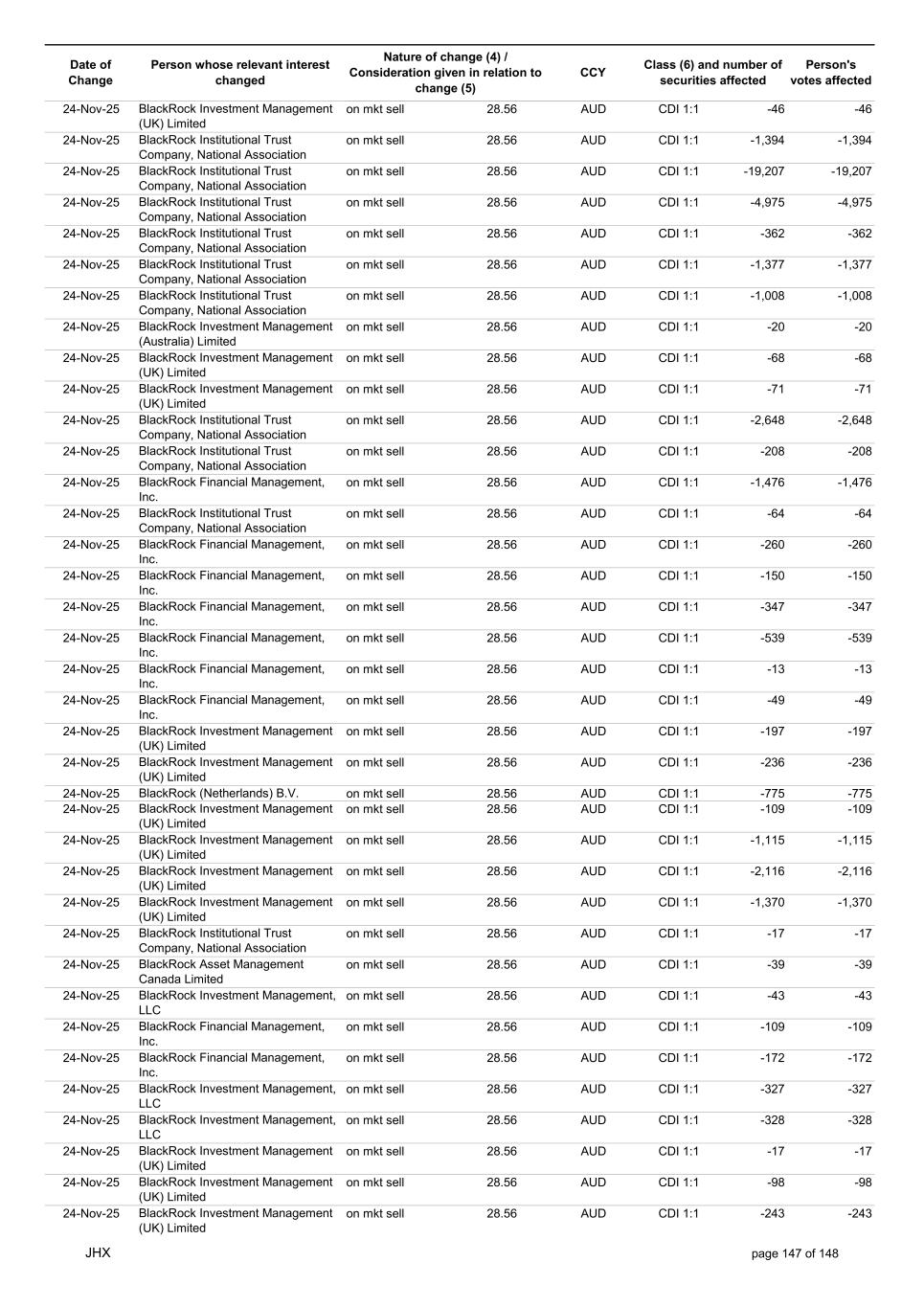 Date of Change Person whose relevant interest changed Nature of change (4) / Consideration given in relation to change (5) Class (6) and number of securities affected Person's votes affected CCY 24-Nov-25 BlackRock Institutional Trust Company, National Association on mkt sell 28.50 AUD CDI 1:1 -8,789 -8,789 24-Nov-25 BlackRock Institutional Trust Company, National Association on mkt sell 28.50 AUD CDI 1:1 -8,801 -8,801 24-Nov-25 BlackRock Institutional Trust Company, National Association on mkt sell 28.50 AUD CDI 1:1 -40,569 -40,569 24-Nov-25 BlackRock Institutional Trust Company, National Association on mkt sell 28.50 AUD CDI 1:1 -26,303 -26,303 24-Nov-25 BlackRock Fund Advisors on mkt sell 28.50 AUD CDI 1:1 -37,009 -37,009 24-Nov-25 BlackRock Advisors, LLC on mkt sell 28.50 AUD CDI 1:1 -211,685 -211,685 24-Nov-25 BlackRock Advisors, LLC on mkt sell 28.50 AUD CDI 1:1 -152,830 -152,830 24-Nov-25 BlackRock Japan Co., Ltd. on mkt sell 28.50 AUD CDI 1:1 -9,848 -9,848 24-Nov-25 BlackRock Institutional Trust Company, National Association on mkt sell 28.50 AUD CDI 1:1 -985,133 -985,133 24-Nov-25 BlackRock Institutional Trust Company, National Association on mkt sell 28.50 AUD CDI 1:1 -71,547 -71,547 24-Nov-25 BlackRock Institutional Trust Company, National Association on mkt sell 28.50 AUD CDI 1:1 -18,617 -18,617 24-Nov-25 BlackRock Institutional Trust Company, National Association on mkt sell 28.50 AUD CDI 1:1 -255,126 -255,126 24-Nov-25 BlackRock Institutional Trust Company, National Association on mkt sell 28.50 AUD CDI 1:1 -70,743 -70,743 24-Nov-25 BlackRock Institutional Trust Company, National Association on mkt sell 28.50 AUD CDI 1:1 -51,774 -51,774 24-Nov-25 BlackRock Institutional Trust Company, National Association on mkt sell 28.50 AUD CDI 1:1 -135,876 -135,876 24-Nov-25 BlackRock Institutional Trust Company, National Association on mkt sell 28.50 AUD CDI 1:1 -10,706 -10,706 24-Nov-25 BlackRock Financial Management, Inc. on mkt sell 28.50 AUD CDI 1:1 -75,801 -75,801 24-Nov-25 BlackRock Financial Management, Inc. on mkt sell 28.50 AUD CDI 1:1 -13,354 -13,354 24-Nov-25 BlackRock Financial Management, Inc. on mkt sell 28.50 AUD CDI 1:1 -7,730 -7,730 24-Nov-25 BlackRock Financial Management, Inc. on mkt sell 28.50 AUD CDI 1:1 -17,853 -17,853 24-Nov-25 BlackRock Financial Management, Inc. on mkt sell 28.50 AUD CDI 1:1 -27,707 -27,707 24-Nov-25 BlackRock Investment Management (UK) Limited on mkt sell 28.50 AUD CDI 1:1 -10,112 -10,112 24-Nov-25 BlackRock Investment Management (UK) Limited on mkt sell 28.50 AUD CDI 1:1 -12,201 -12,201 24-Nov-25 BlackRock (Netherlands) B.V. on mkt sell 28.50 AUD CDI 1:1 -39,840 -39,840 24-Nov-25 BlackRock Investment Management (UK) Limited on mkt sell 28.50 AUD CDI 1:1 -57,258 -57,258 24-Nov-25 BlackRock Investment Management (UK) Limited on mkt sell 28.50 AUD CDI 1:1 -108,589 -108,589 24-Nov-25 BlackRock Investment Management (UK) Limited on mkt sell 28.50 AUD CDI 1:1 -70,378 -70,378 24-Nov-25 BlackRock Financial Management, Inc. on mkt sell 28.50 AUD CDI 1:1 -8,894 -8,894 24-Nov-25 BlackRock Investment Management, LLC on mkt sell 28.50 AUD CDI 1:1 -16,795 -16,795 24-Nov-25 BlackRock Investment Management, LLC on mkt sell 28.50 AUD CDI 1:1 -16,851 -16,851 24-Nov-25 BlackRock Investment Management (UK) Limited on mkt sell 28.50 AUD CDI 1:1 -12,565 -12,565 24-Nov-25 BlackRock Investment Management (UK) Limited on mkt sell 28.50 AUD CDI 1:1 -11,715 -11,715 24-Nov-25 BlackRock Investment Management (UK) Limited on mkt sell 28.50 AUD CDI 1:1 -18,132 -18,132 24-Nov-25 BlackRock Institutional Trust Company, National Association on mkt sell 28.50 AUD CDI 1:1 -38,240 -38,240 24-Nov-25 BlackRock Institutional Trust Company, National Association on mkt sell 28.50 AUD CDI 1:1 -1,506,776 -1,506,776 24-Nov-25 BlackRock Fund Advisors on mkt sell 28.50 AUD CDI 1:1 -557,587 -557,587 24-Nov-25 BlackRock Fund Advisors on mkt sell 28.50 AUD CDI 1:1 -41,076 -41,076 24-Nov-25 BlackRock Asset Management Canada Limited on mkt sell 28.50 AUD CDI 1:1 -43,144 -43,144 24-Nov-25 BlackRock Investment Management (UK) Limited on mkt sell 28.50 AUD CDI 1:1 -1,201 -1,201 24-Nov-25 BlackRock Investment Management (UK) Limited on mkt sell 28.50 AUD CDI 1:1 -2,684 -2,684 JHX page 141 of 148