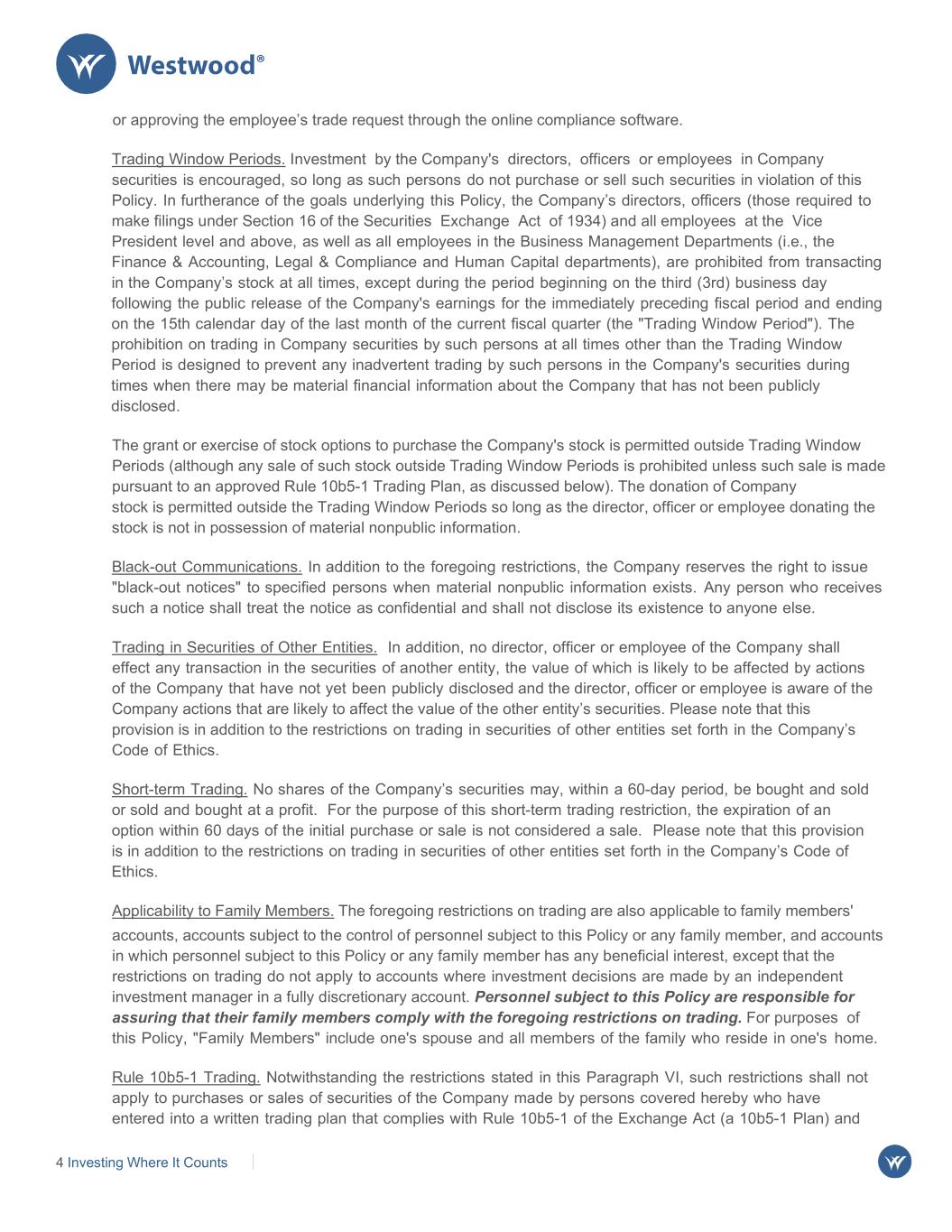 5 Investing Where It Counts has been approved by the General Counsel. Employees at the Senior Vice President level and above, those officers of the Company required to make filings under Section 16 of the Securities Exchange Act of 1934, and those employees specifically approved by the CEO are allowed to enter into a 10b5-1 Plan, so long as: ● The 10b5-1 Plan is executed within a Trading Window Period, the employee is not subject to a black- out on trading in WHG, and the employee is not in possession of material nonpublic information about the Company; ● The term of the 10b5-1 Plan lasts for at least six months; and, if the 10b5-1 Plan is canceled prior to the termination date, a new 10b5-1 Plan cannot be executed prior to the canceled 10b5-1 Plan’s original termination date; and ● The 10b5-1 Plan is executed with either of the following approved brokers: Charles Schwab or JP Morgan. VII. INVESTIGATIONS; SUPERVISION Investigations. If any person subject to this Policy has reason to believe that material nonpublic information of the Company has been disclosed to an outside party without authorization, that person is required to report this to the Chief Compliance Officer immediately. If any person subject to this Policy has reason to believe that an insider of the Company or someone outside of the Company has acted, or intends to act, on inside information, that person is required to report this to the Chief Compliance Officer immediately. The Company values the help of Covered Persons who identify potential problems that need to be addressed. Any retaliation against a Covered Person who reports actual or apparent violations of the Policies in good faith is a violation of the Code of Business Conduct (the “Code”). The Company will protect any Covered Persons who raise a concern honestly, but it is a violation of the Code to knowingly or recklessly provide false information, knowingly participate in the wrongdoing, lie to investigators, interfere, or refuse to cooperate with an investigation. Please refer to the Code for further details on Westwood’s Whistleblower Policy. VIII. PENALTIES; SANCTIONS Civil and Criminal Penalties. Potential penalties for insider trading violations include (1) imprisonment for up to 20 years, (2) criminal fines of up to $5 million, (3) civil fines of up to three times the profit gained or loss avoided, and (4) injunctive actions. In addition, punitive damages may be imposed under applicable state laws. Controlling Person Liability. If the Company knows or recklessly disregards the fact that the controlled person was likely to engage in the acts constituting the insider trading violation and fails to take appropriate steps to prevent illegal insider trading, the Company may have “controlling person” liability for a trading violation, with civil penalties of up to the greater of $1 million or three times the profit gained or loss avoided, as well as a criminal penalty of up to $25 million. The civil penalties can extend personal liability to the Company’s directors, officers and other supervisory personnel if they fail to take appropriate steps to prevent insider trading.