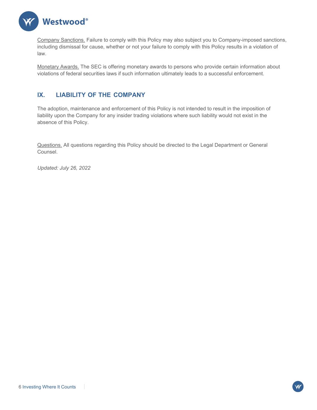 6 Investing Where It Counts Company Sanctions. Failure to comply with this Policy may also subject you to Company-imposed sanctions, including dismissal for cause, whether or not your failure to comply with this Policy results in a violation of law. Monetary Awards. The SEC is offering monetary awards to persons who provide certain information about violations of federal securities laws if such information ultimately leads to a successful enforcement. IX. LIABILITY OF THE COMPANY The adoption, maintenance and enforcement of this Policy is not intended to result in the imposition of liability upon the Company for any insider trading violations where such liability would not exist in the absence of this Policy. Questions. All questions regarding this Policy should be directed to the Legal Department or General Counsel. Updated: July 26, 2022