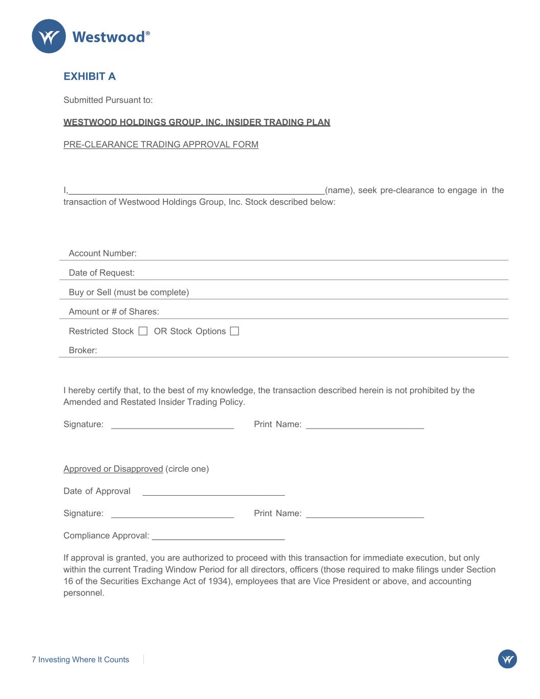 7 Investing Where It Counts EXHIBIT A Submitted Pursuant to: WESTWOOD HOLDINGS GROUP, INC. INSIDER TRADING PLAN PRE-CLEARANCE TRADING APPROVAL FORM I, (name), seek pre-clearance to engage in the transaction of Westwood Holdings Group, Inc. Stock described below: Account Number: Date of Request: Buy or Sell (must be complete) Amount or # of Shares: Restricted Stock OR Stock Options Broker: I hereby certify that, to the best of my knowledge, the transaction described herein is not prohibited by the Amended and Restated Insider Trading Policy. Signature: _________________________ Print Name: ________________________ Approved or Disapproved (circle one) Date of Approval _____________________________ Signature: _________________________ Print Name: ________________________ Compliance Approval: If approval is granted, you are authorized to proceed with this transaction for immediate execution, but only within the current Trading Window Period for all directors, officers (those required to make filings under Section 16 of the Securities Exchange Act of 1934), employees that are Vice President or above, and accounting personnel.