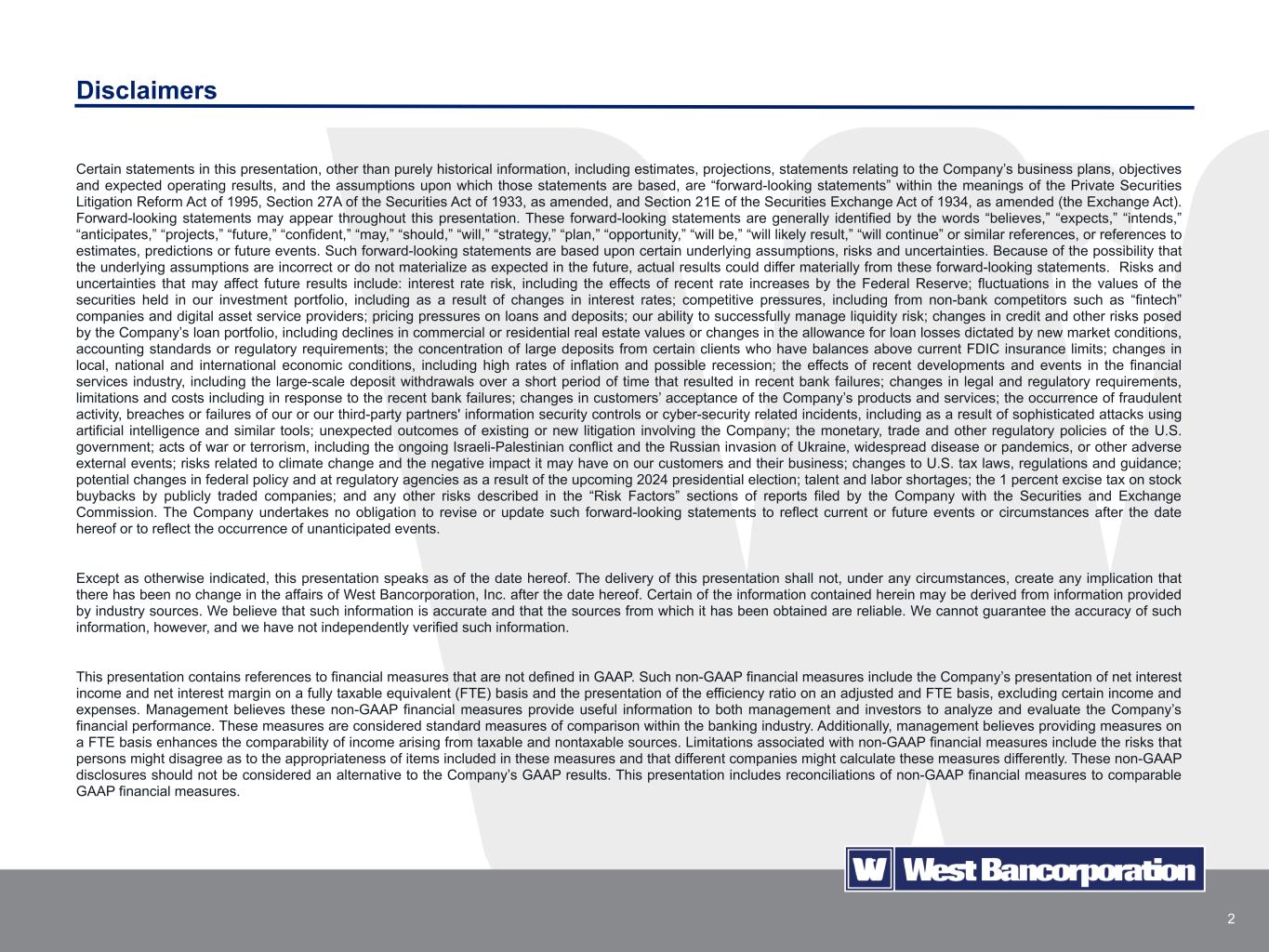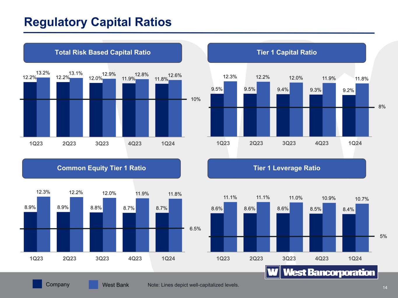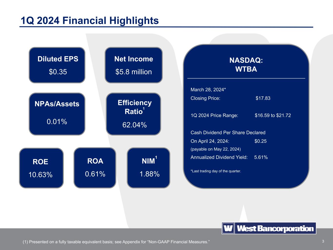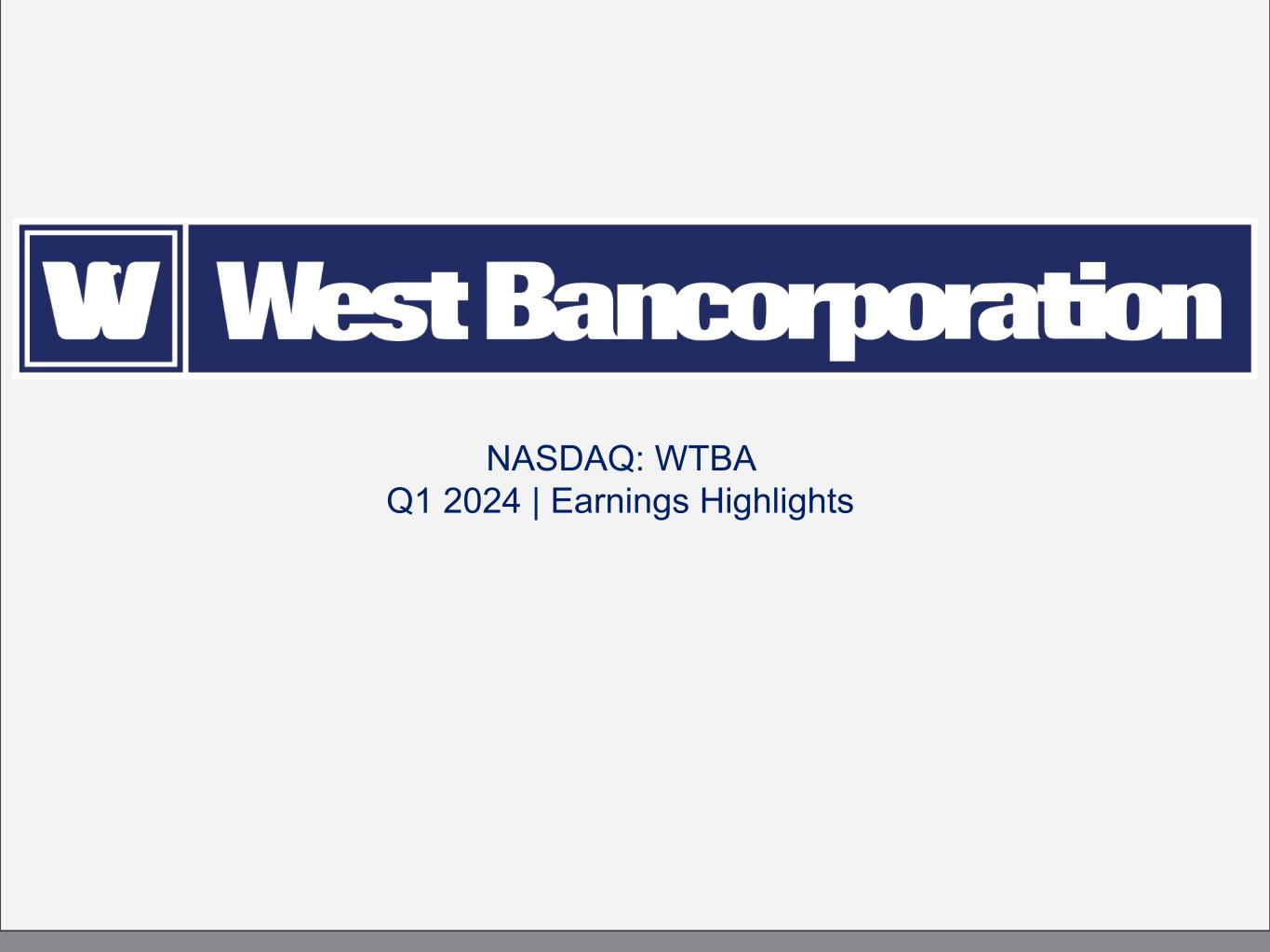 West Des Moines, IA - West Bancorporation, Inc. (Nasdaq: WTBA; the “Company”), parent company of West Bank, today reported first quarter 2024 net income of $5.8 million, or $0.35 per diluted common share, compared to fourth quarter 2023 net income of $4.5 million, or $0.27 per diluted common share, and first quarter 2023 net income of $7.8 million, or $0.47 per diluted common share. On April 24, 2024, the Company’s Board of Directors declared a regular quarterly dividend of $0.25 per common share. The dividend is payable on May 22, 2024, to stockholders of record on May 8, 2024.